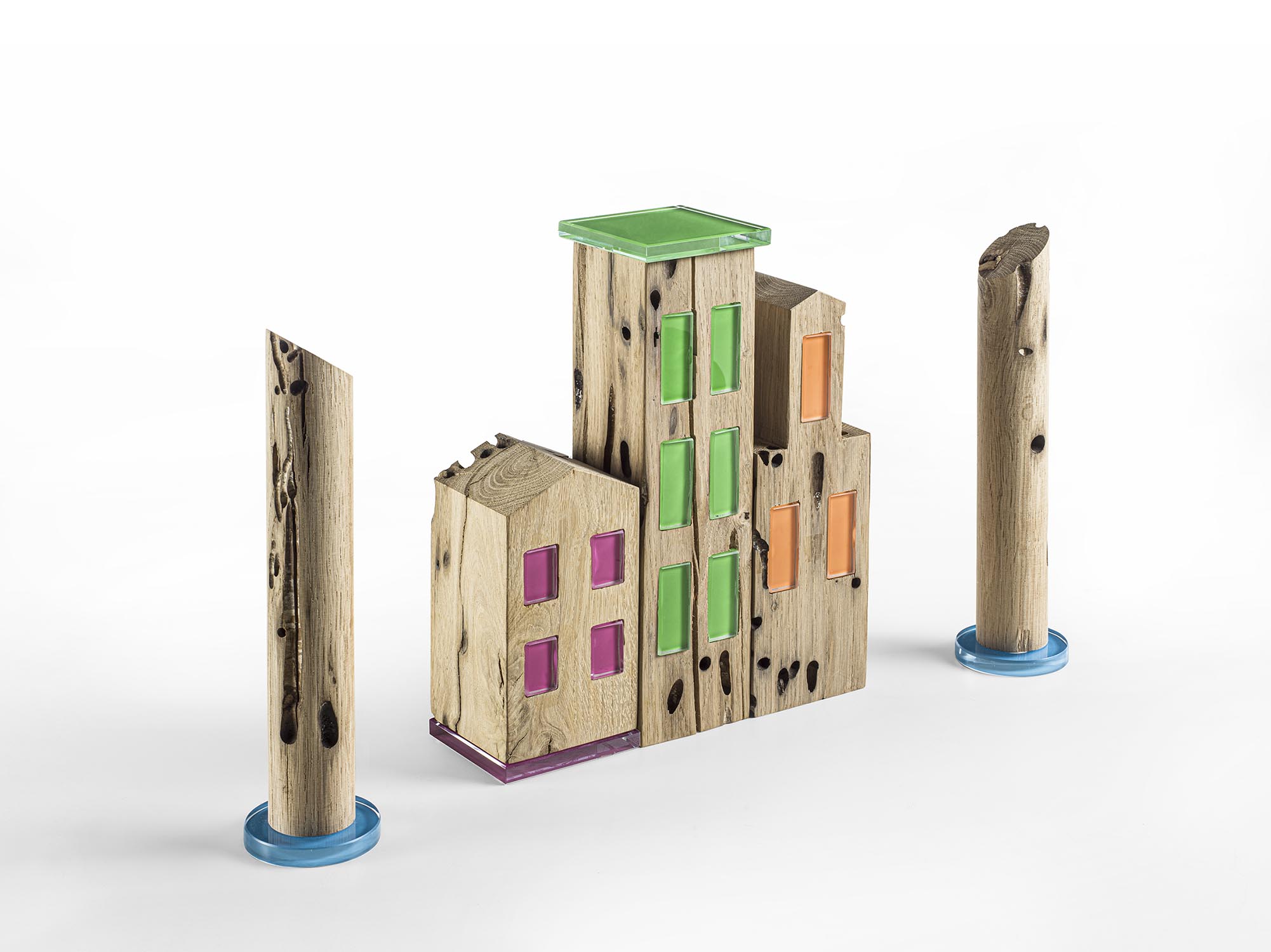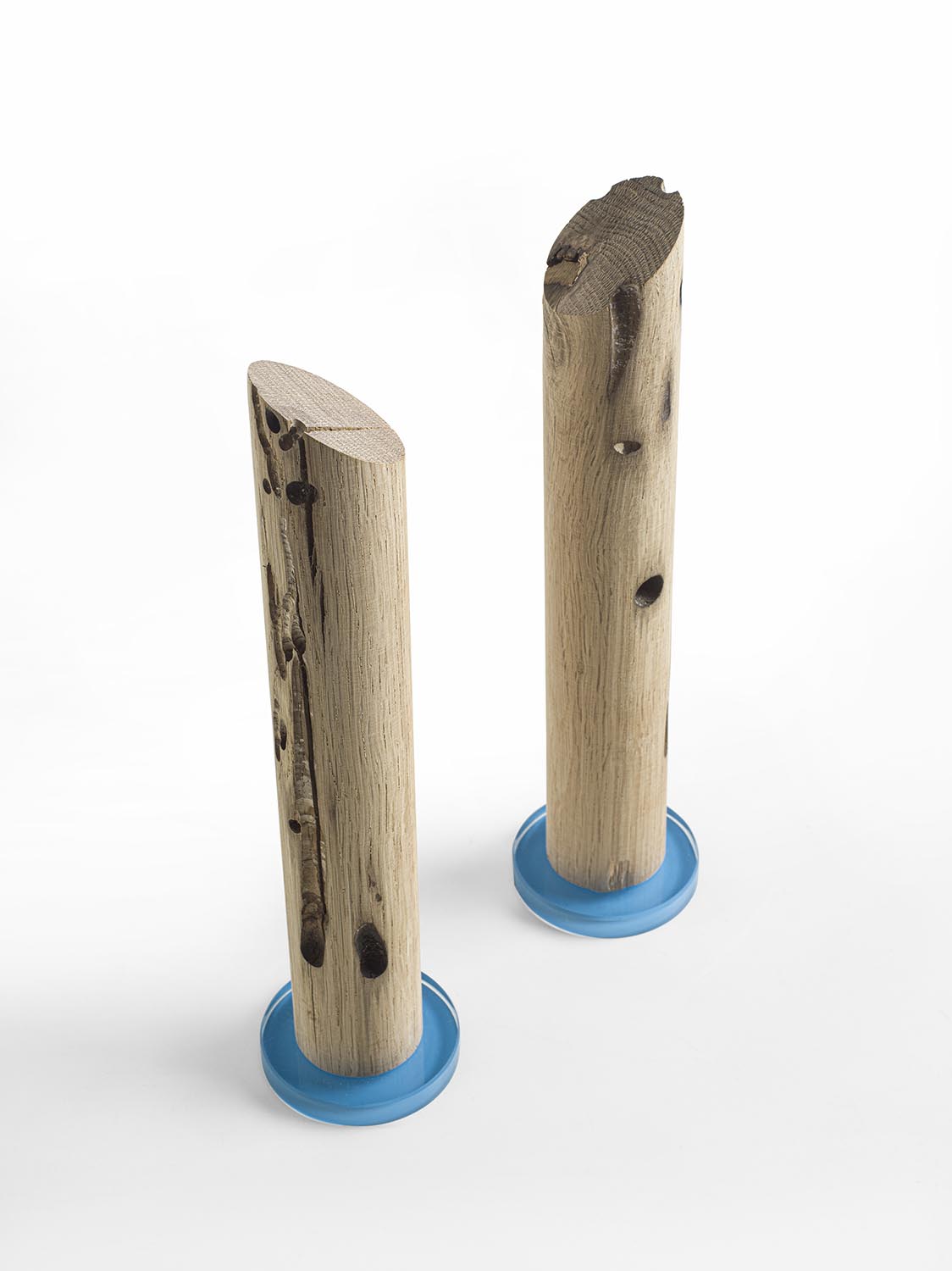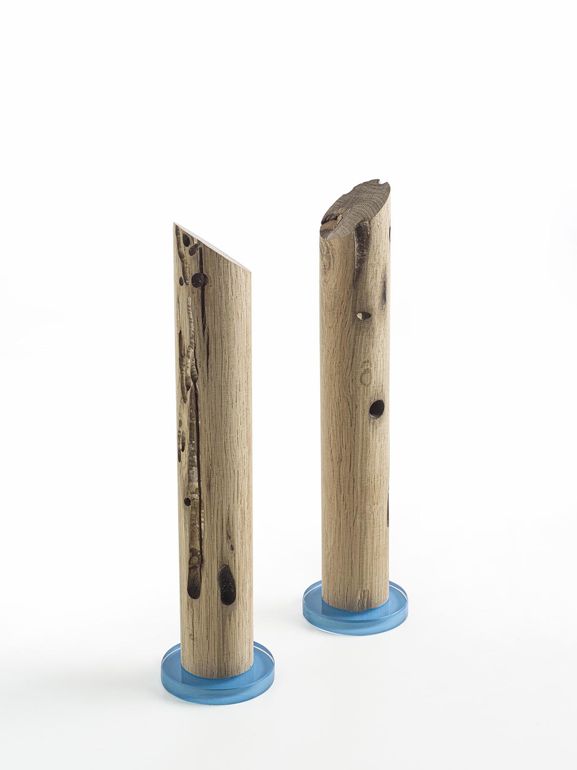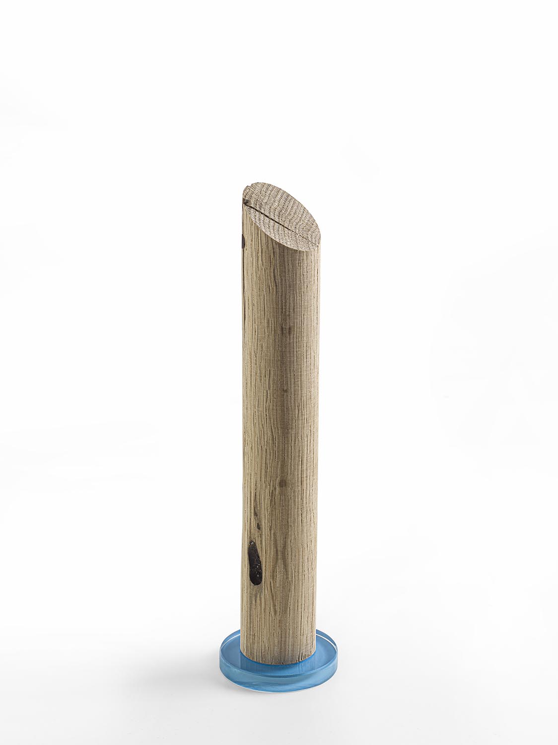Briccola furnishing accessory with light blue lacquered glass base. The design is inspired by a famous element of the Lagoon, the pole that marks the navigation route.