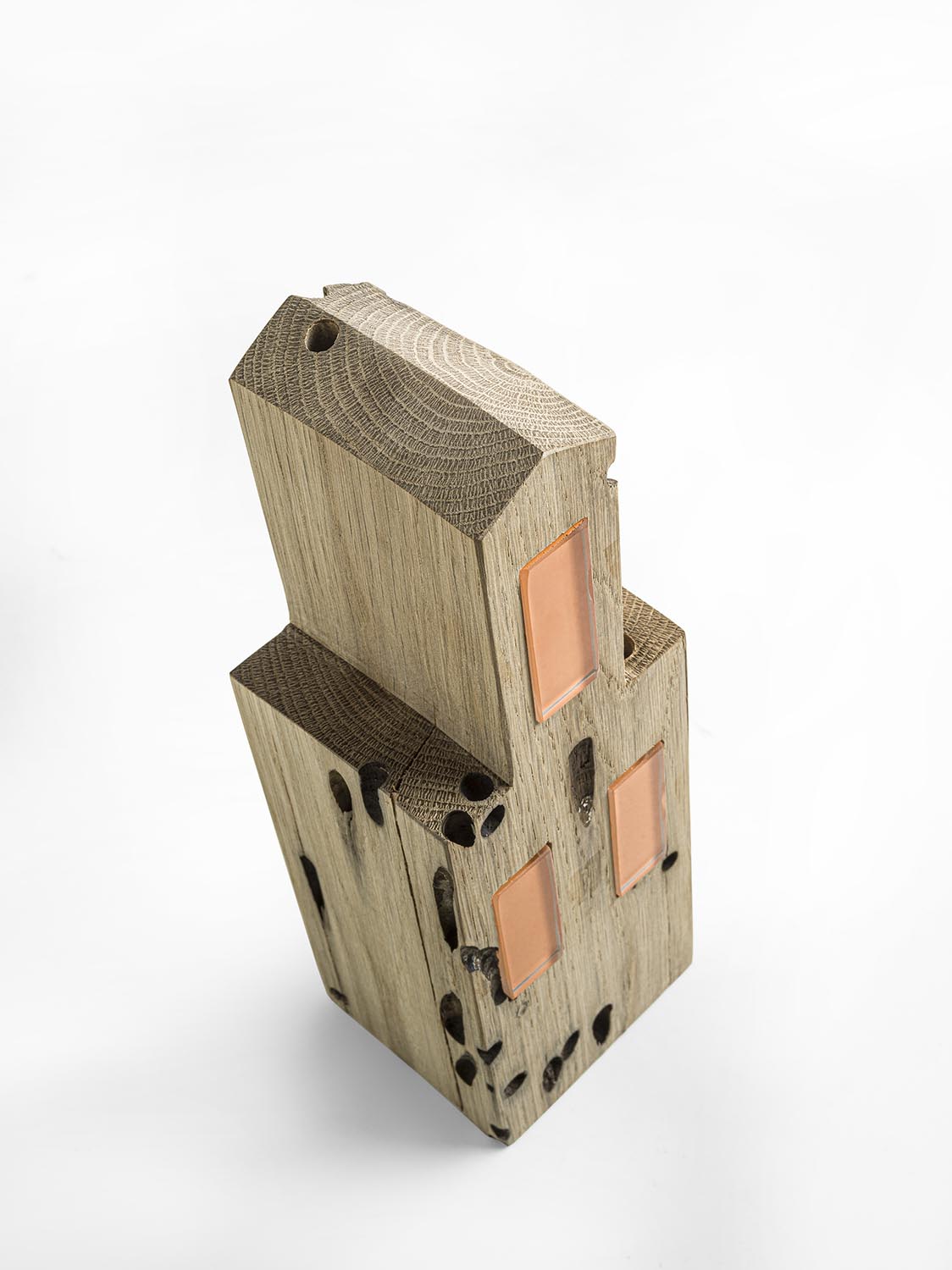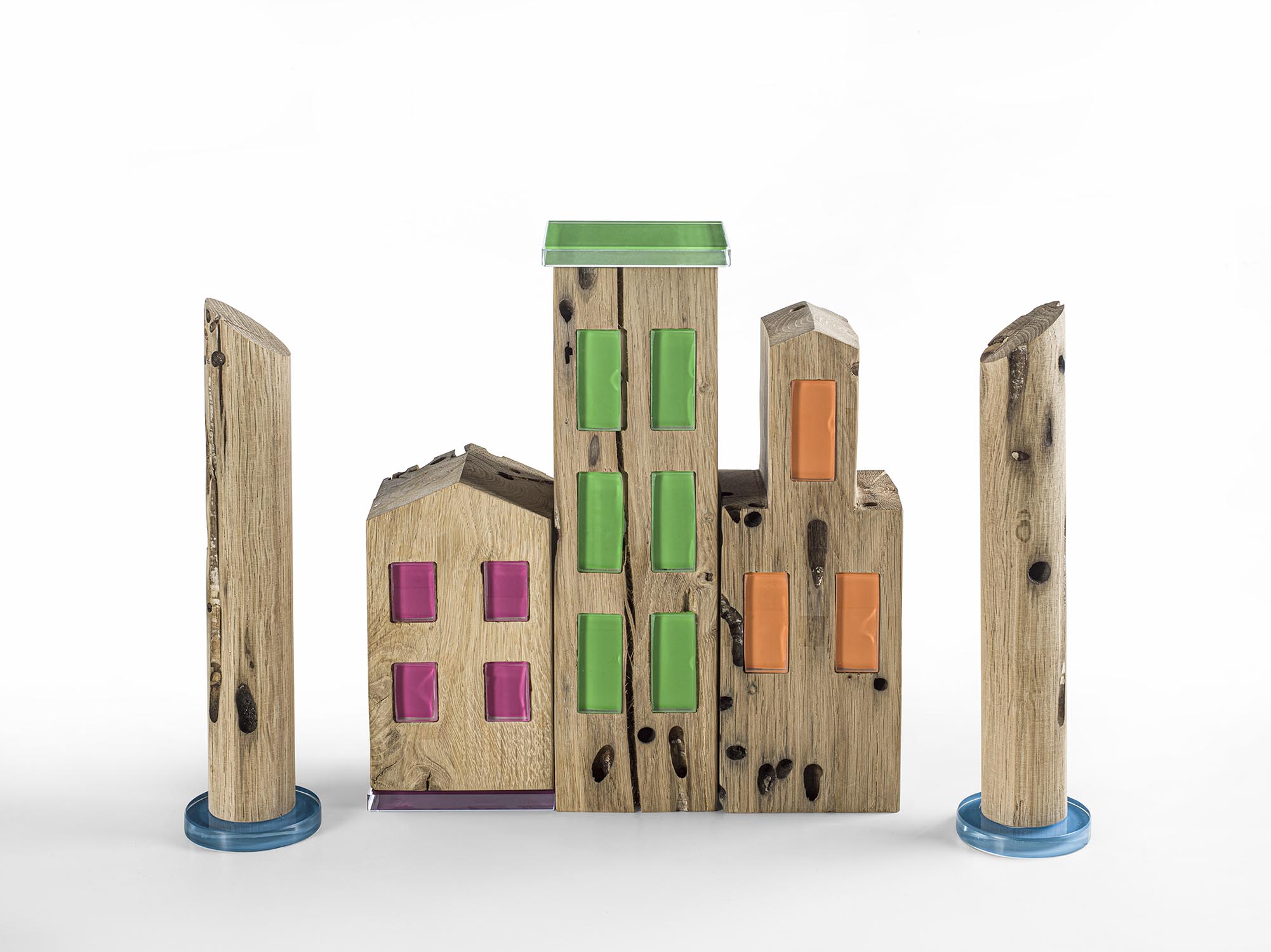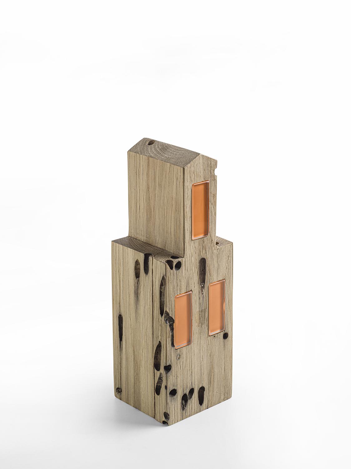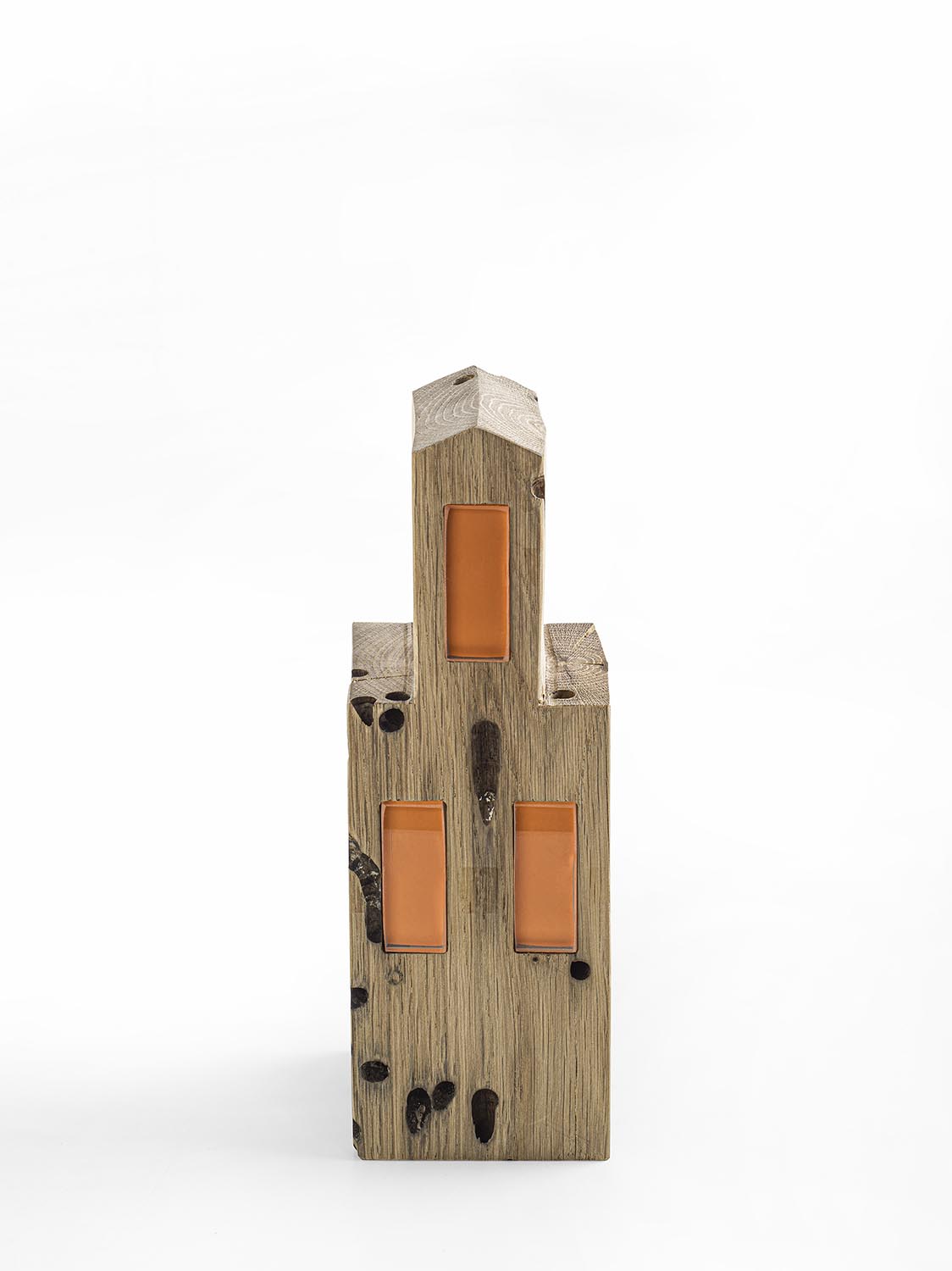 Furnishing accessory in Briccola with contrasting details in orange lacquered glass. The design is inspired by the architecture of the city of Burano.