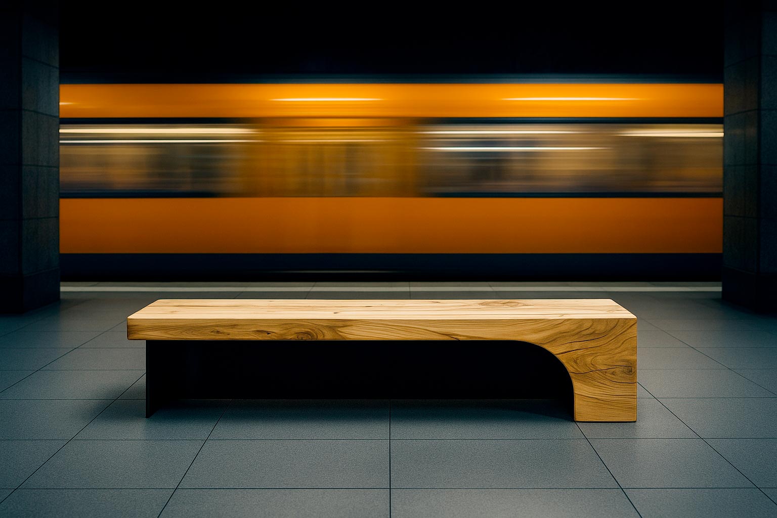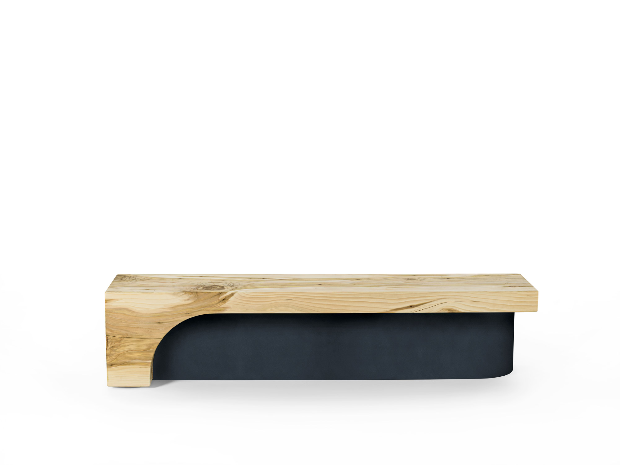 Bench in solid scented cedar wood, characterised by shapes reminiscent of the tapered profile of a swan's beak. The design stands out for the inclusion of a curved metal element integrated into the base. The curved line not only conveys a sense of lightness and dynamism but also performs a structural function, ensuring stability and strength.