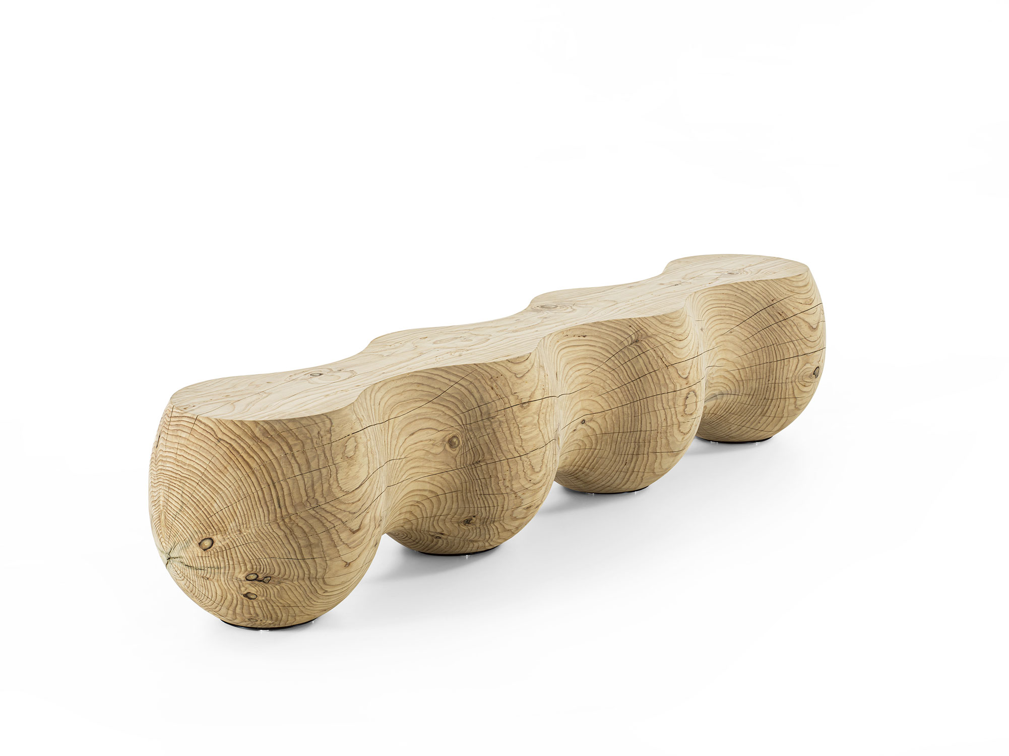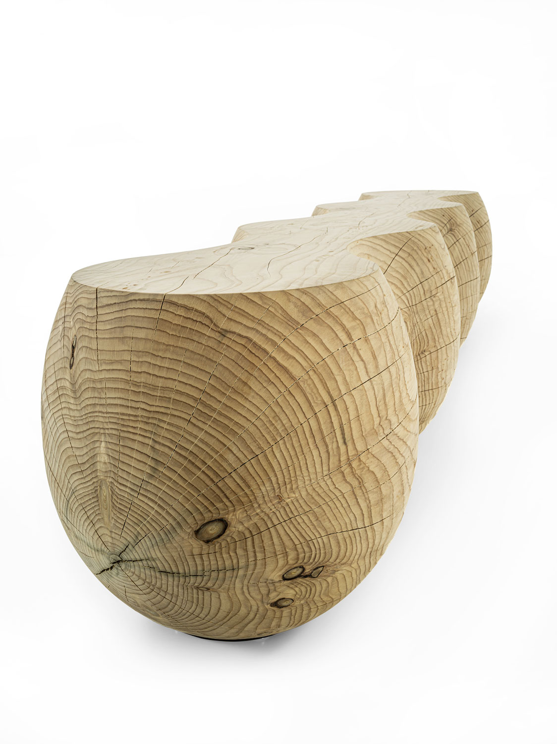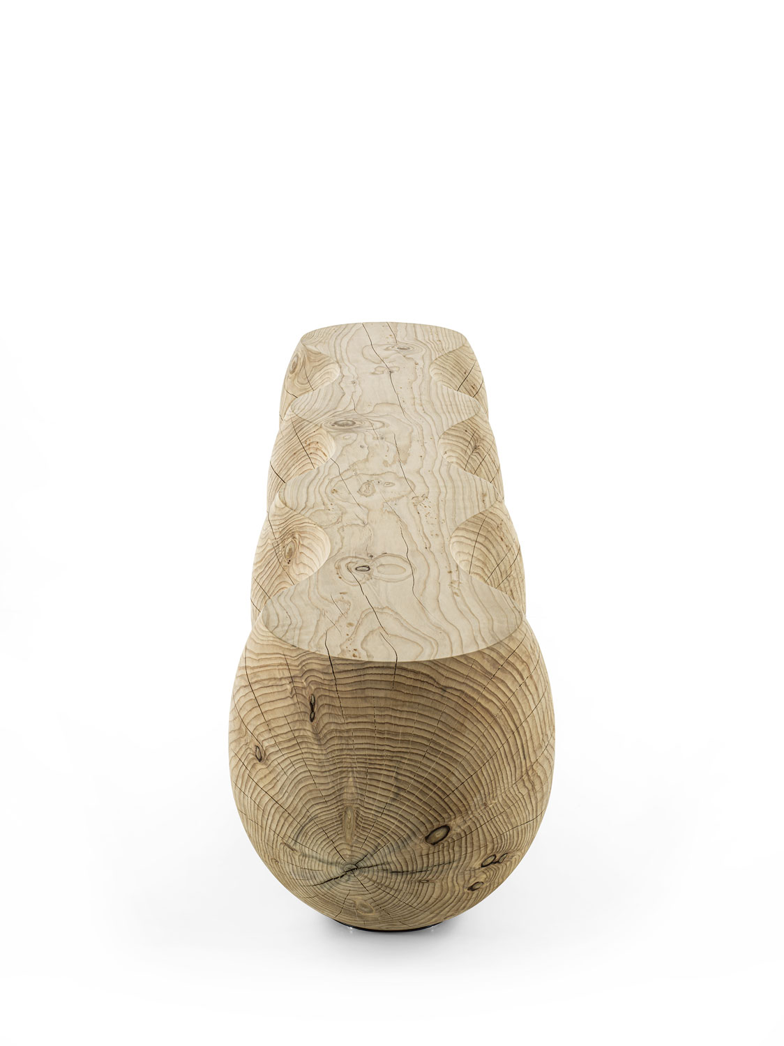 This bench, made from a single block of solid cedar of Lebanon wood, is characterised by a harmonious fusion of four spheres that recalls the organic shape of a caterpillar. The workmanship highlights an alternation of full and empty spaces that gives it visual lightness while maintaining the strength and solidity typical of the wood.