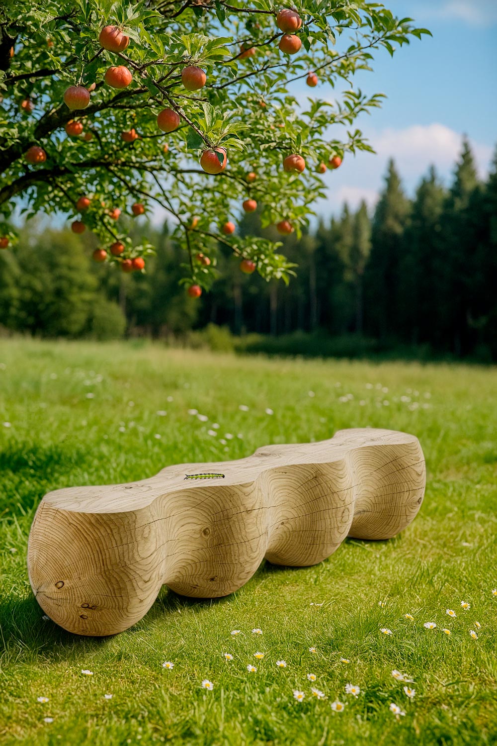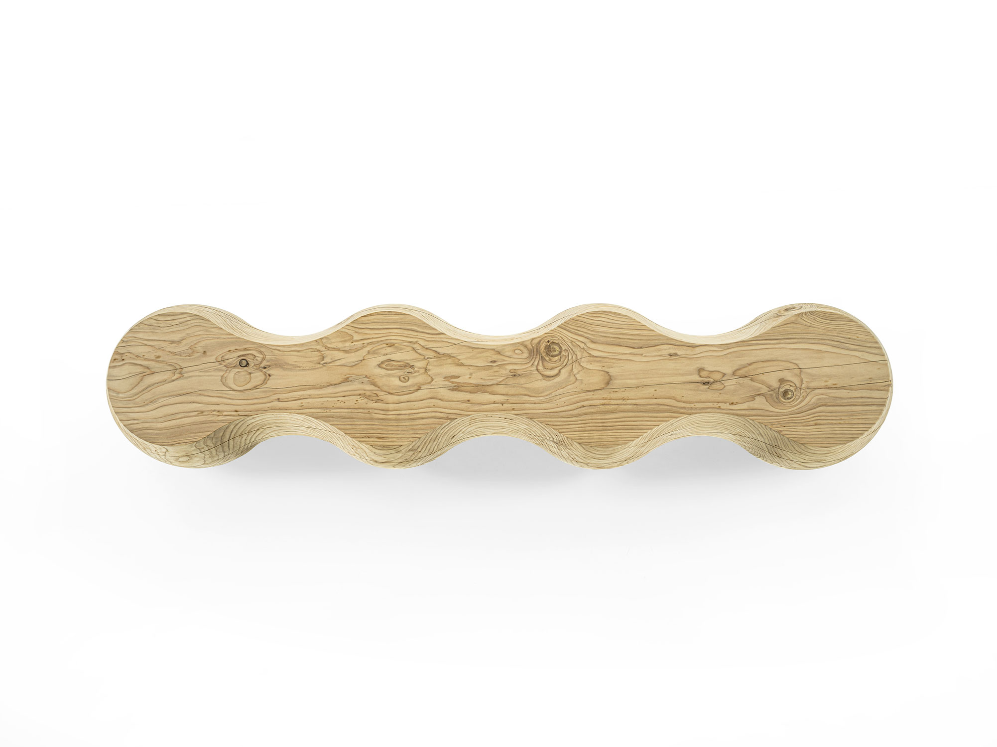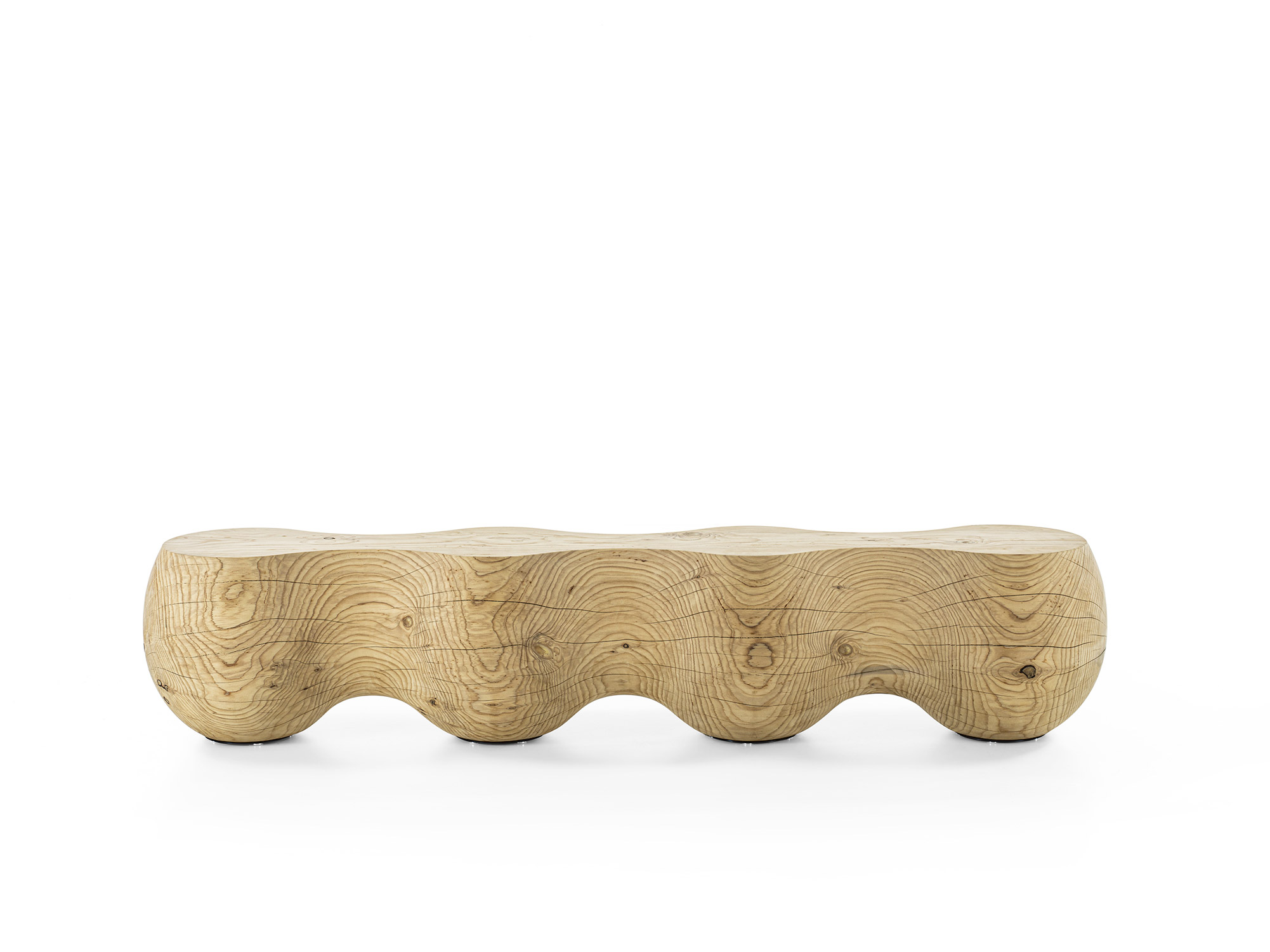 This bench, made from a single block of solid cedar of Lebanon wood, is characterised by a harmonious fusion of four spheres that recalls the organic shape of a caterpillar. The workmanship highlights an alternation of full and empty spaces that gives it visual lightness while maintaining the strength and solidity typical of the wood.