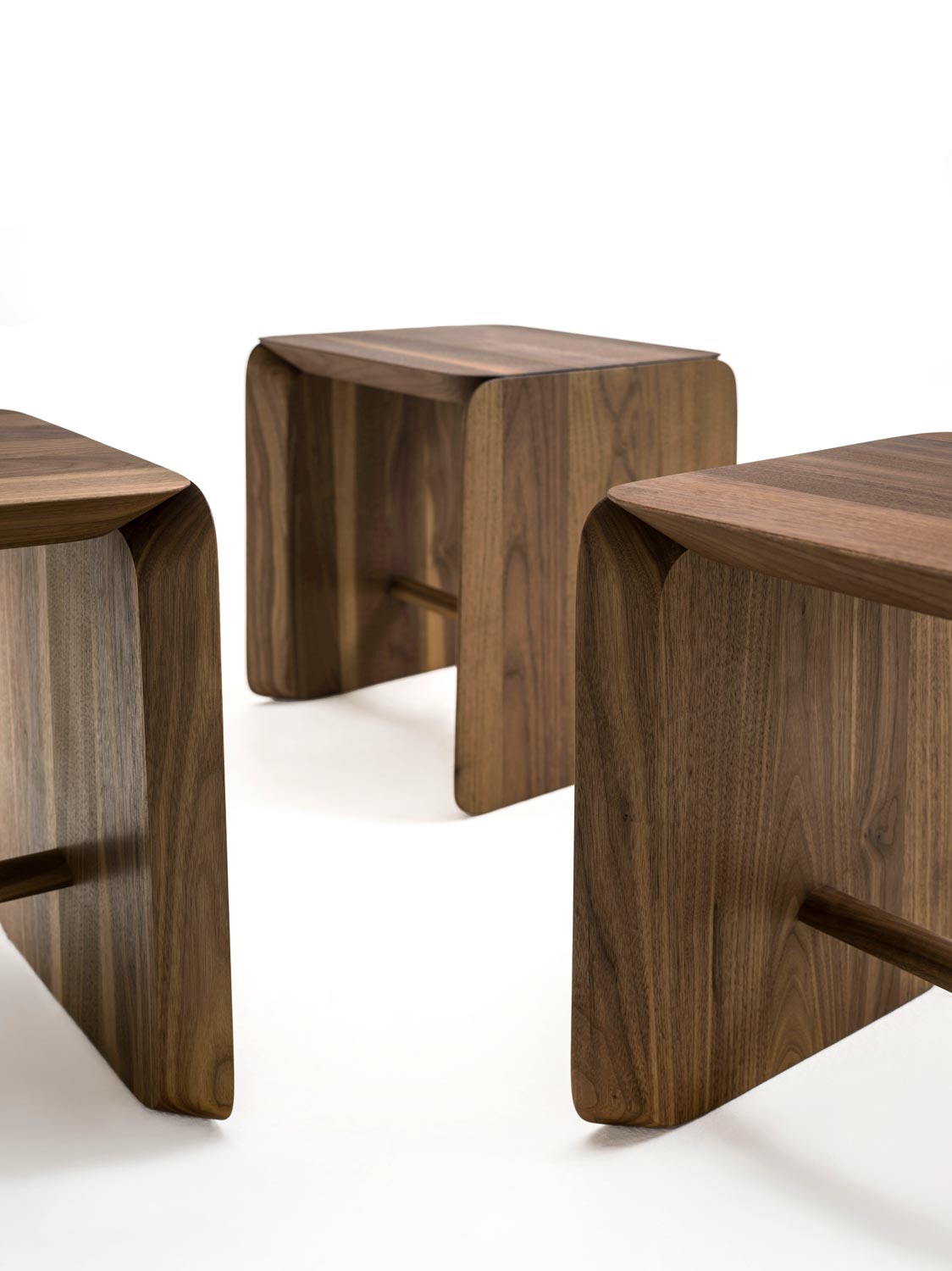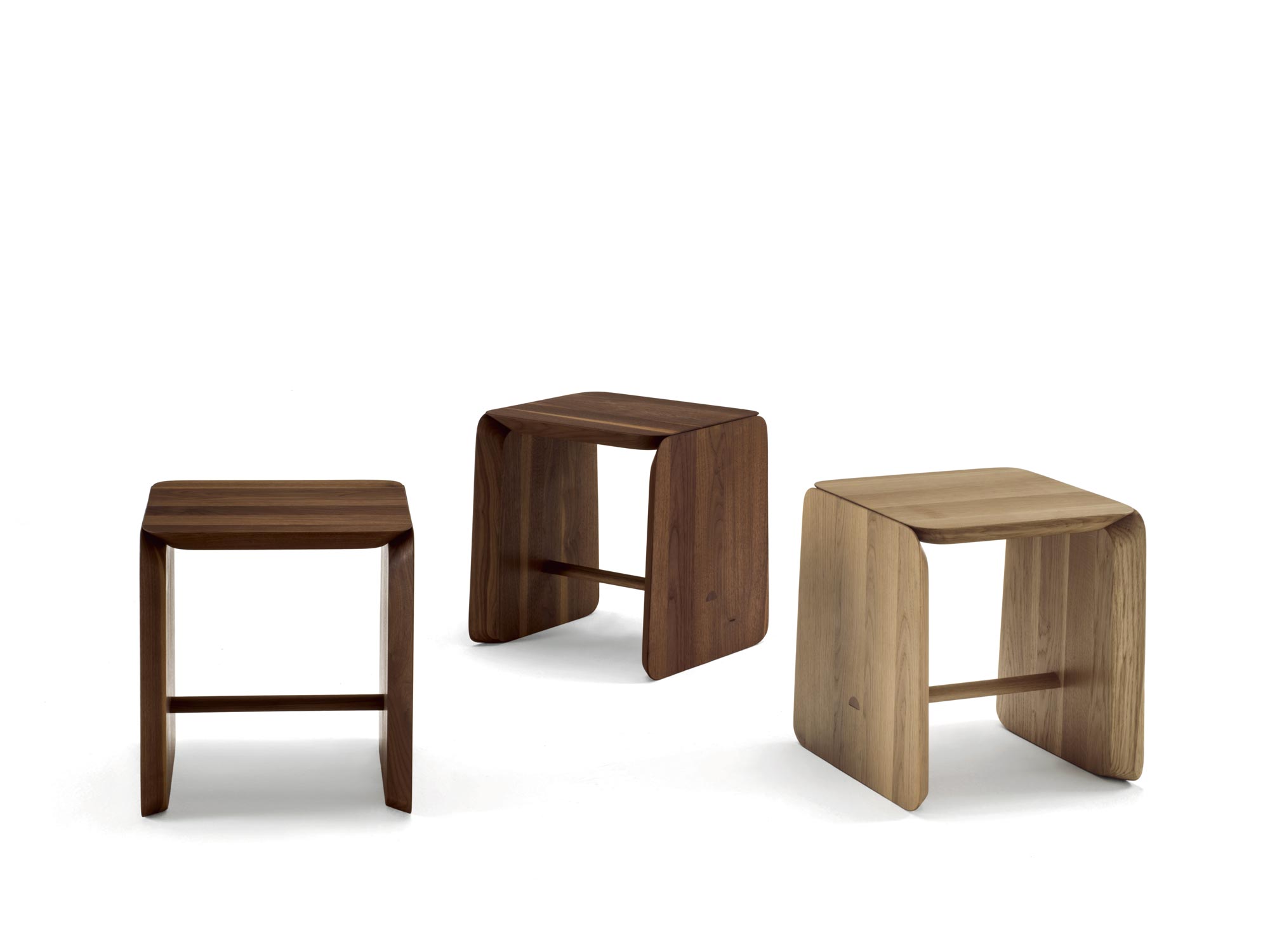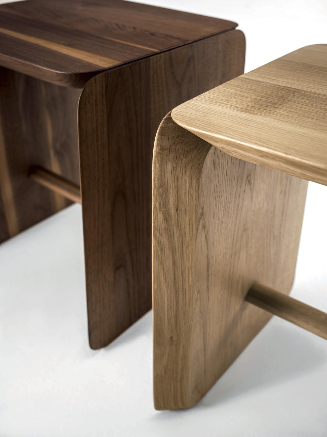 Stool completely made of solid wood, composed of three pieces with smoothed sides, jointed together and with footrest inserted between the legs. For outdoor use, only available in A7 cedar.