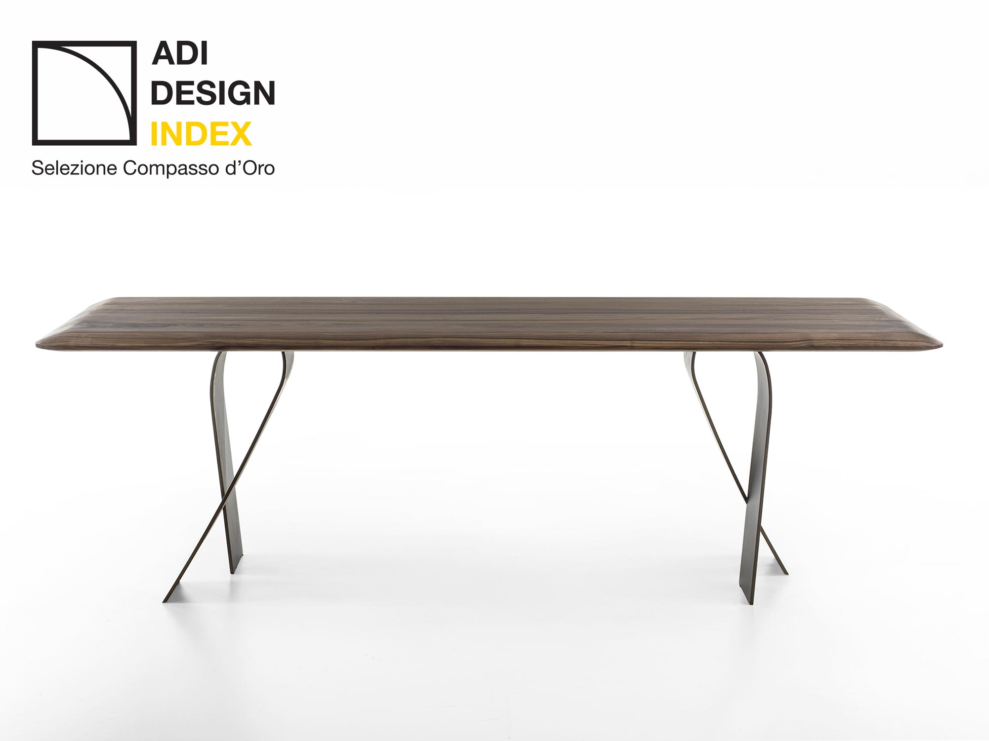 Table entirely made of solid wood, featuring a top composed of edge-glued staves, characterized by a thin thickness thanks to the bevelled and rounded edges, which give it a light and sinuous design, and paired with winding iron legs evoking the flexibility of a ribbon.