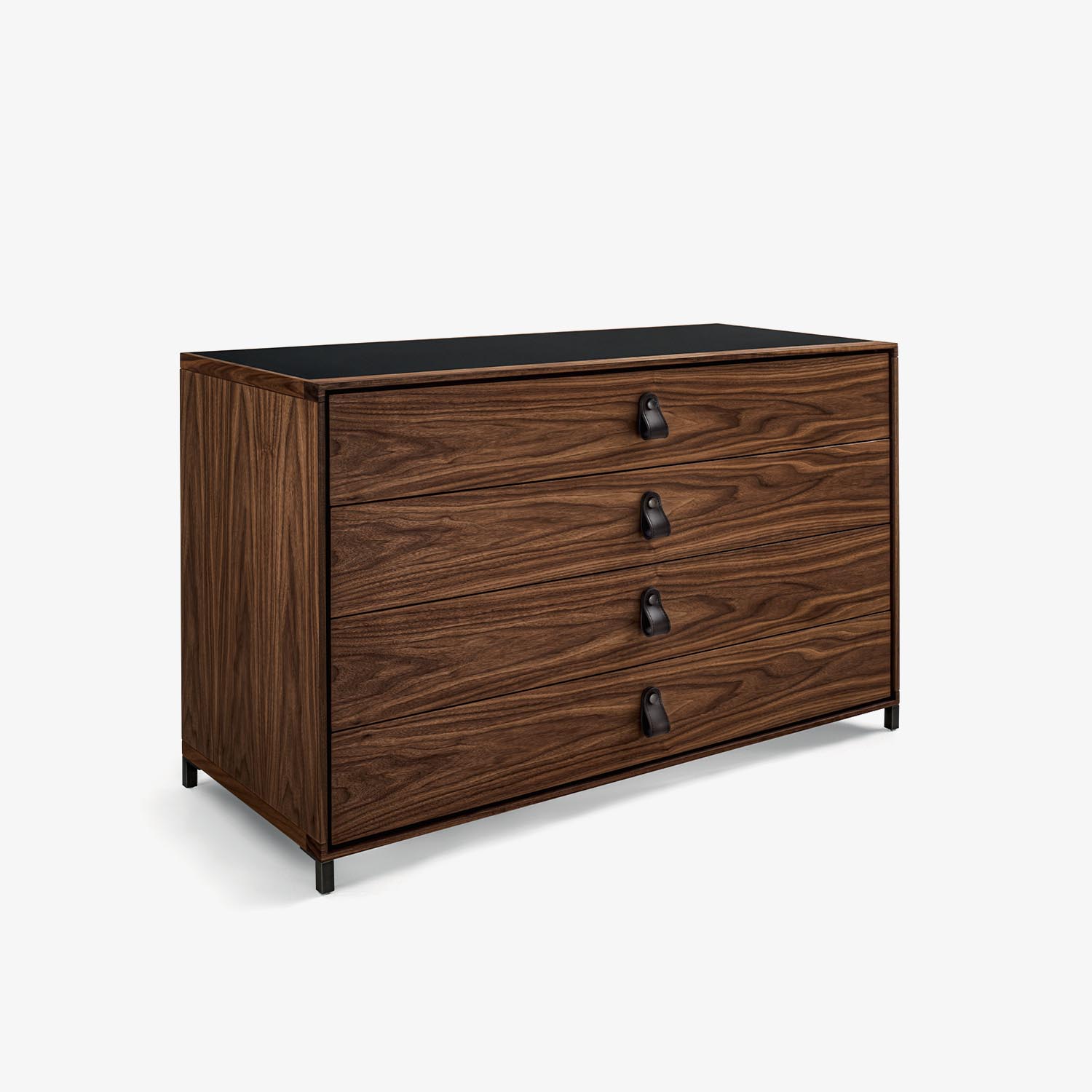 Credenza in legno massello e multistrato, racchiusa da cornice in ferro o legno, caratterizzata da cassetti assemblati con incastri a coda di rondine e ante. Due sottili gambe in ferro rialzano il mobile da terra.