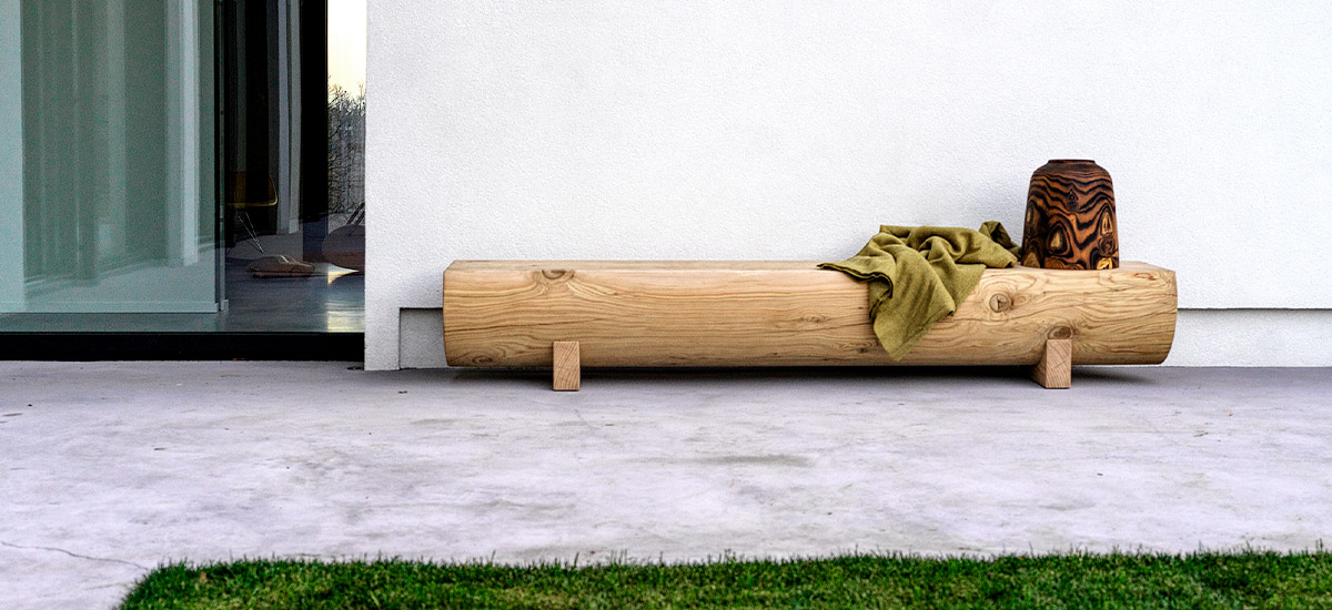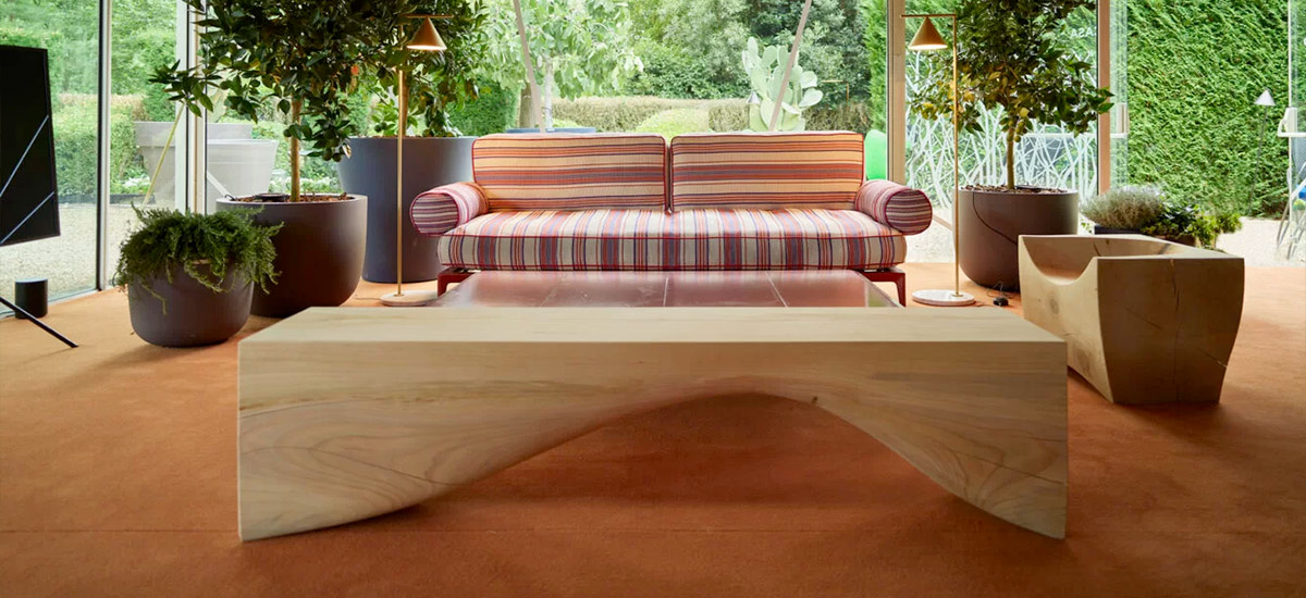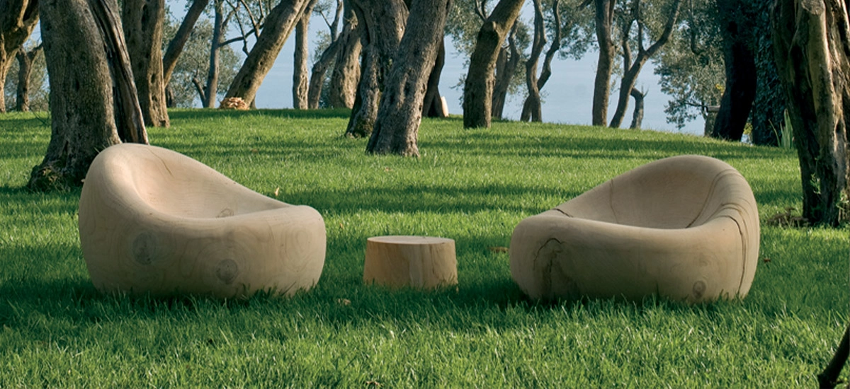 Riva1920 ist mit der von Brodie Neill entworfenen Bank CURVE und dem von C.R.&S. Riva1920 entworfenen Sessel LOG vertreten.