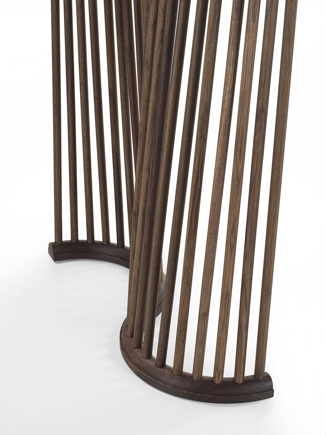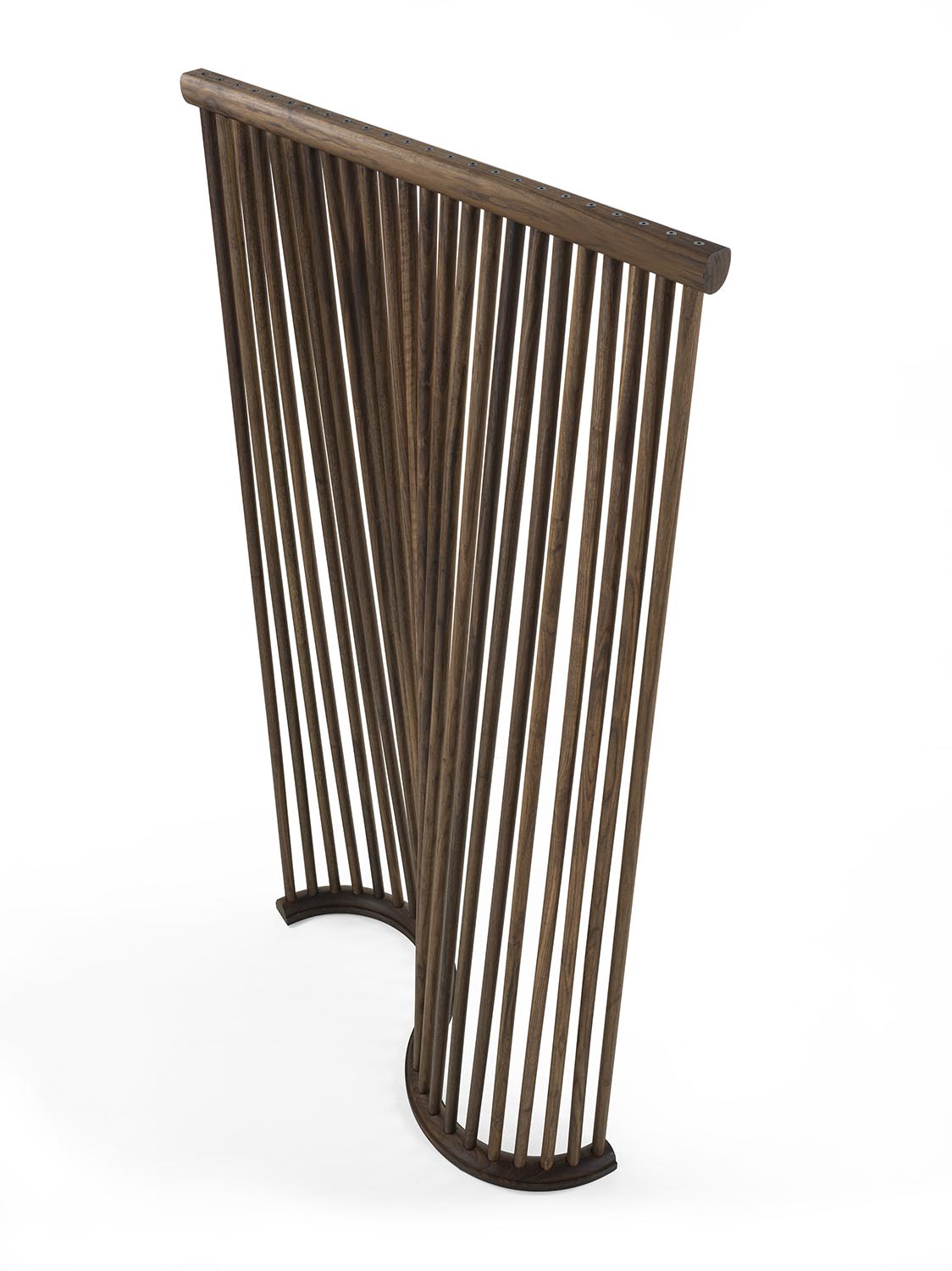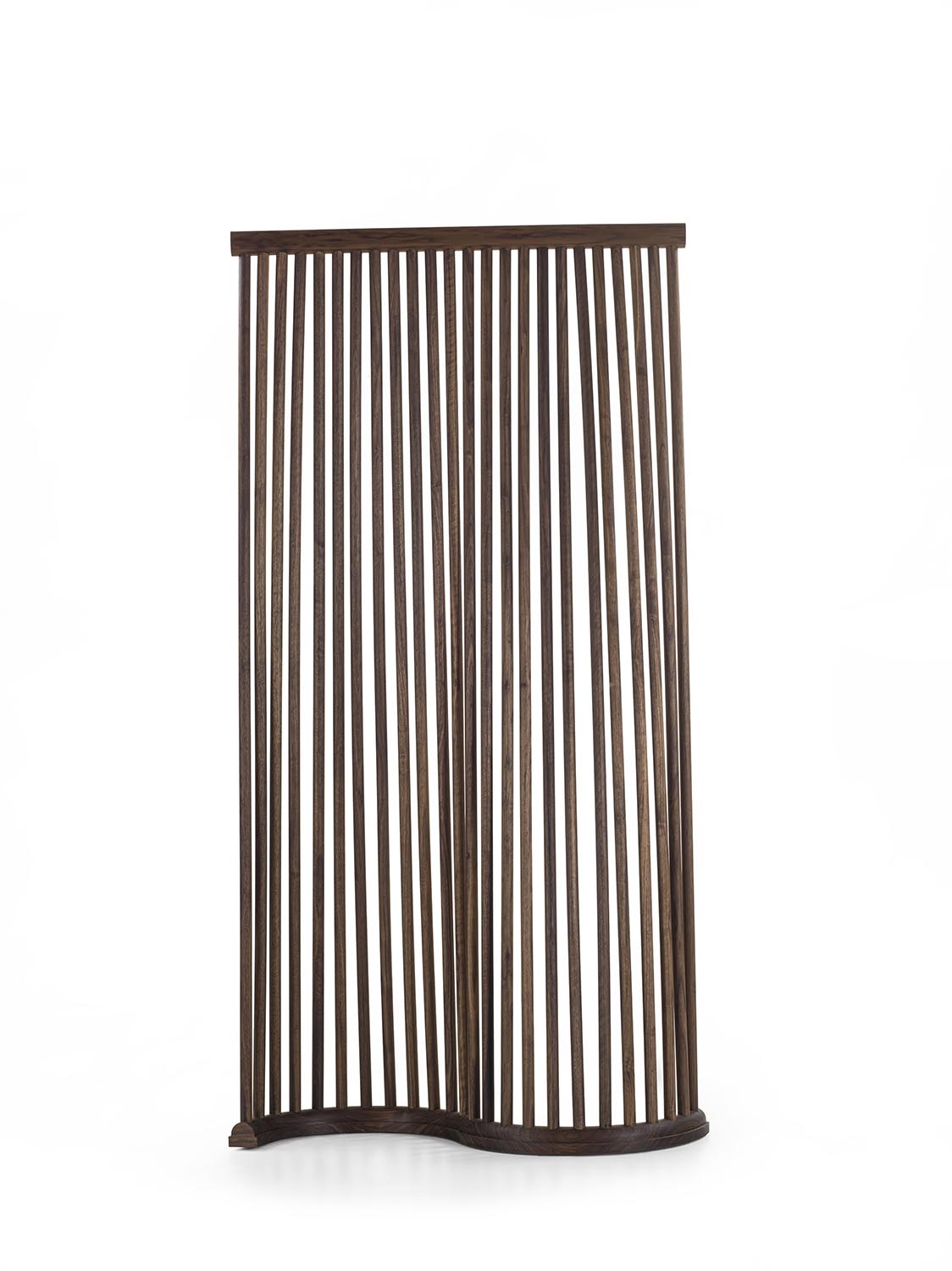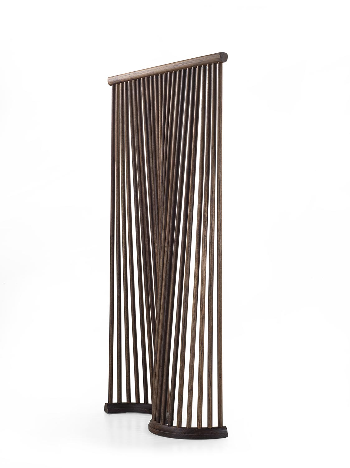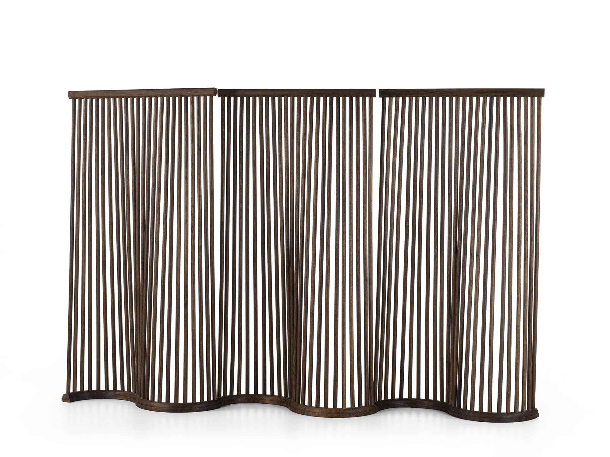 Modularer Paravent, vollständig aus Massivholz gefertigt, dessen Design die weichen Kurven eines Vorhangs aufgreift. Die dreidimensionale Struktur besteht aus gedrechselten Rundstäben sowie einer gebogenen Basis. Die miteinander verbundenen Module ermöglichen freie und dynamische Konfigurationen.