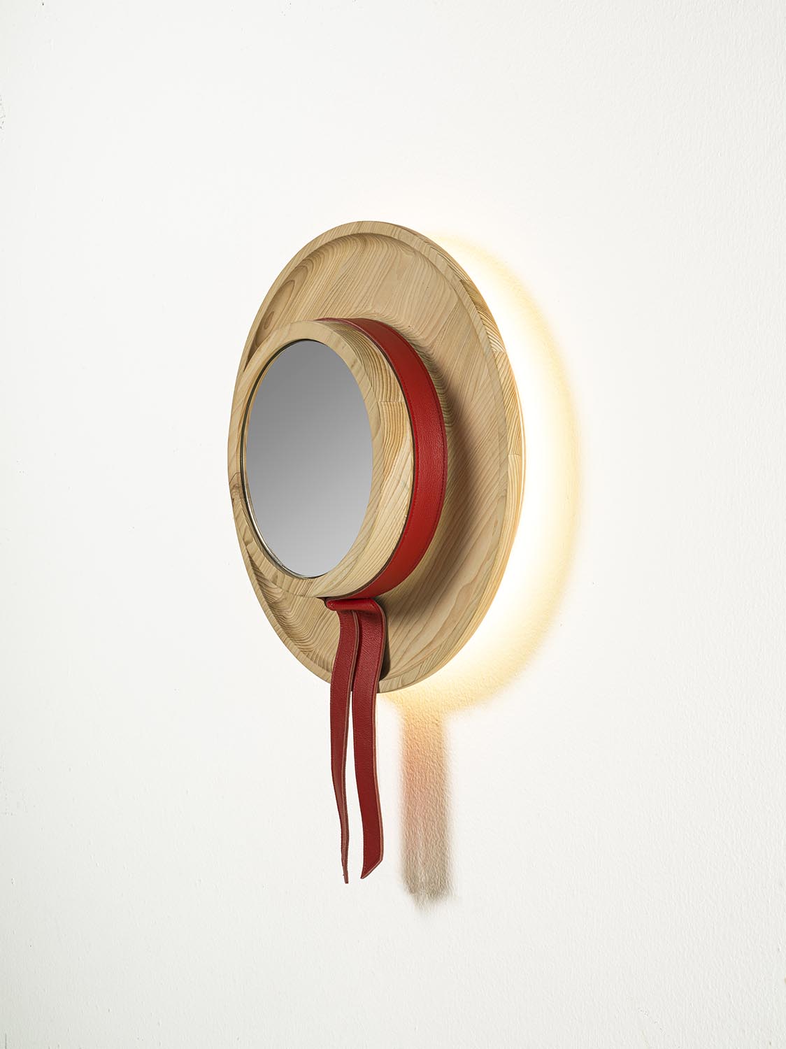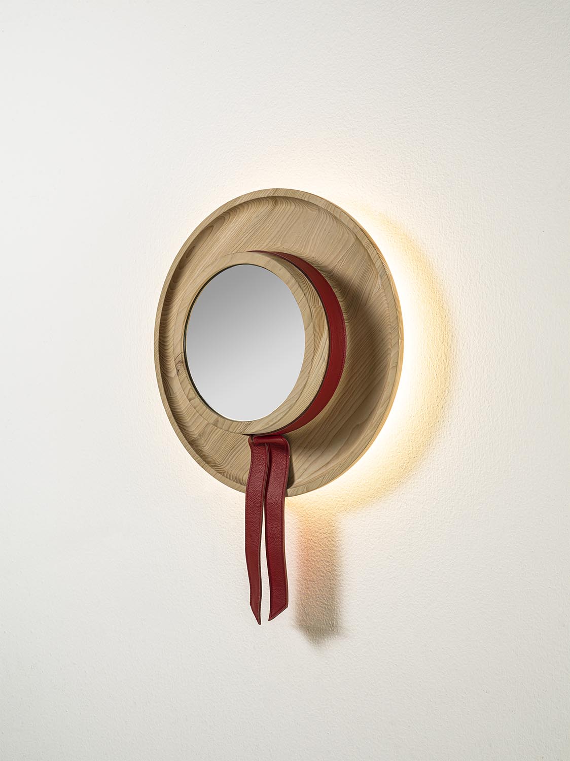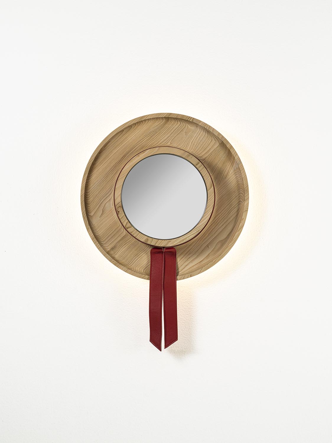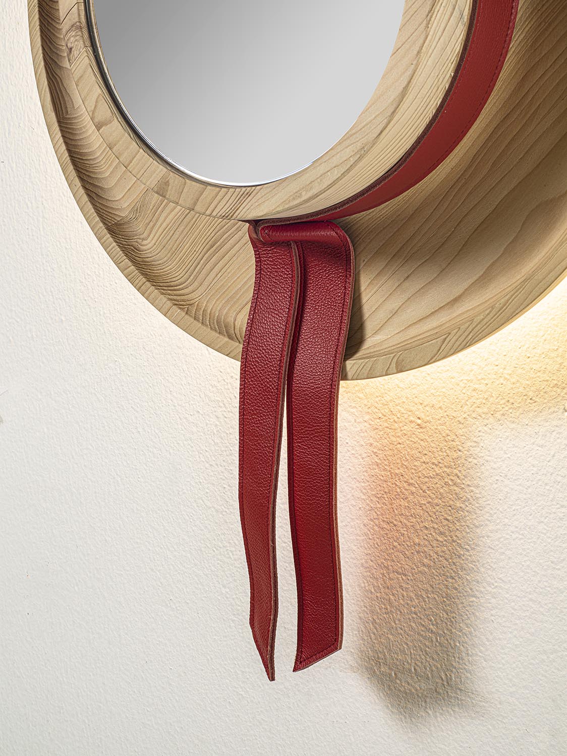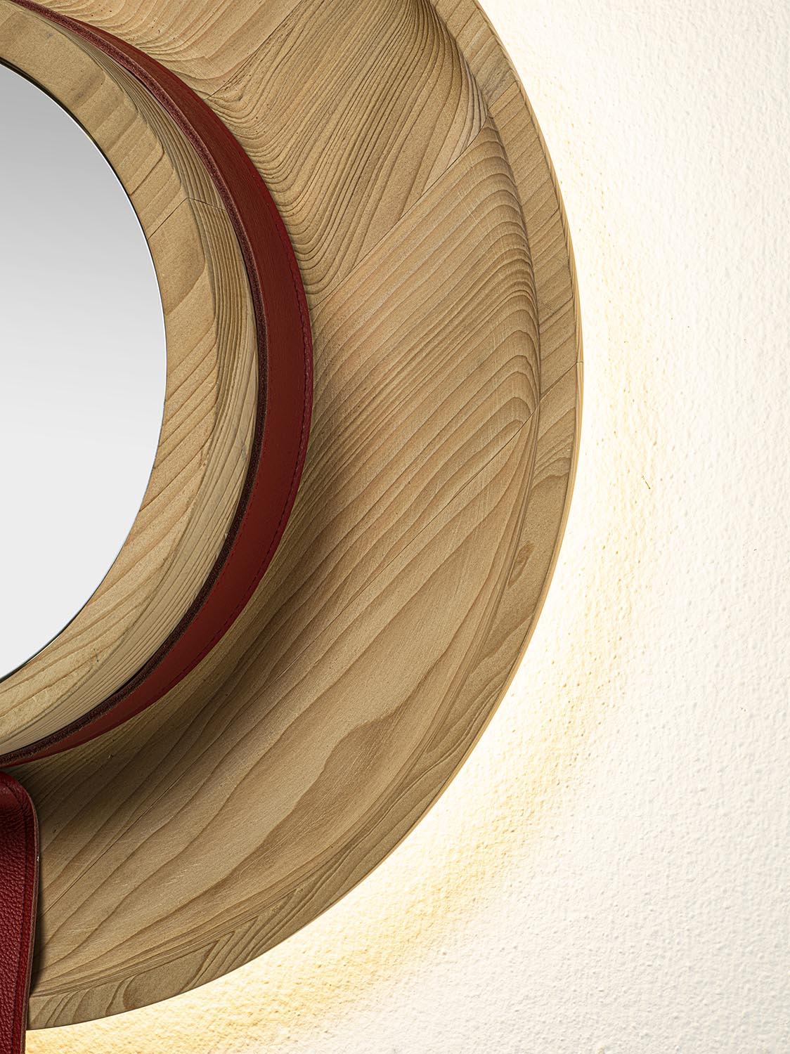 Spiegel aus verleimten Massivholzleisten, bestehend aus einem runden Rahmen, zentralem Spiegel, dekorativem Leder-Einsatz und integrierter LED-Hinterbeleuchtung. Das Design ist vom Hut des venezianischen Gondoliere inspiriert.