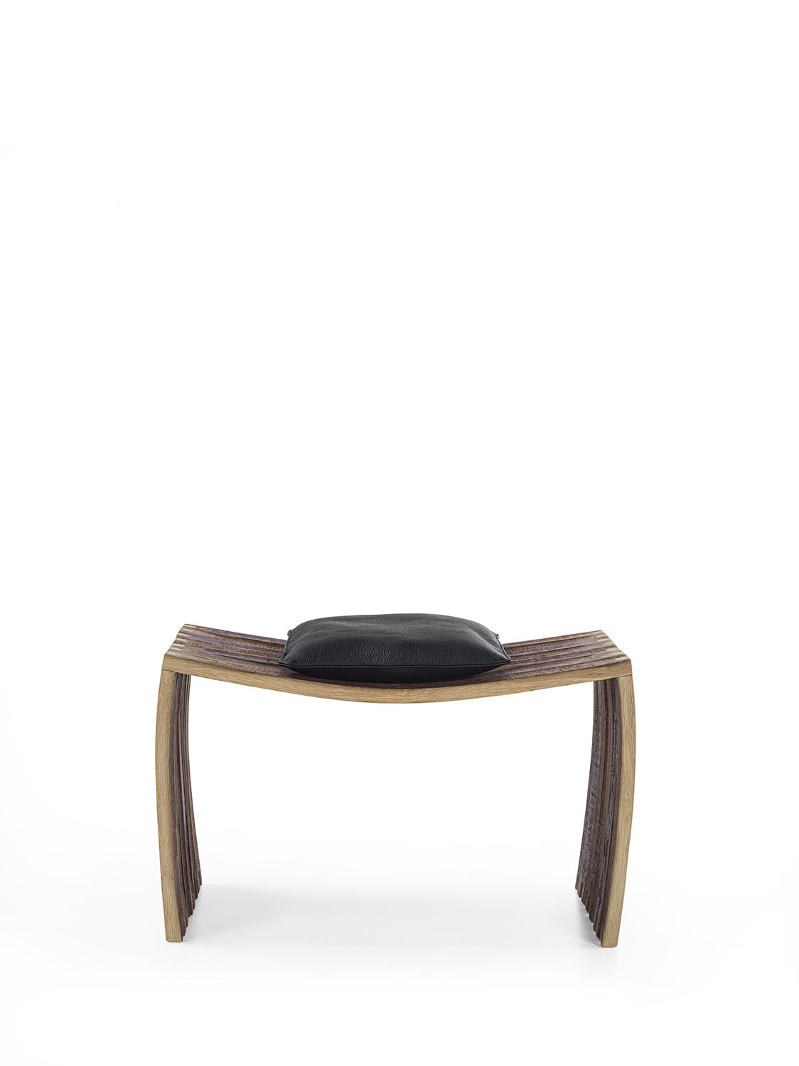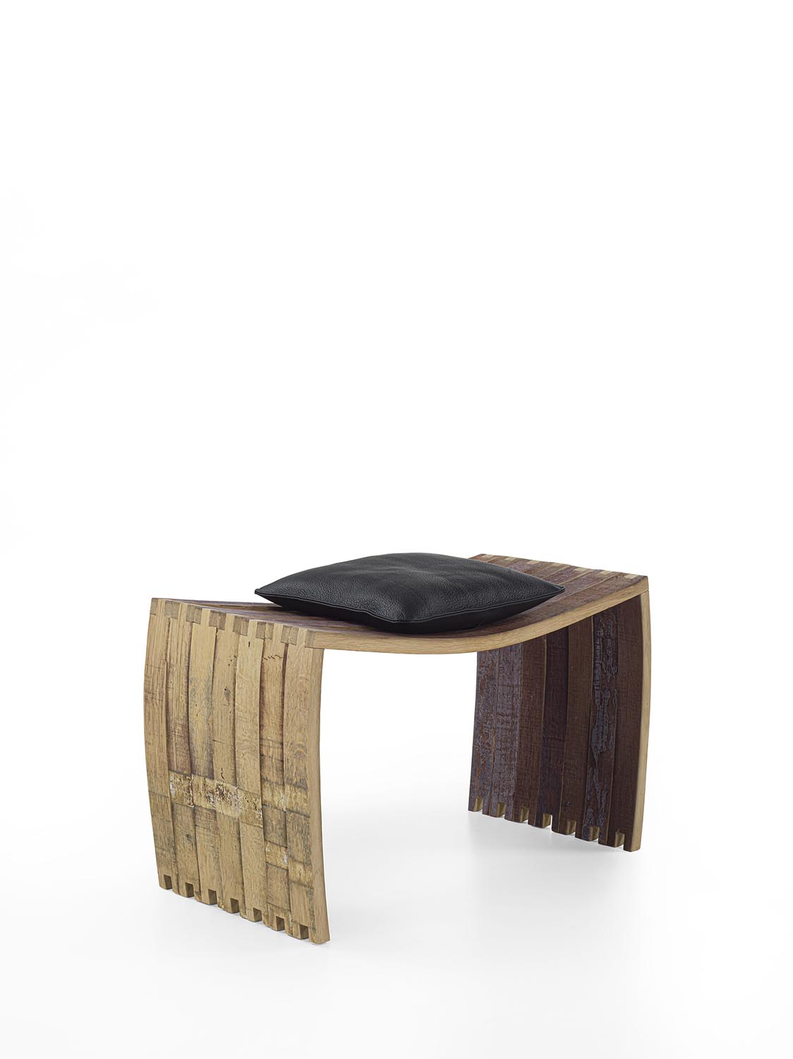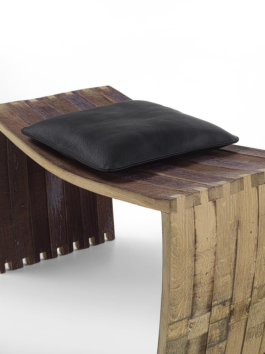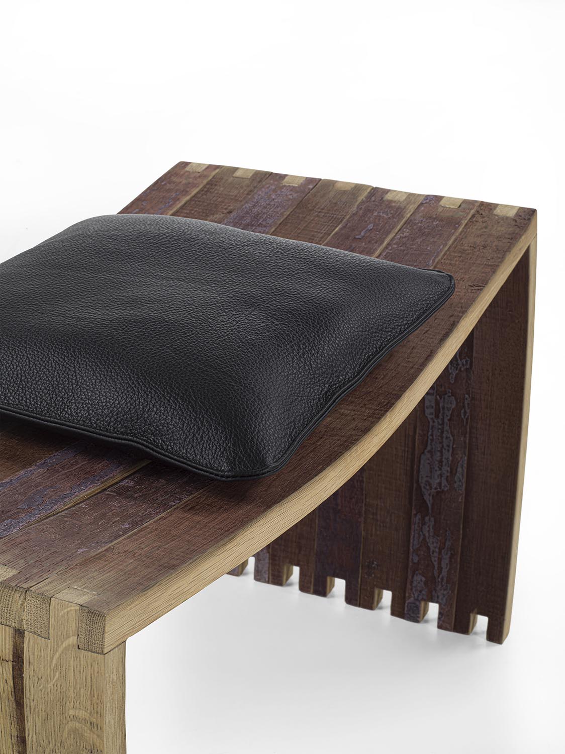 Neuauflage „100+6“ der ikonischen Bank BOTTEA. Vollständig gefertigt aus massivem Eichenholz aus wiederverwendeten Barrique-Fässern. Die Sitzfläche besteht aus verleimten Dauben, deren geschwungener Querschnitt den Sitzkomfort definiert. Ergänzt wird sie durch ein Kissen aus Leder. Die Beine, die sich in Kontinuität mit den Seiten der Bank entwickeln, sind mittels traditioneller Schwalbenschwanzverbindung mit der Sitzfläche verbunden.