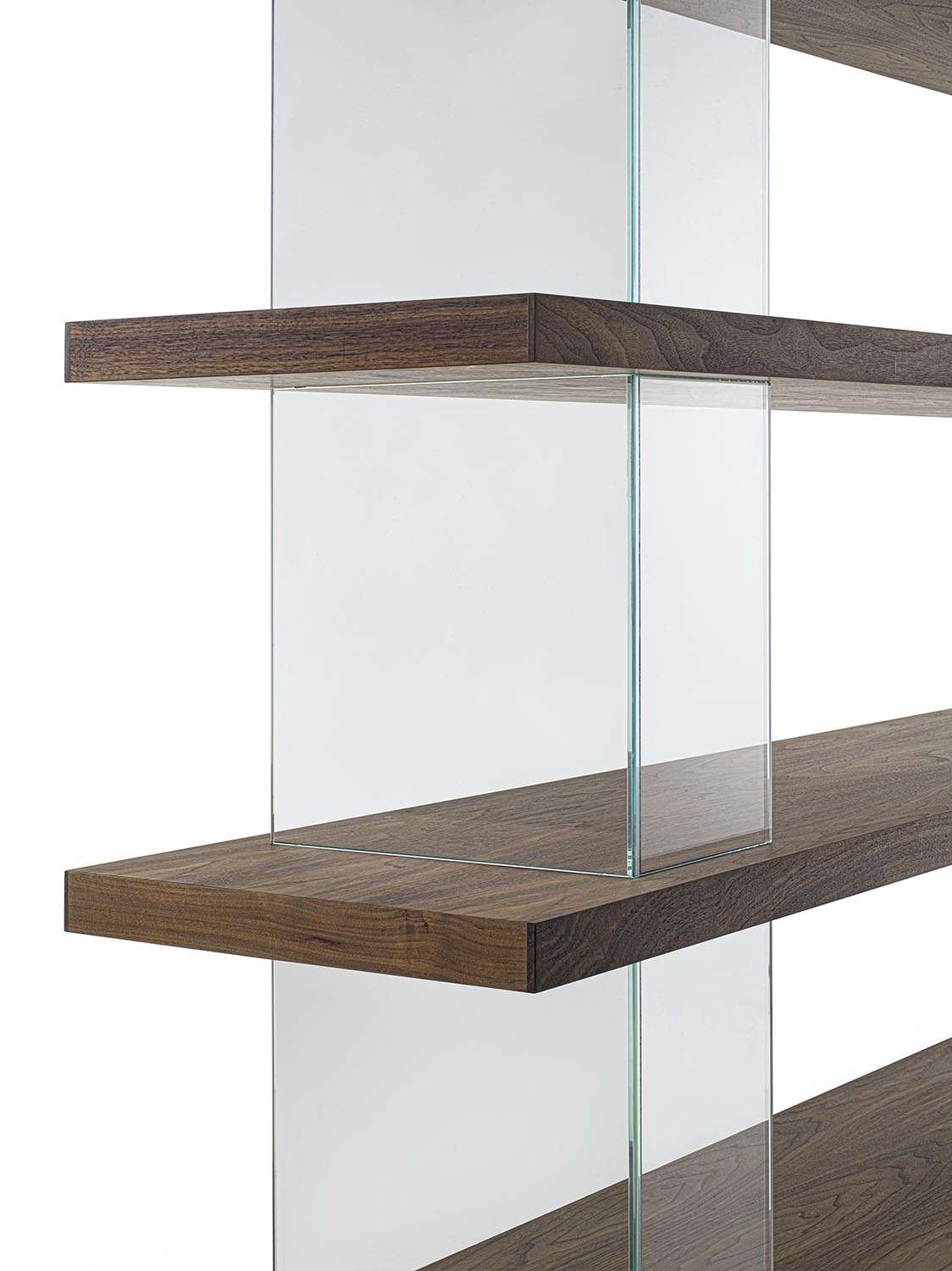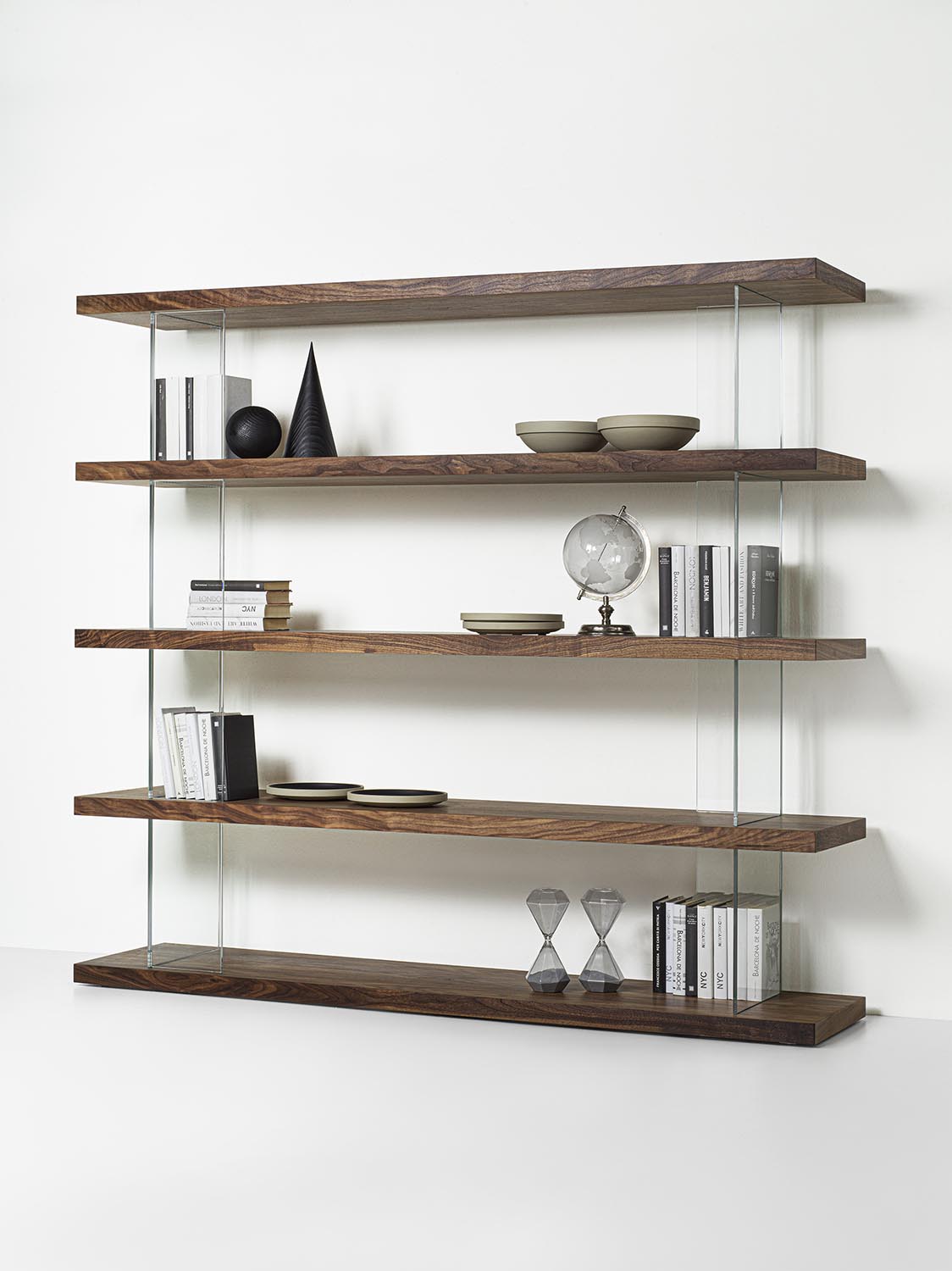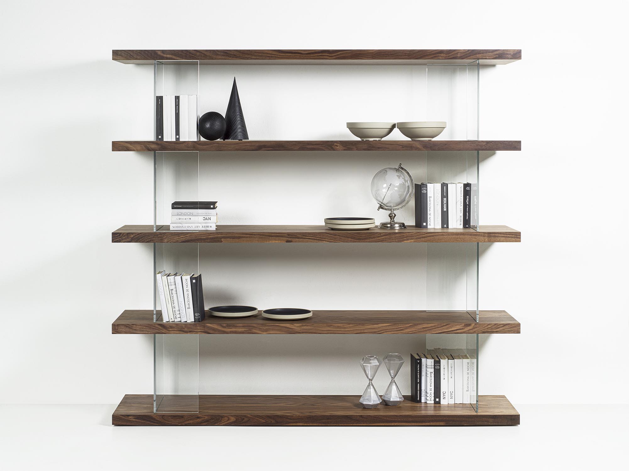 Modulares Bücherregal aus Massivholz und Tischlerplatte, unterteilt durch vertikale Einsätze aus Sicherheitsglas, die die Regalböden tragen und voneinander absetzen. Der Wechsel zwischen Holzelementen und transparenten Einsätzen schafft eine essenzielle, leichte und funktionale Struktur, die den Raum elegant ordnet, ohne ihn zu beschweren. Das System kommt ohne Befestigungselemente aus und ermöglicht vielfältige gestalterische Konfigurationen bei gleichzeitig sauberer, zeitgemäßer Optik.