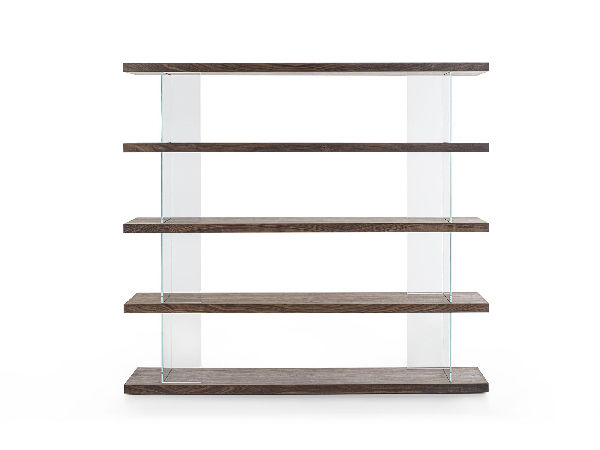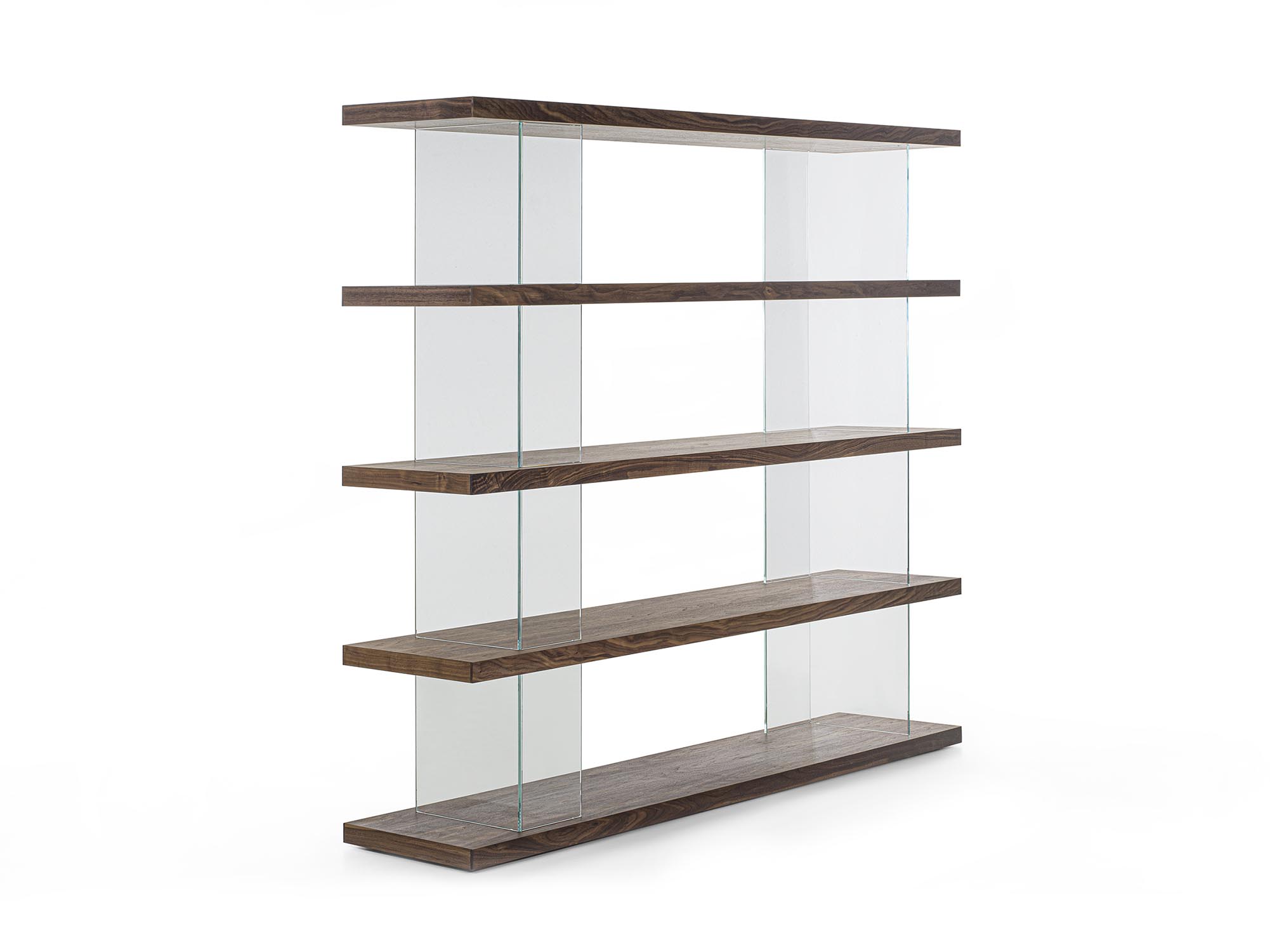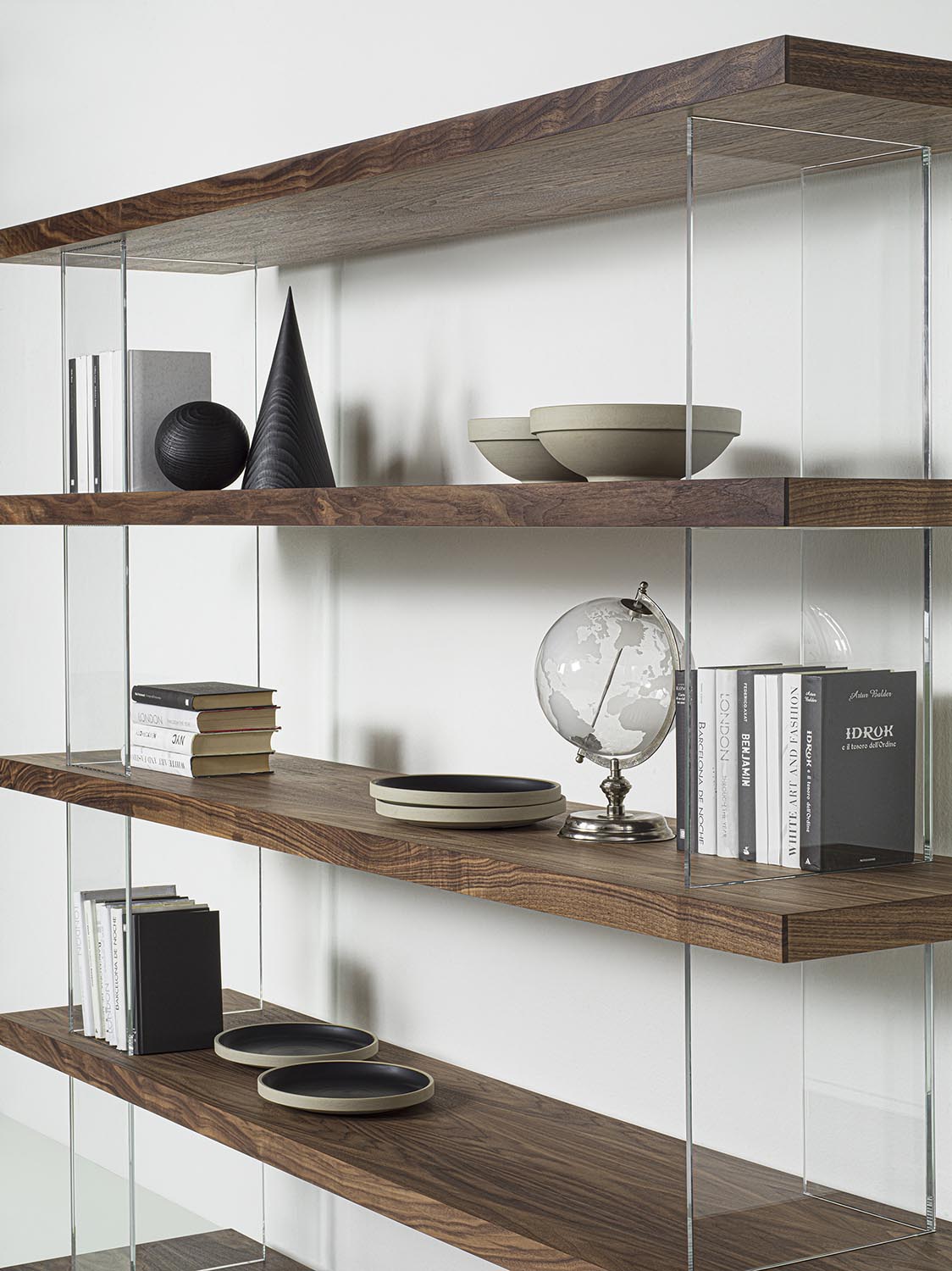 Modulares Bücherregal aus Massivholz und Tischlerplatte, unterteilt durch vertikale Einsätze aus Sicherheitsglas, die die Regalböden tragen und voneinander absetzen. Der Wechsel zwischen Holzelementen und transparenten Einsätzen schafft eine essenzielle, leichte und funktionale Struktur, die den Raum elegant ordnet, ohne ihn zu beschweren. Das System kommt ohne Befestigungselemente aus und ermöglicht vielfältige gestalterische Konfigurationen bei gleichzeitig sauberer, zeitgemäßer Optik.