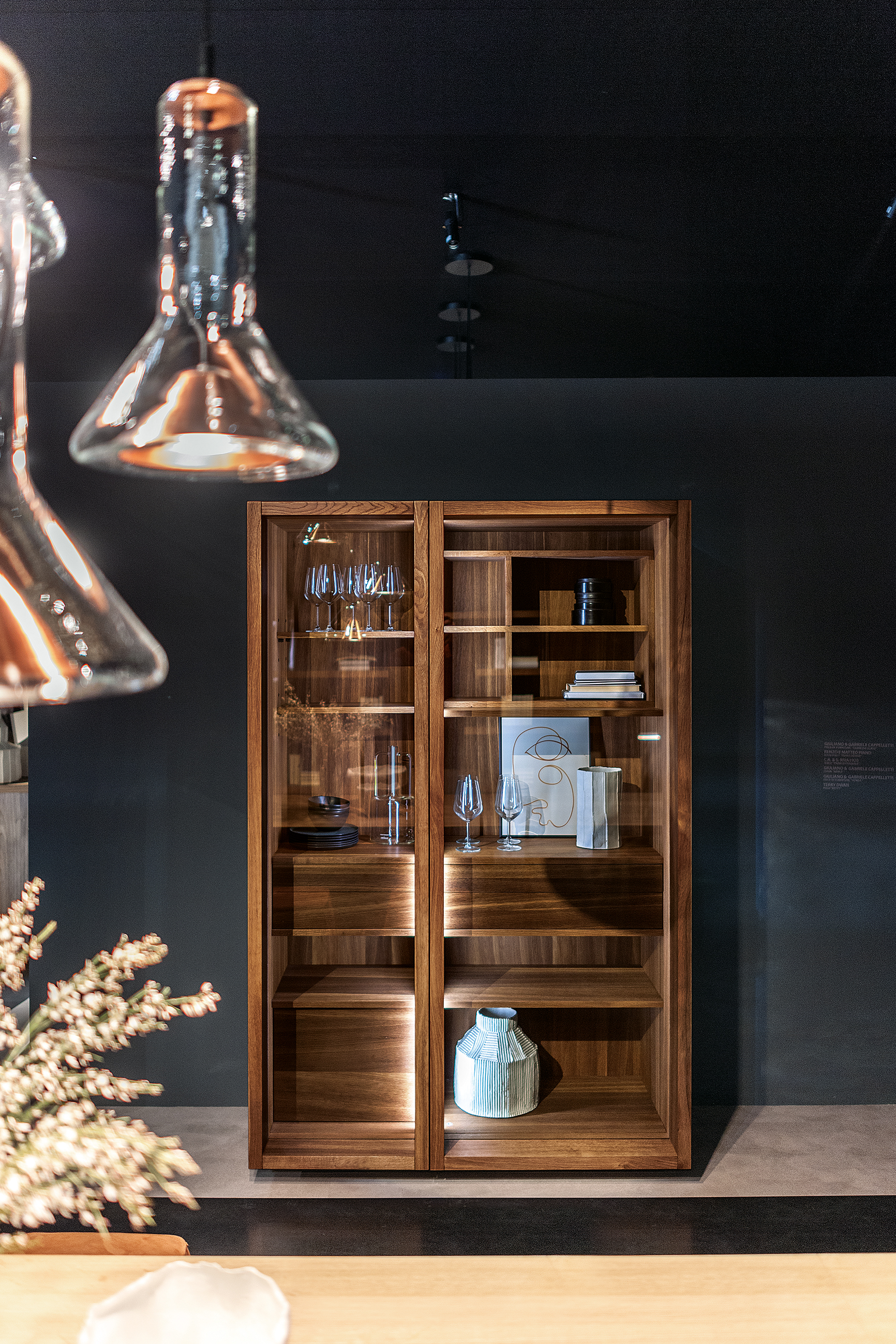 Mehrzweckschrank aus Massiv- und Furnierschichtholz, mit zwei um 180 Grad drehbaren Glastüren versehen. Innen ist der Schrank in Fächern verschiedener Größe unterteilt. Es besteht die Möglichkeit, in der Version Jumbo, kleine Geräte einzubauen. In der Schrank-Mittelseitenwand sind Led-Lichtleisten montiert und dank eines Sensors geht das Licht beim Öffnen der Türen automatisch an.