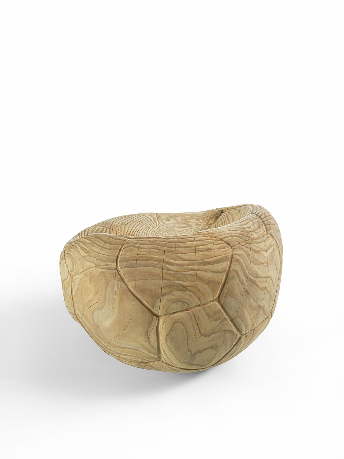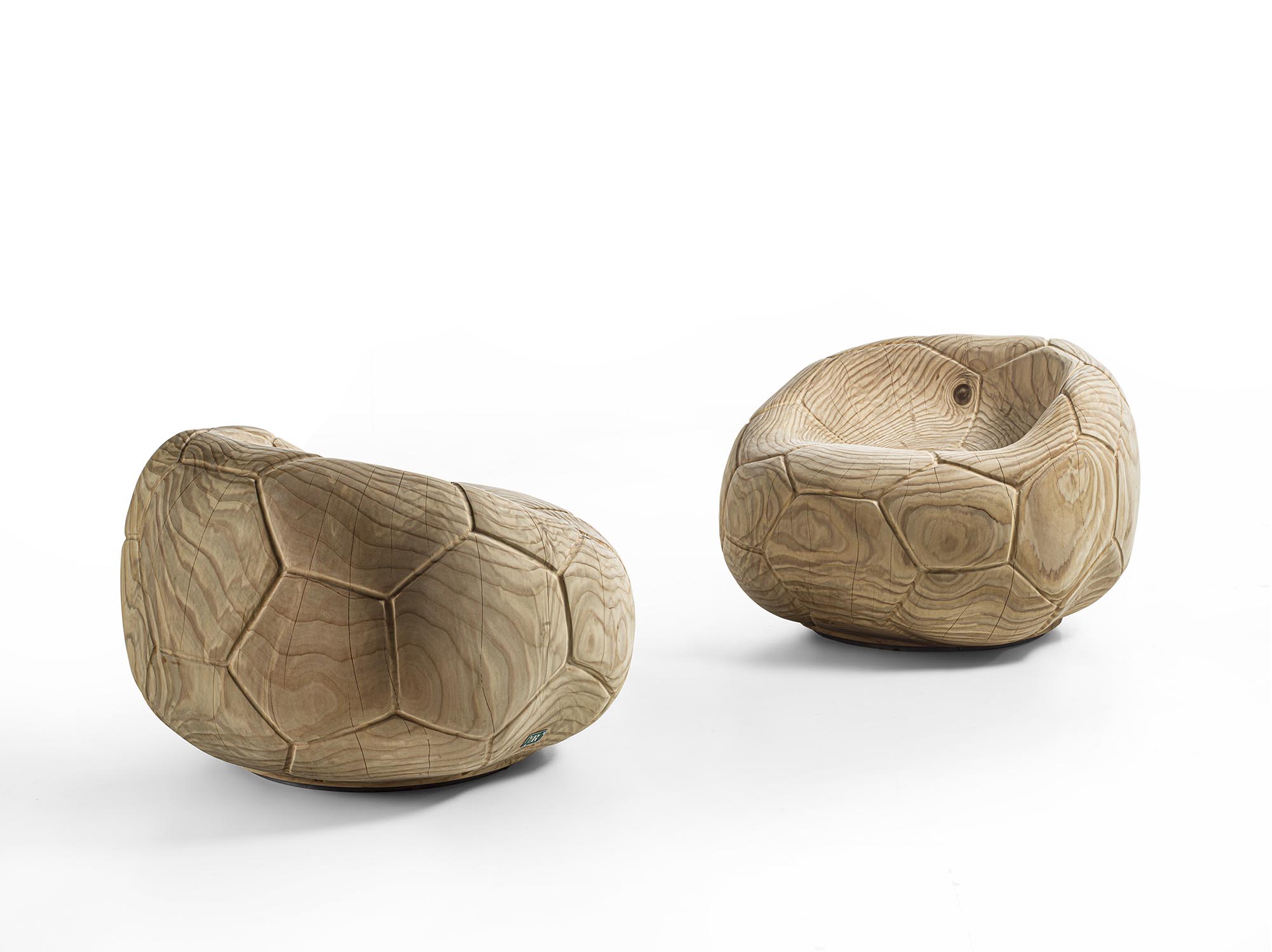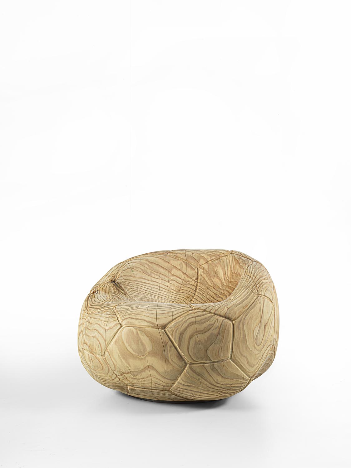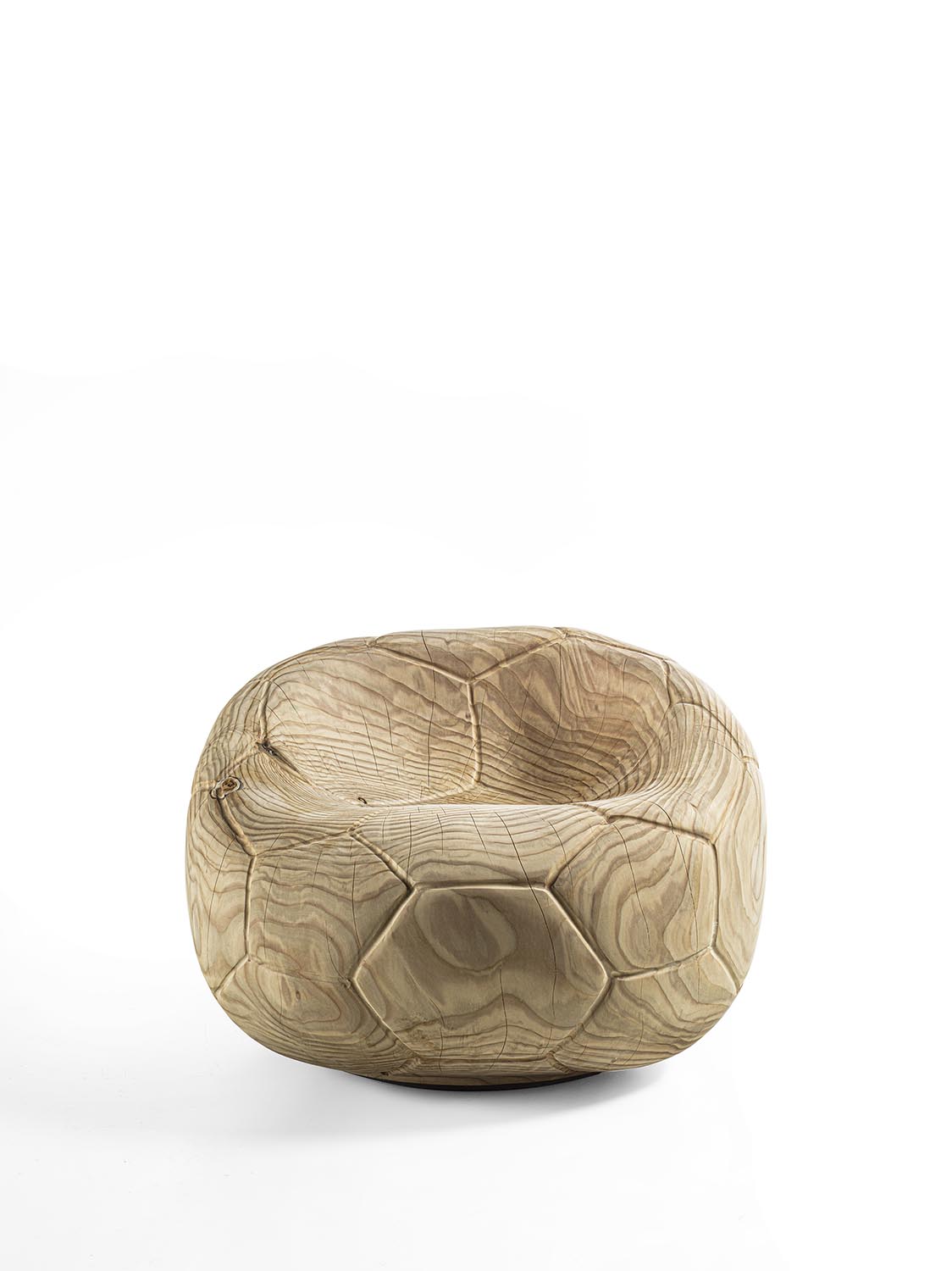 Drehsessel aus massivem, duftendem Zedernholz, aus einem einzigen Block geschnitzt. Ein skulpturaler Monolith mit geschwungenem, fließendem Design, der an die Form eines schlaffen Fußballs erinnert und auch das charakteristische sechseckige Muster auf der Oberfläche aufgreift. Die ergonomische Sitzfläche geht nahtlos in die Rückenlehne über und verbindet Komfort mit formaler Kontinuität.