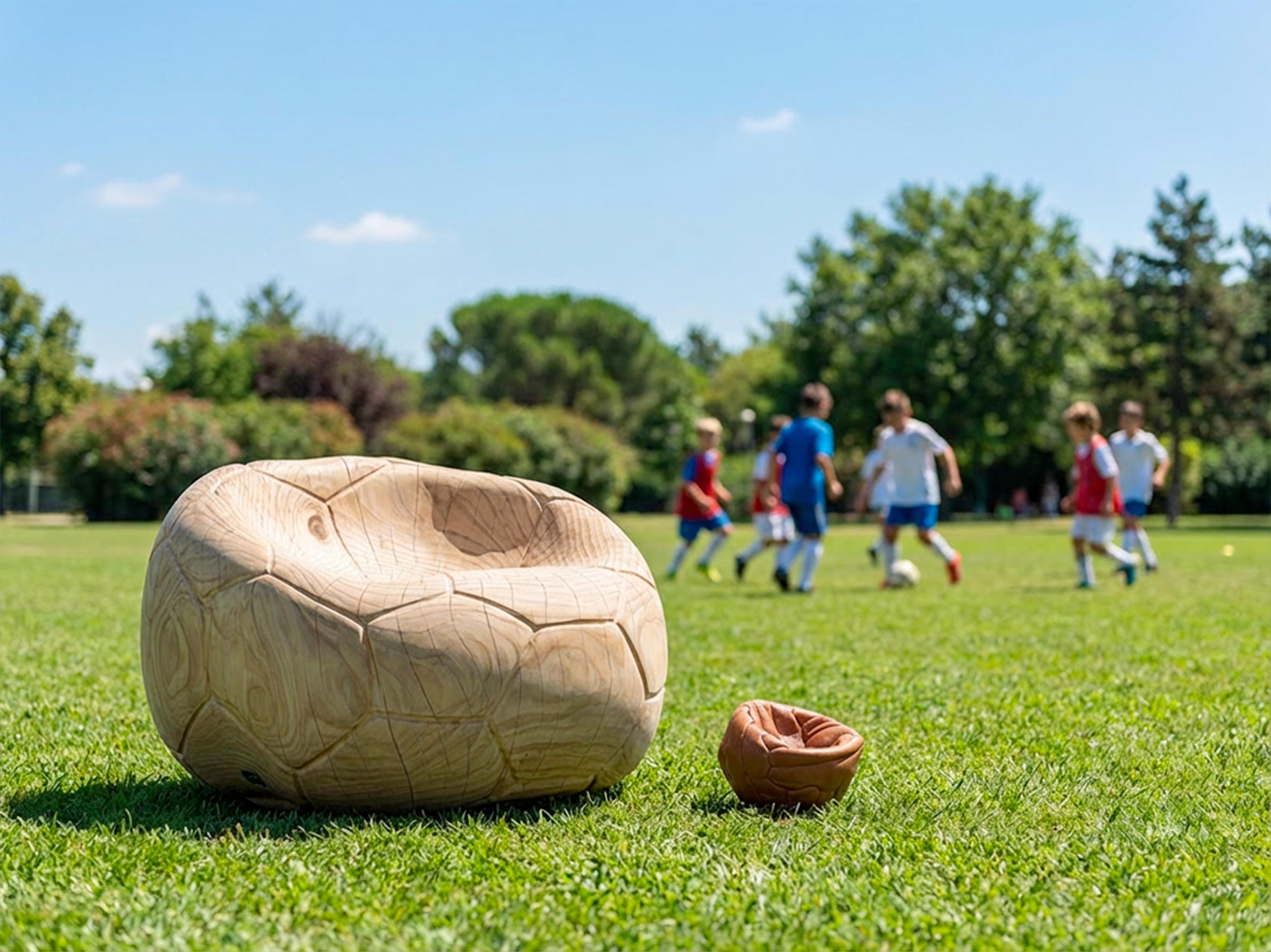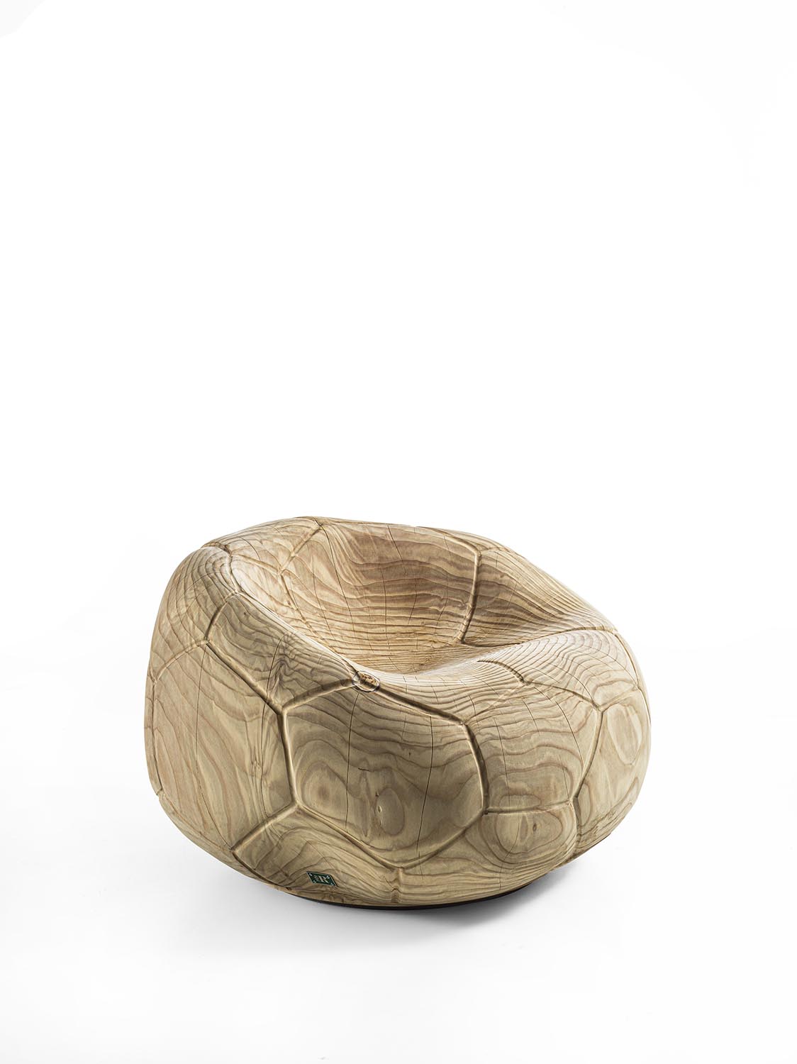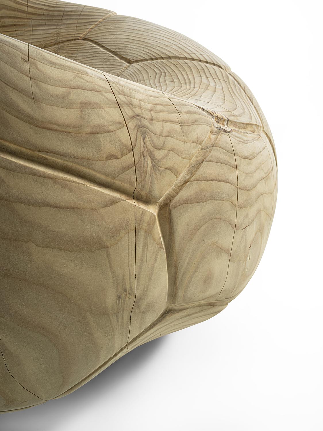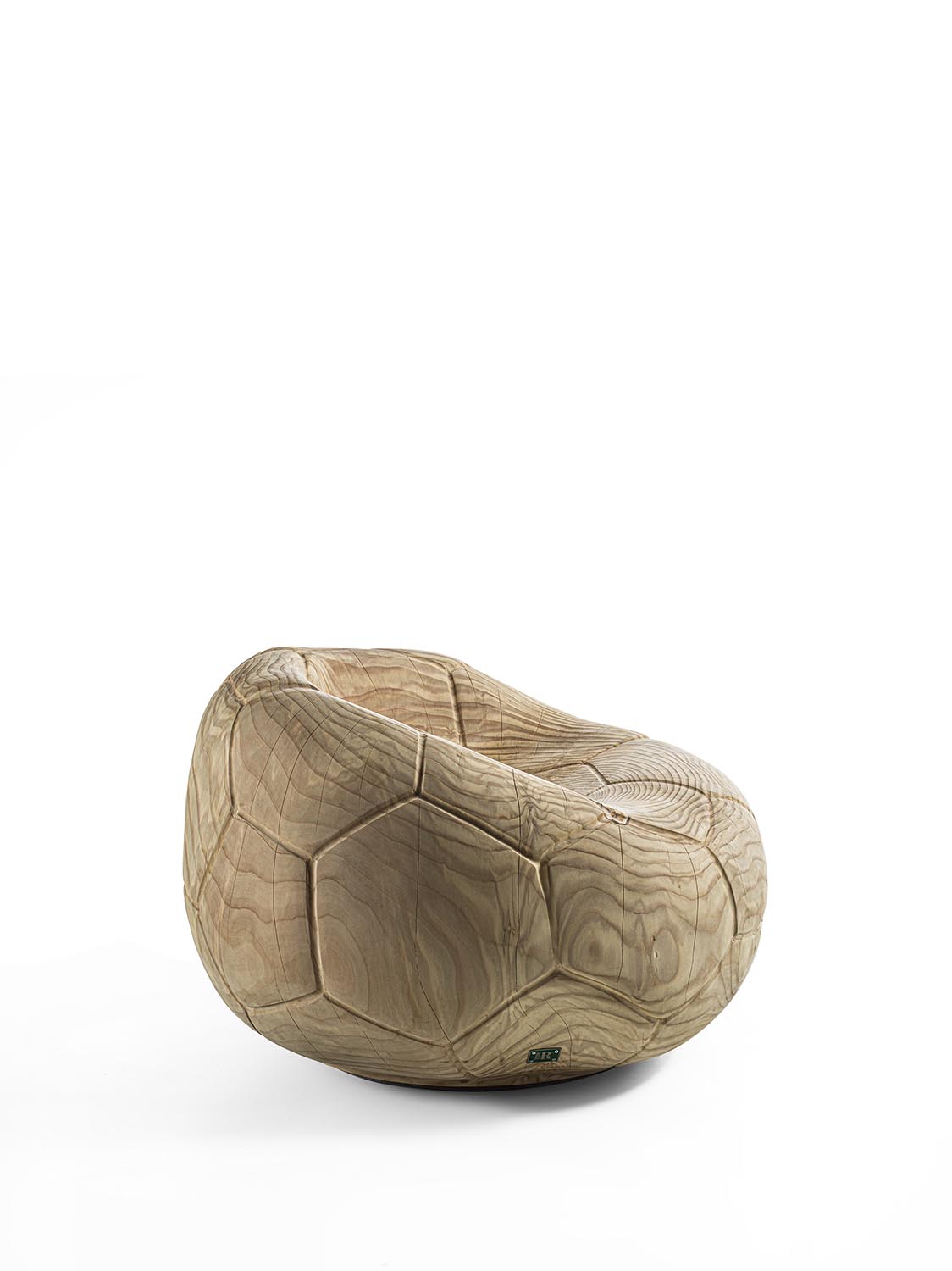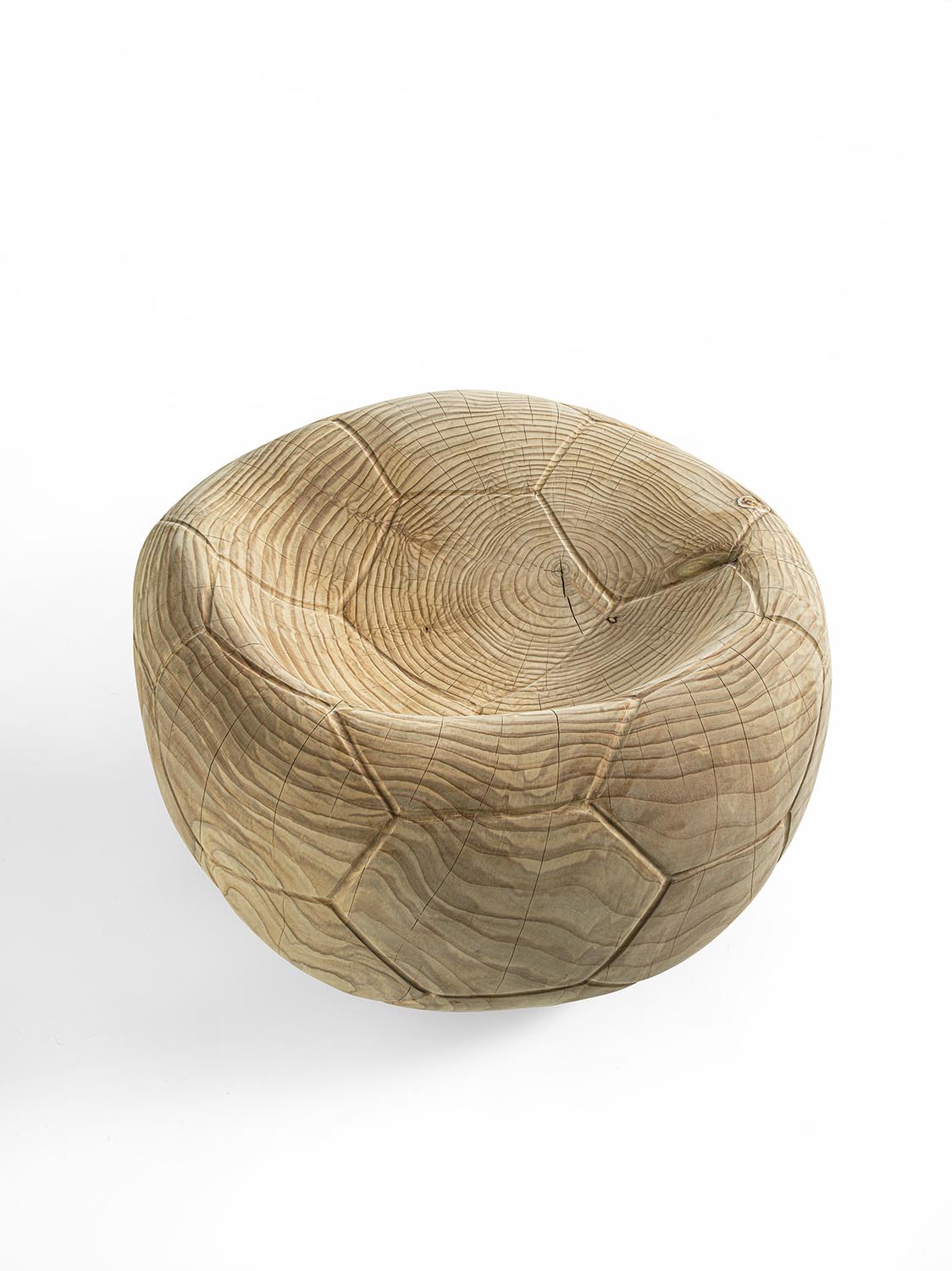Drehsessel aus massivem, duftendem Zedernholz, aus einem einzigen Block geschnitzt. Ein skulpturaler Monolith mit geschwungenem, fließendem Design, der an die Form eines schlaffen Fußballs erinnert und auch das charakteristische sechseckige Muster auf der Oberfläche aufgreift. Die ergonomische Sitzfläche geht nahtlos in die Rückenlehne über und verbindet Komfort mit formaler Kontinuität.