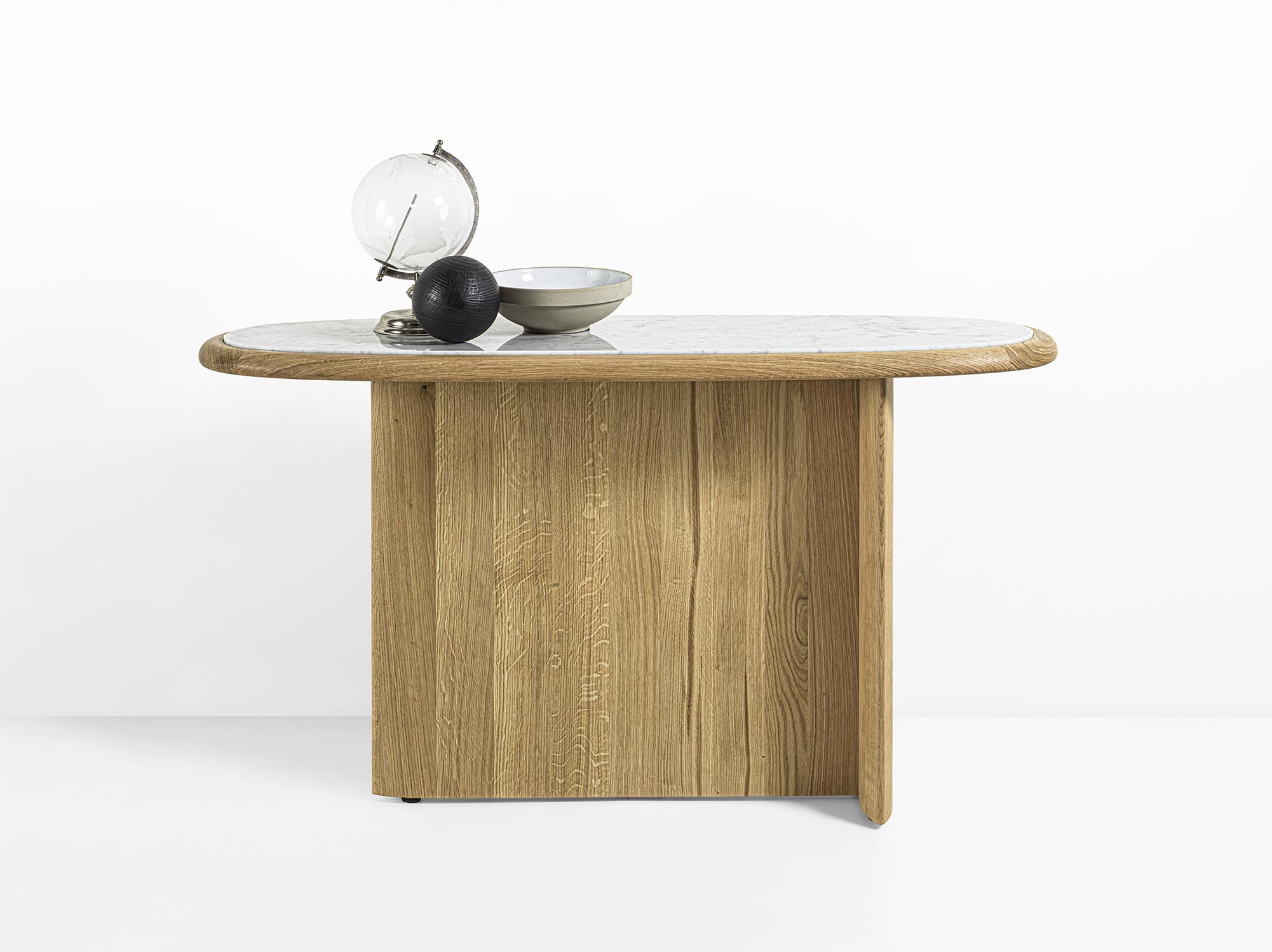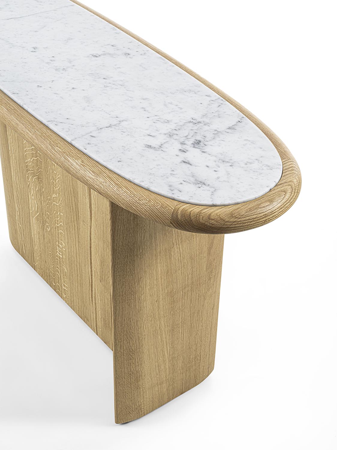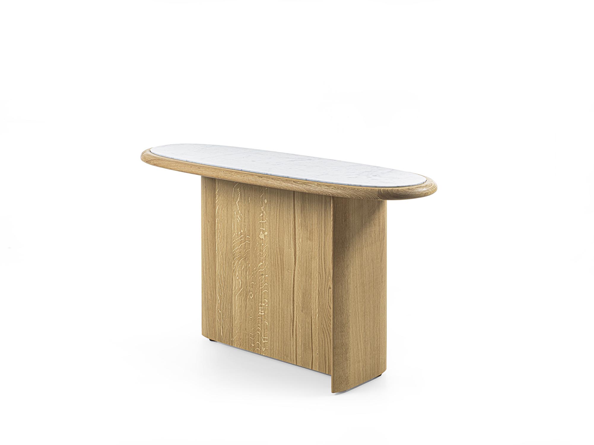 Konsole aus Massivholz, gekennzeichnet durch eine ovale Tischplatte und ein Gestell aus sich rechtwinklig kreuzenden Tragelementen, das ihren essenziellen, skulpturalen Charakter unterstreicht. Die Tischplatte ist in zwei Versionen erhältlich: vollständig aus Massivholz oder mit Marmoreinlage und Holzrahmen.