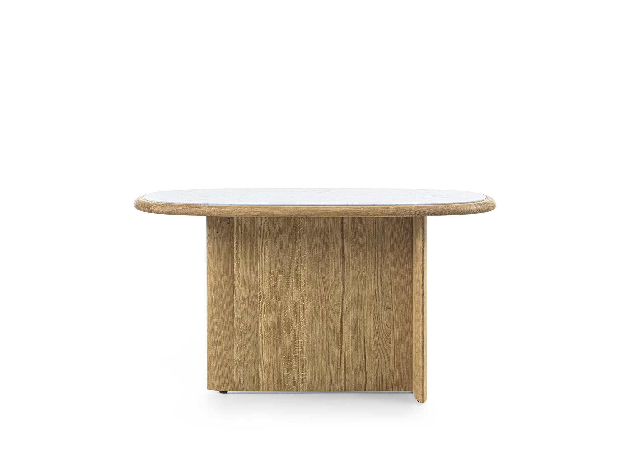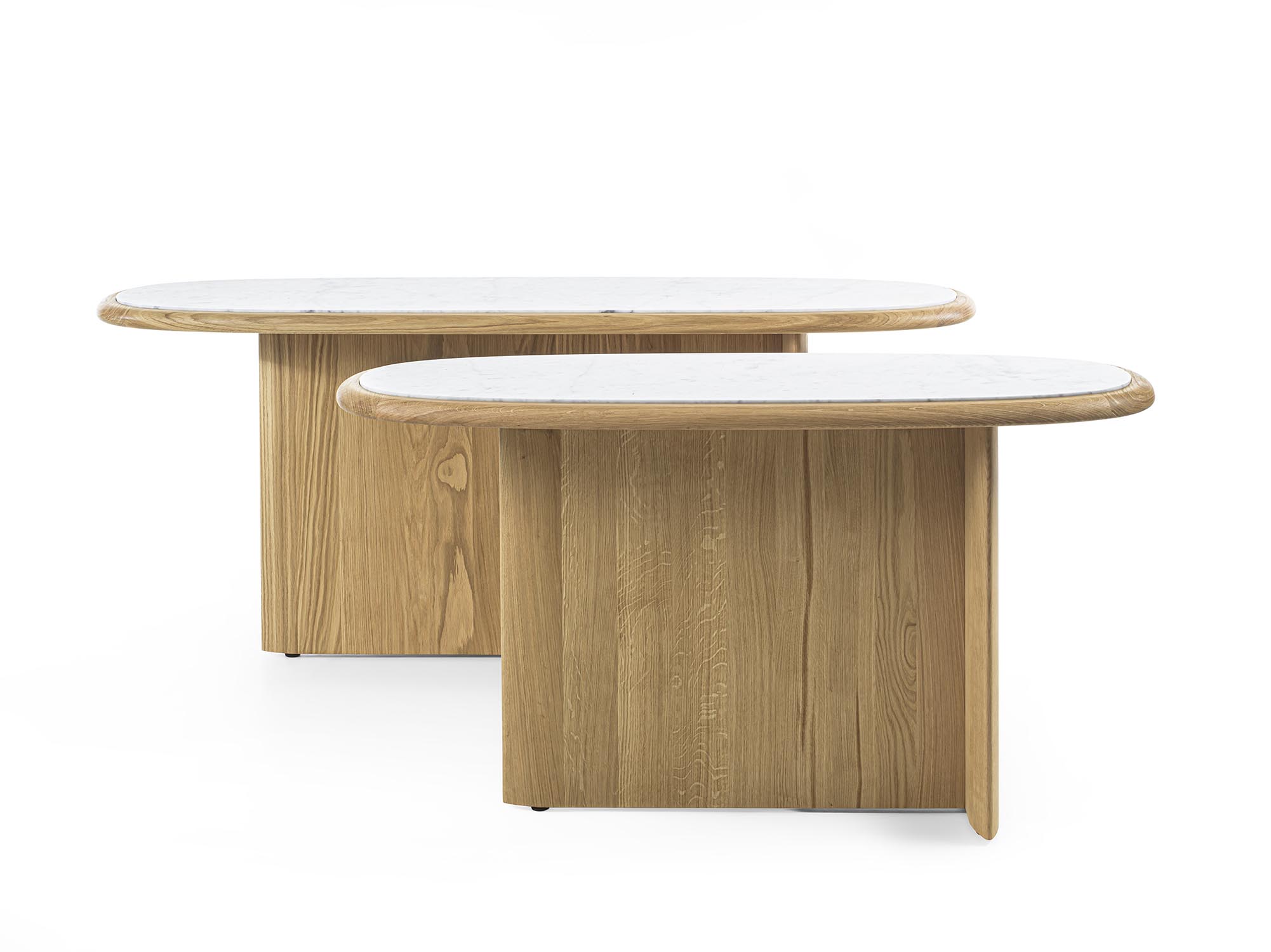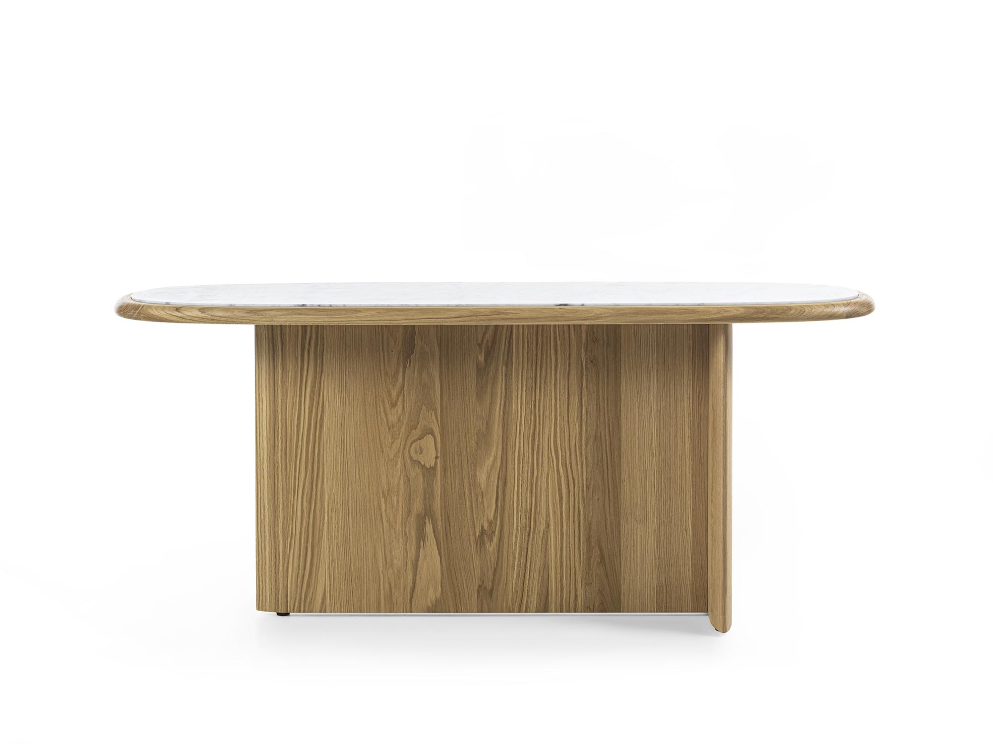 Konsole aus Massivholz, gekennzeichnet durch eine ovale Tischplatte und ein Gestell aus sich rechtwinklig kreuzenden Tragelementen, das ihren essenziellen, skulpturalen Charakter unterstreicht. Die Tischplatte ist in zwei Versionen erhältlich: vollständig aus Massivholz oder mit Marmoreinlage und Holzrahmen.