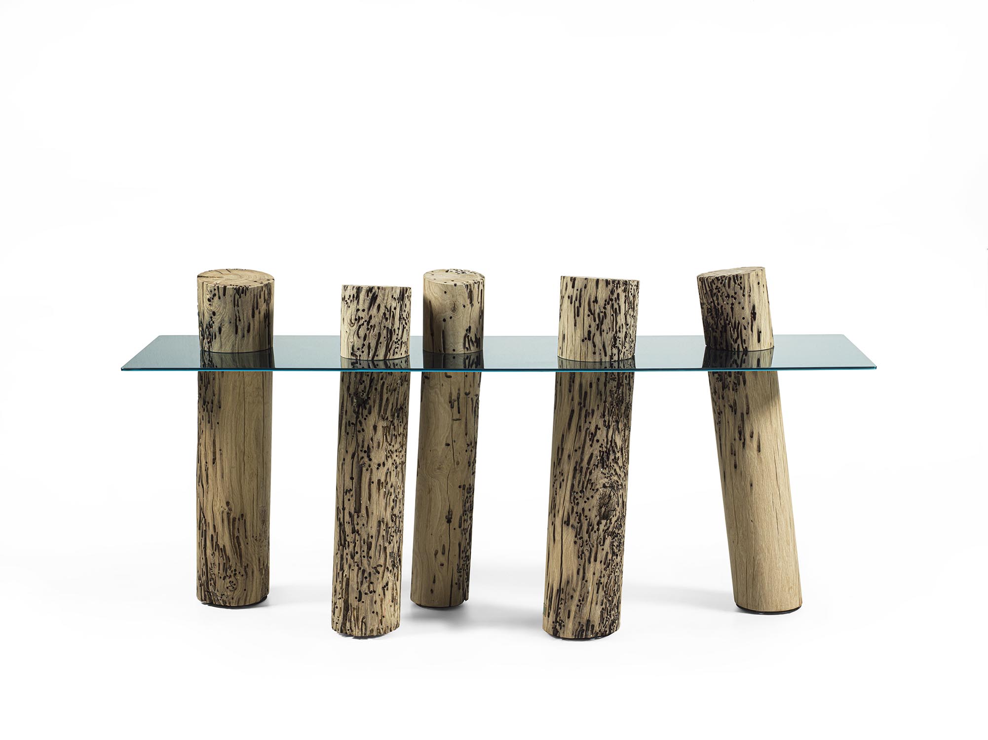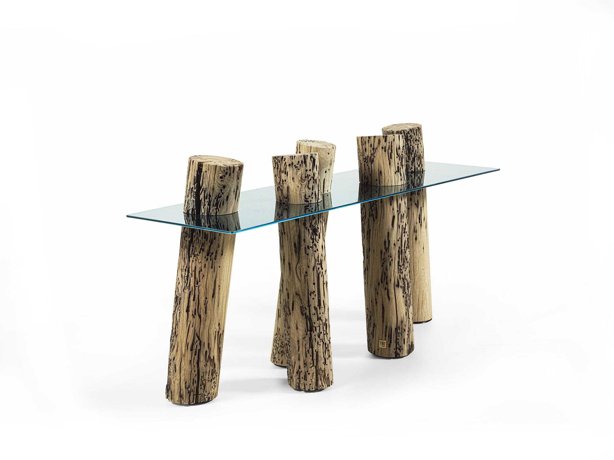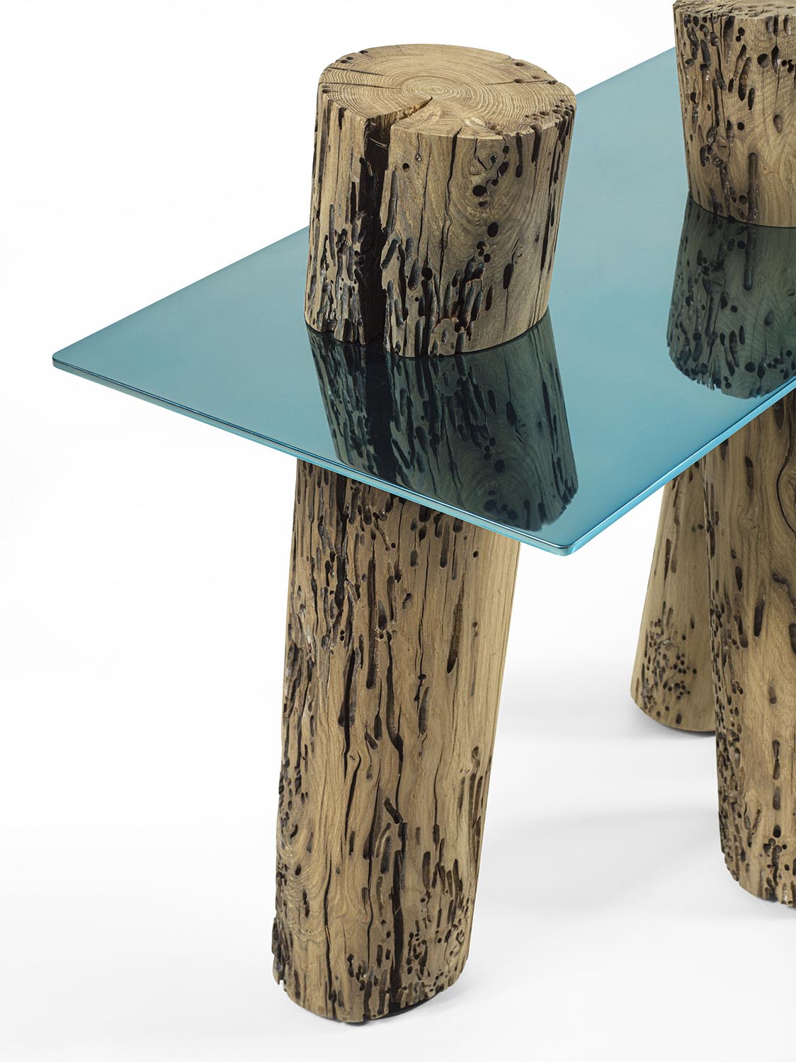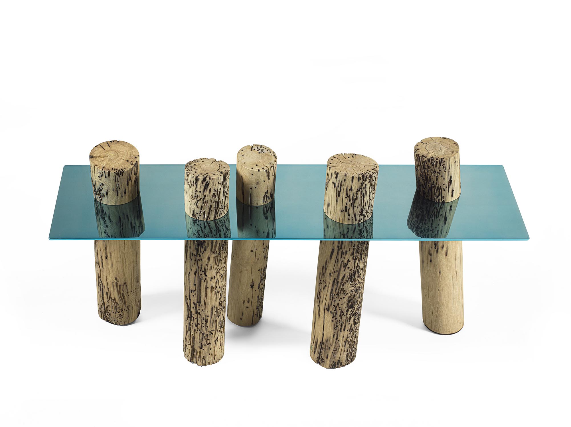 Neuauflage „100+6“ der ikonischen Konsole VENICE. Die Tischplatte aus hochglanzpoliertem Stahl mit spiegelnder, azurblauer Oberfläche wird mit einer Reihe von Massivholzpfosten aus Briccola kombiniert, gewonnen aus ausgemusterten Pfählen aus der Lagune von Venedig.