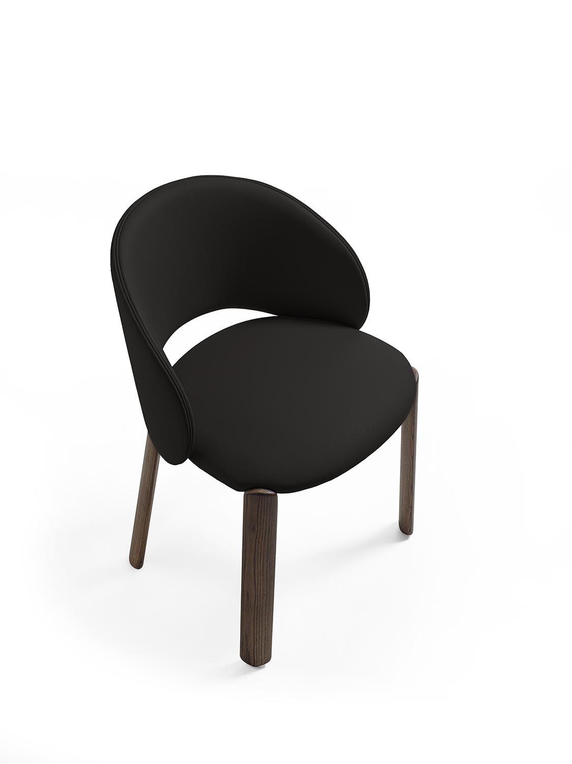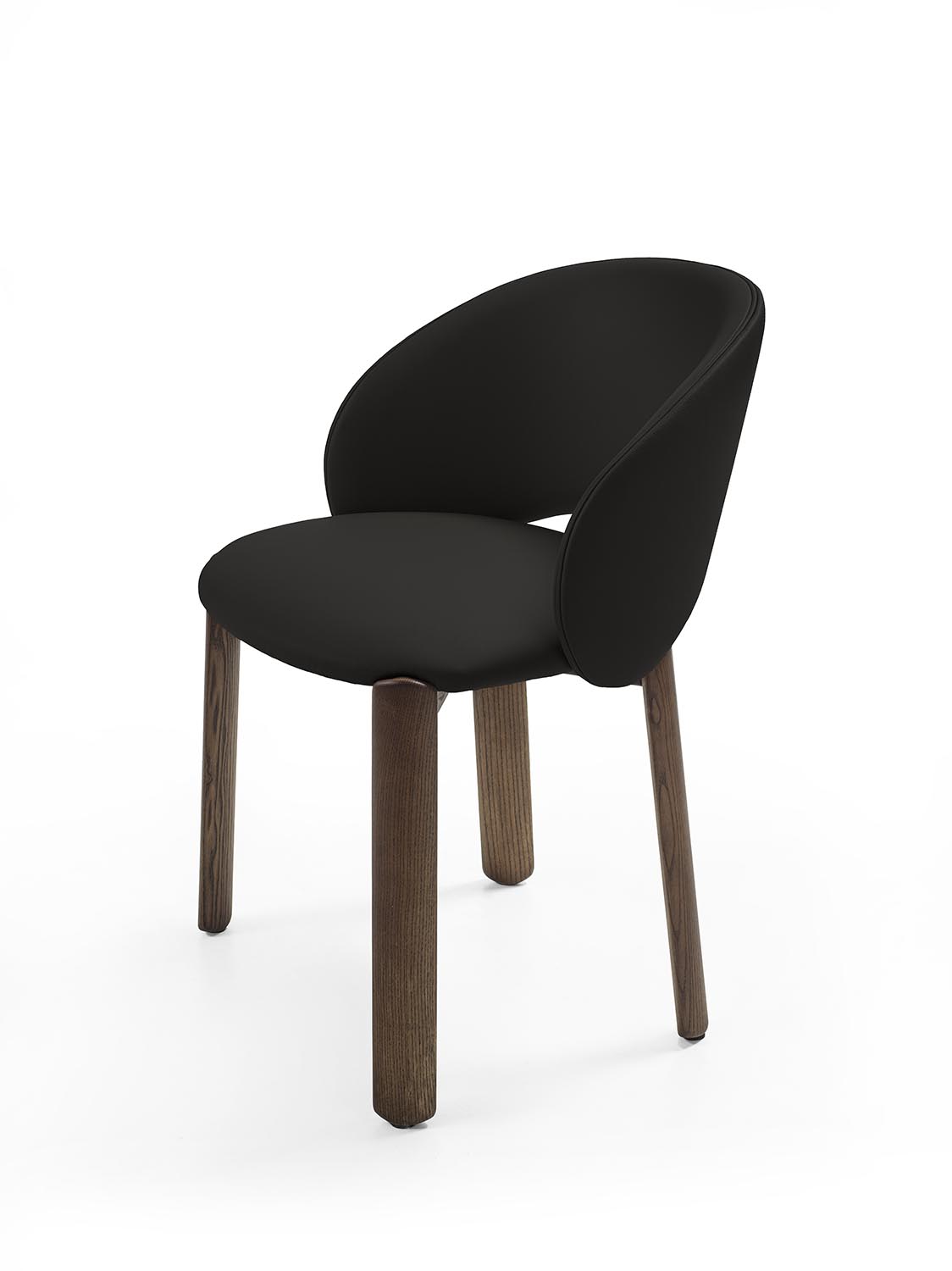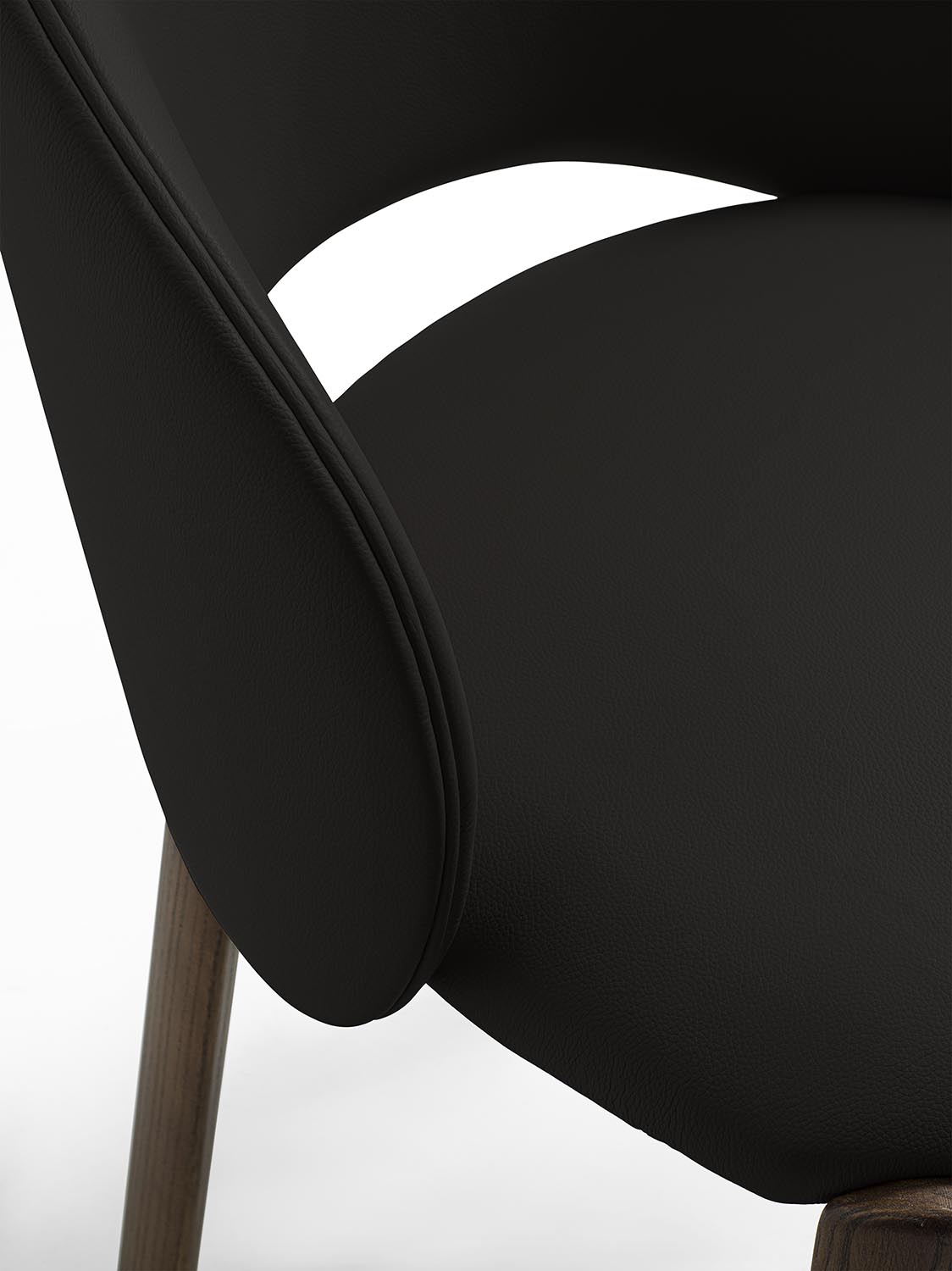 Stuhl mit Massivholzbeinen, geprägt von weichen Formen und abgerundeten Konturen. Die Rückenlehne geht nahtlos in die Armlehnen über. Sitzfläche und Rückenlehne sind in Leder oder Stoff erhältlich.