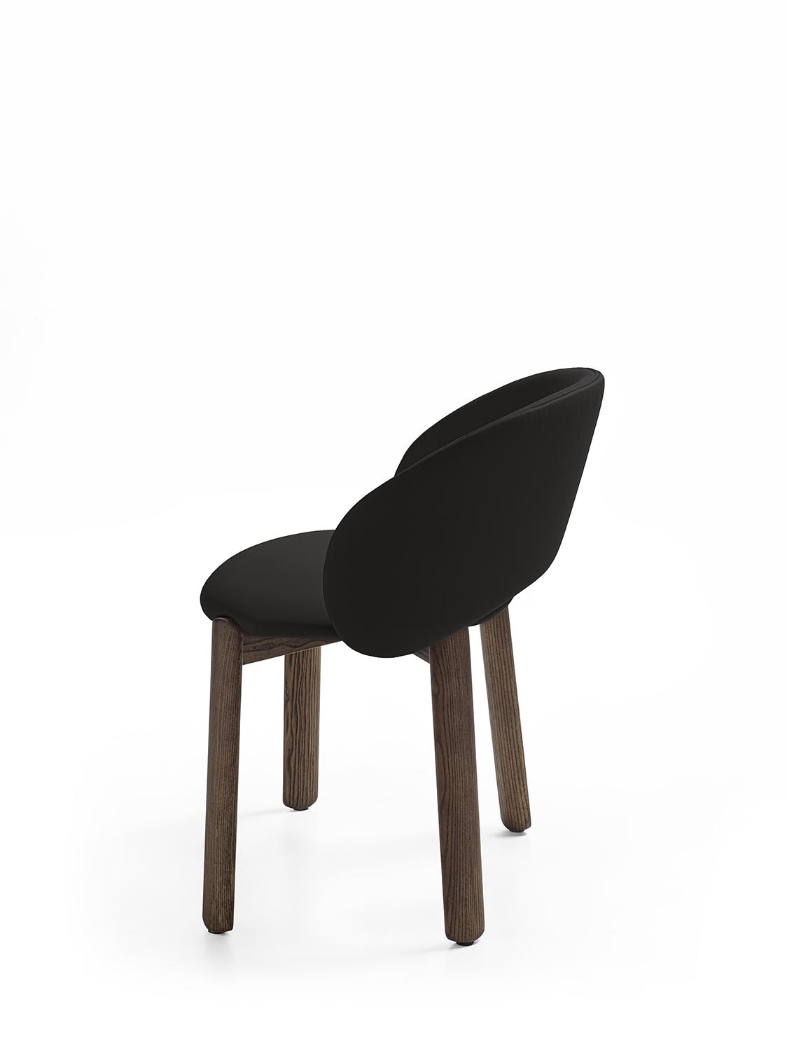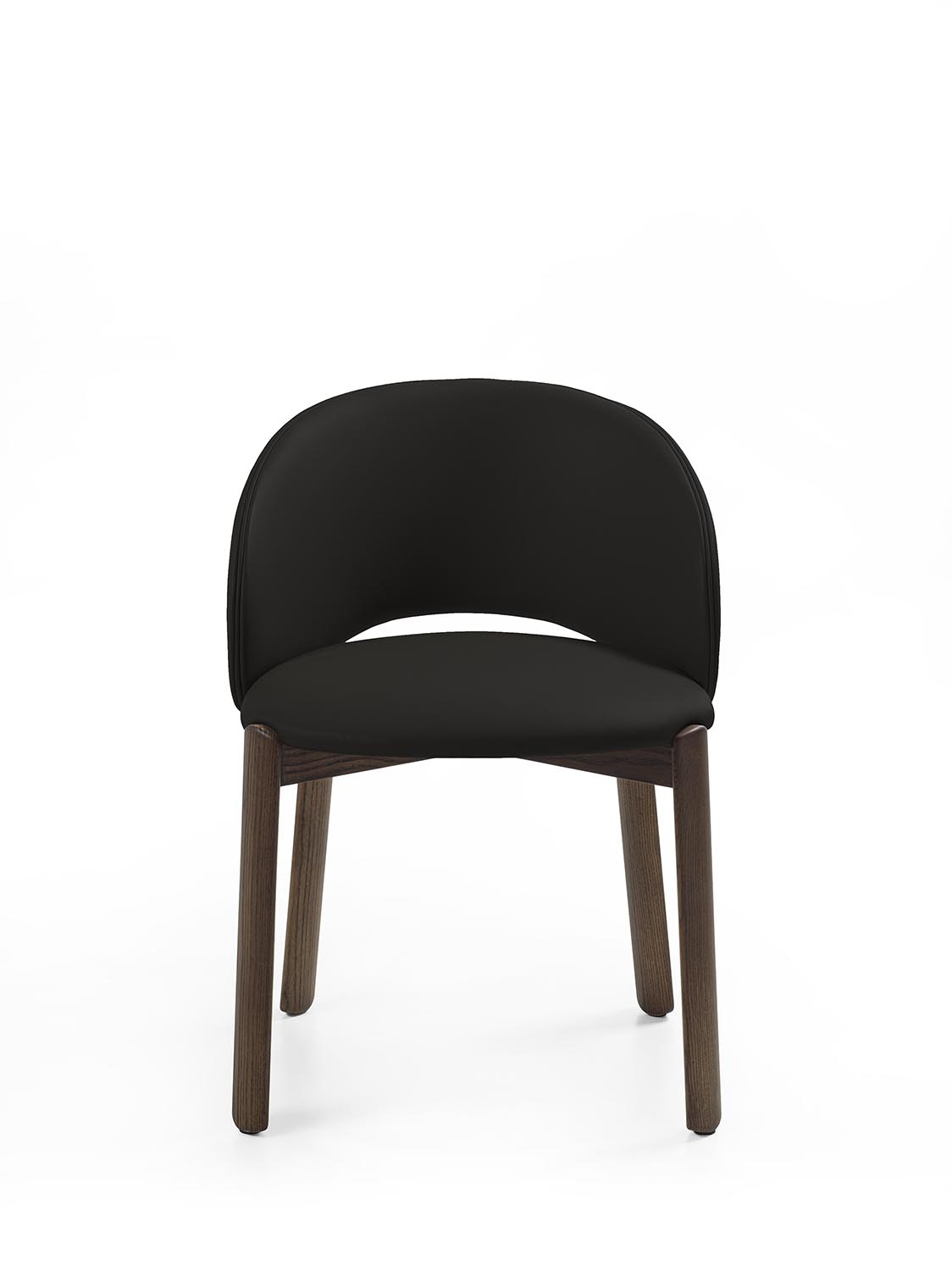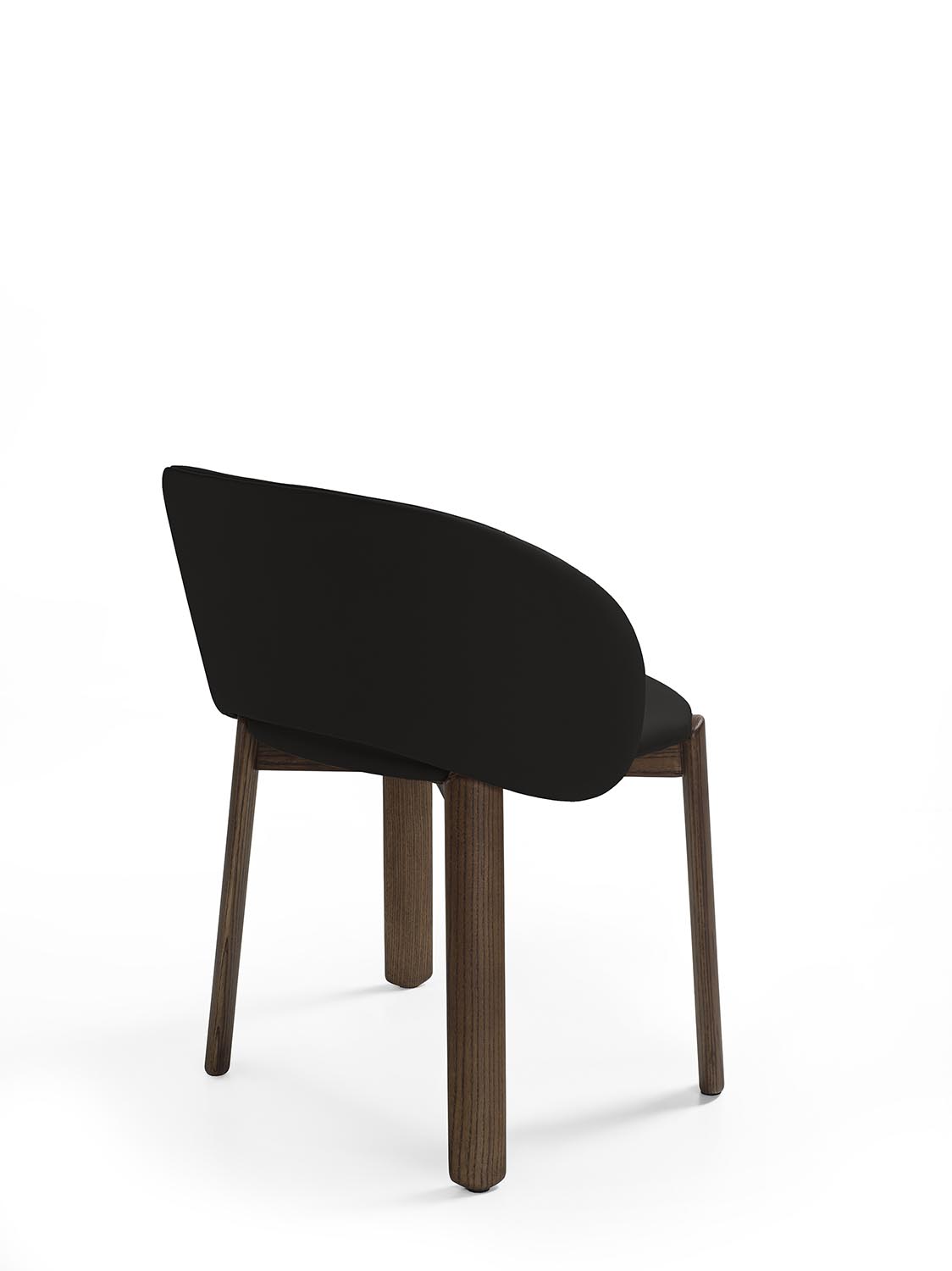Stuhl mit Massivholzbeinen, geprägt von weichen Formen und abgerundeten Konturen. Die Rückenlehne geht nahtlos in die Armlehnen über. Sitzfläche und Rückenlehne sind in Leder oder Stoff erhältlich.