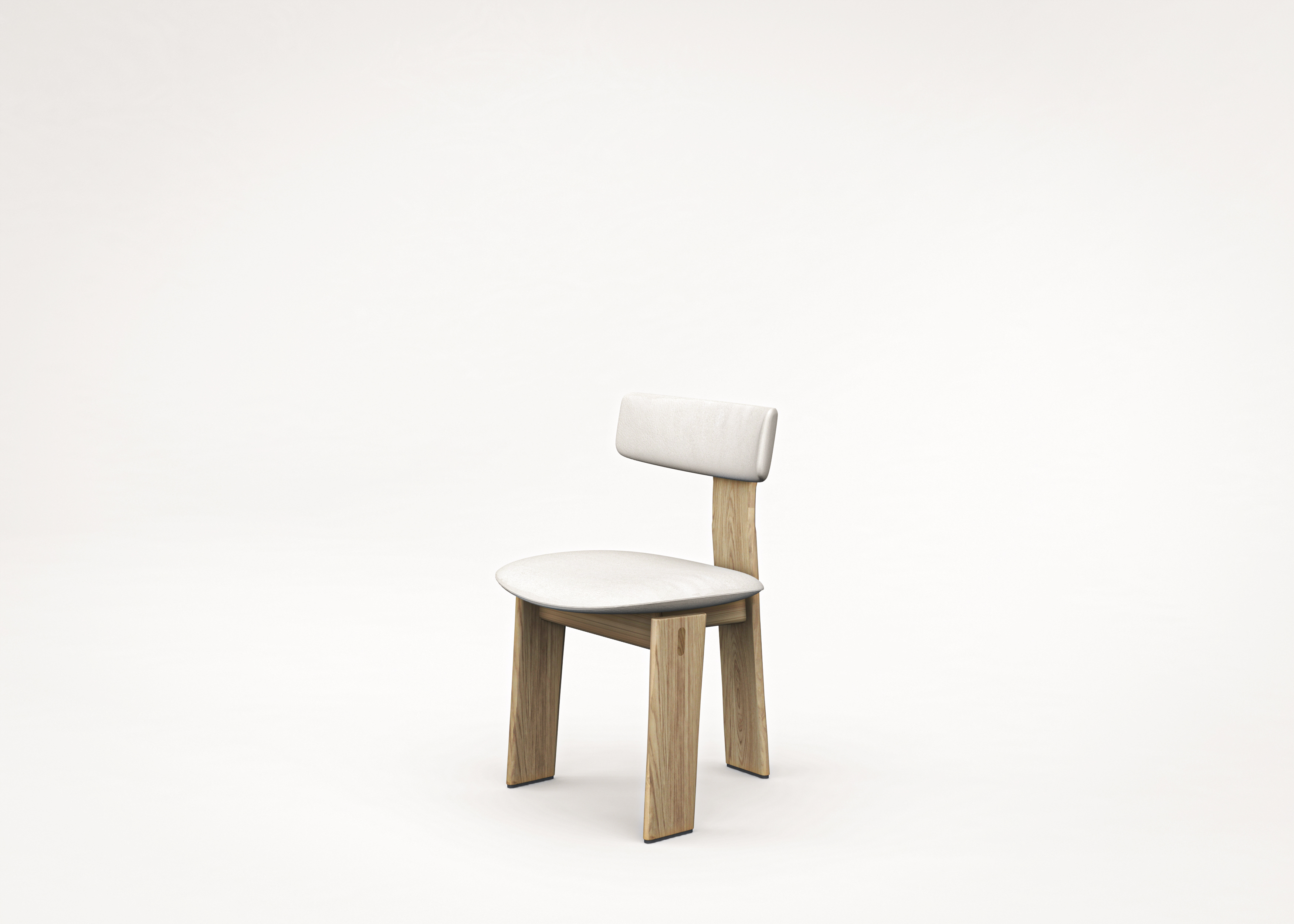 Stuhl mit Massivholzgestell, gekennzeichnet durch ein essenzielles Design. Die Originalität des Gestells mit drei sichtbaren Beinen findet ihr Gleichgewicht in den abgerundeten Kurven und zylindrischen Querschnitten. Sitzfläche und Rückenlehne aus gebogenem Sperrholz, gepolstert und in Leder oder Stoff bezogen, sind über separate Elemente in die Struktur integriert und definieren so die konstruktive Identität des Stuhls.