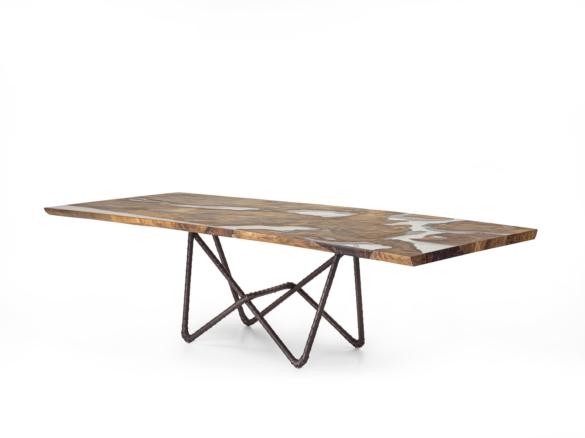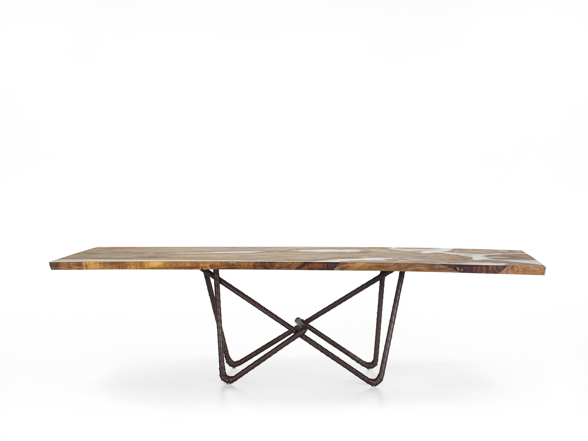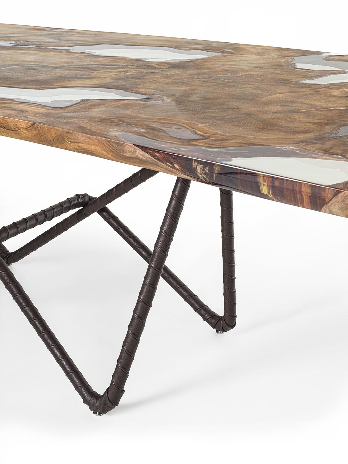 Neuauflage „100+6“ des ikonischen Tisches KAURI PIANO ANTICO. Charakterisiert durch eine Tischplatte aus massivem Kauri-Holz. Das Untergestell aus Rohrstahl ist vollständig mit Cristal-Leder in der Farbe Testa di Moro bezogen und bildet eine klare, reduzierte Struktur, die den materiellen Kontrast zwischen Platte und Gestell hervorhebt.