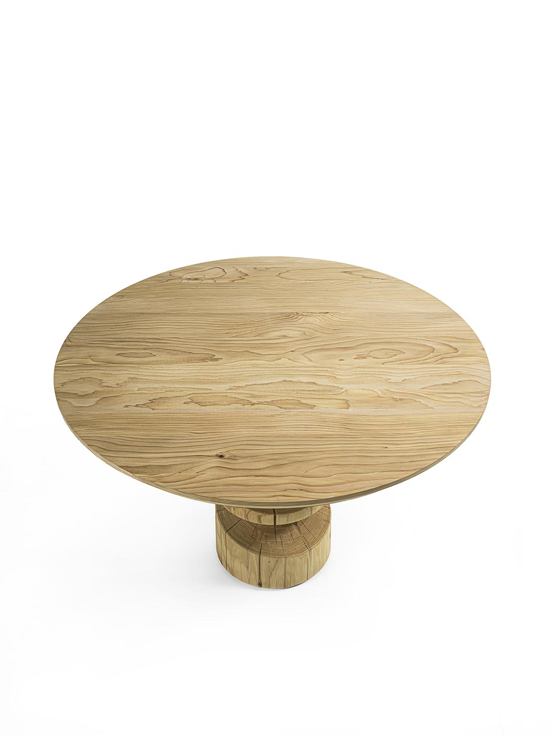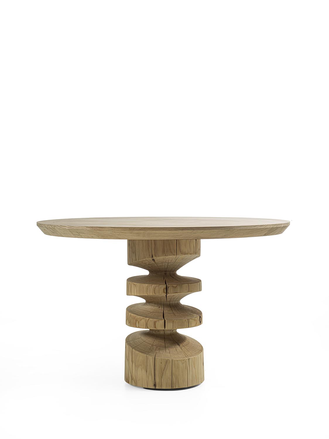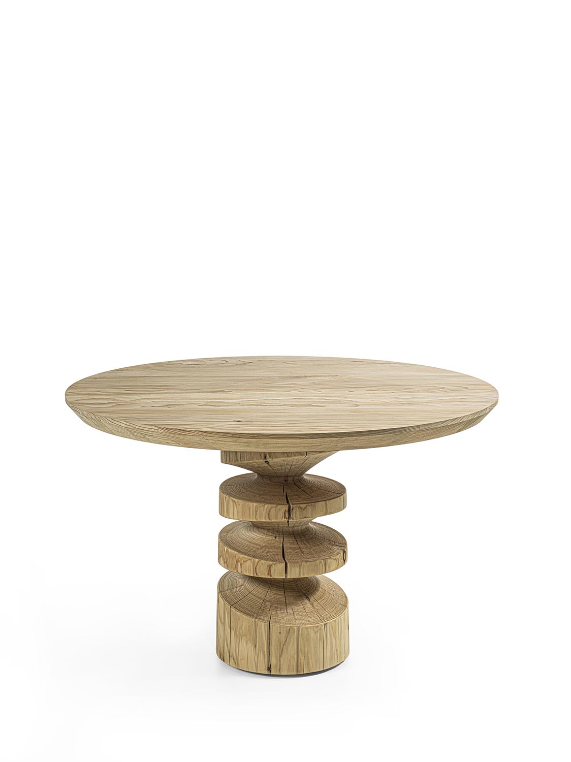 Tisch mit Tischplatte aus verleimten Massivholzleisten aus Zedernholz. Das Untergestell, ebenfalls aus massivem Zedernholz aus einem einzigen Block gefertigt, besteht aus übereinander gestapelten geometrischen Volumen, die von der Form eines Tornados inspiriert sind. Sie erzeugen ein Spiel von Kontrasten und bilden eine skulpturale, materiell und formal eindrucksvolle Stützkonstruktion.