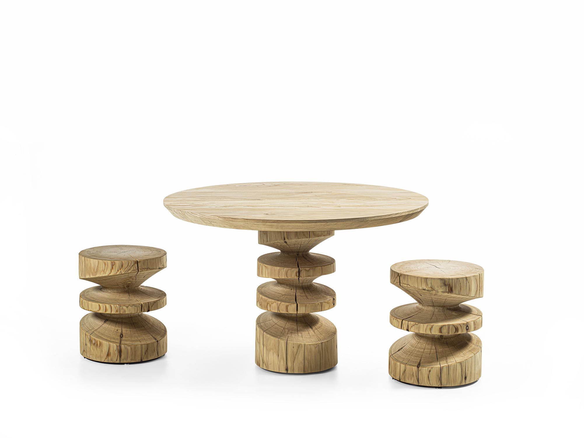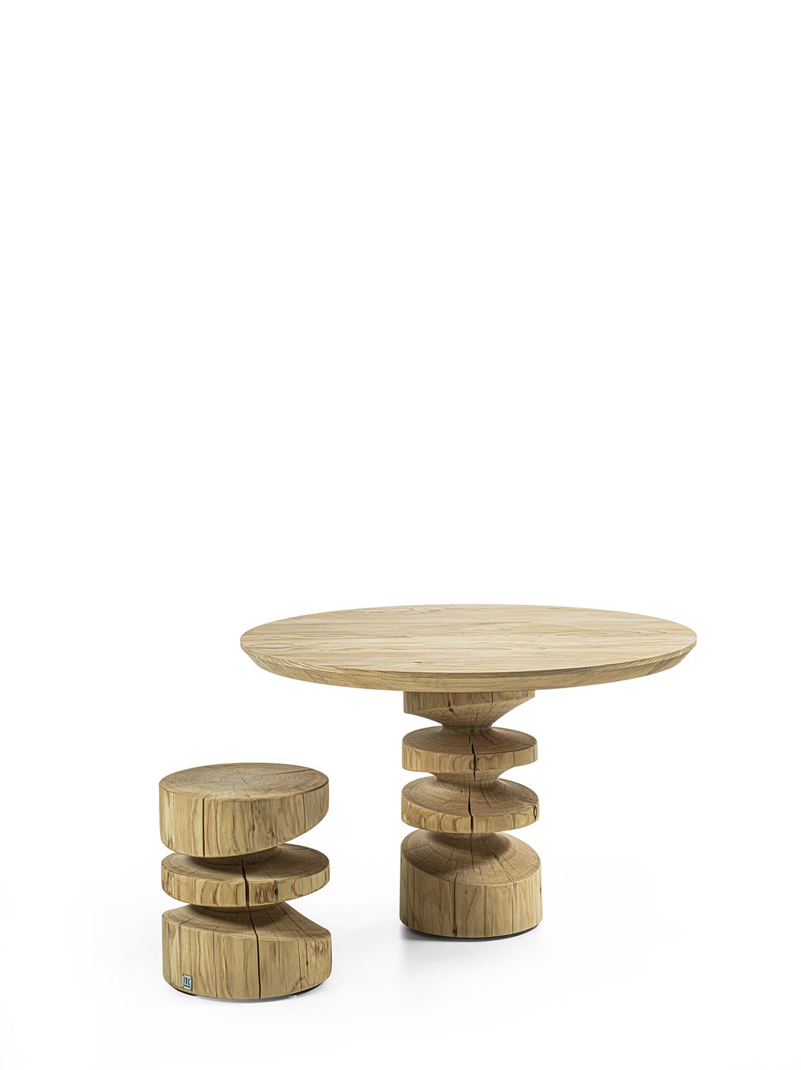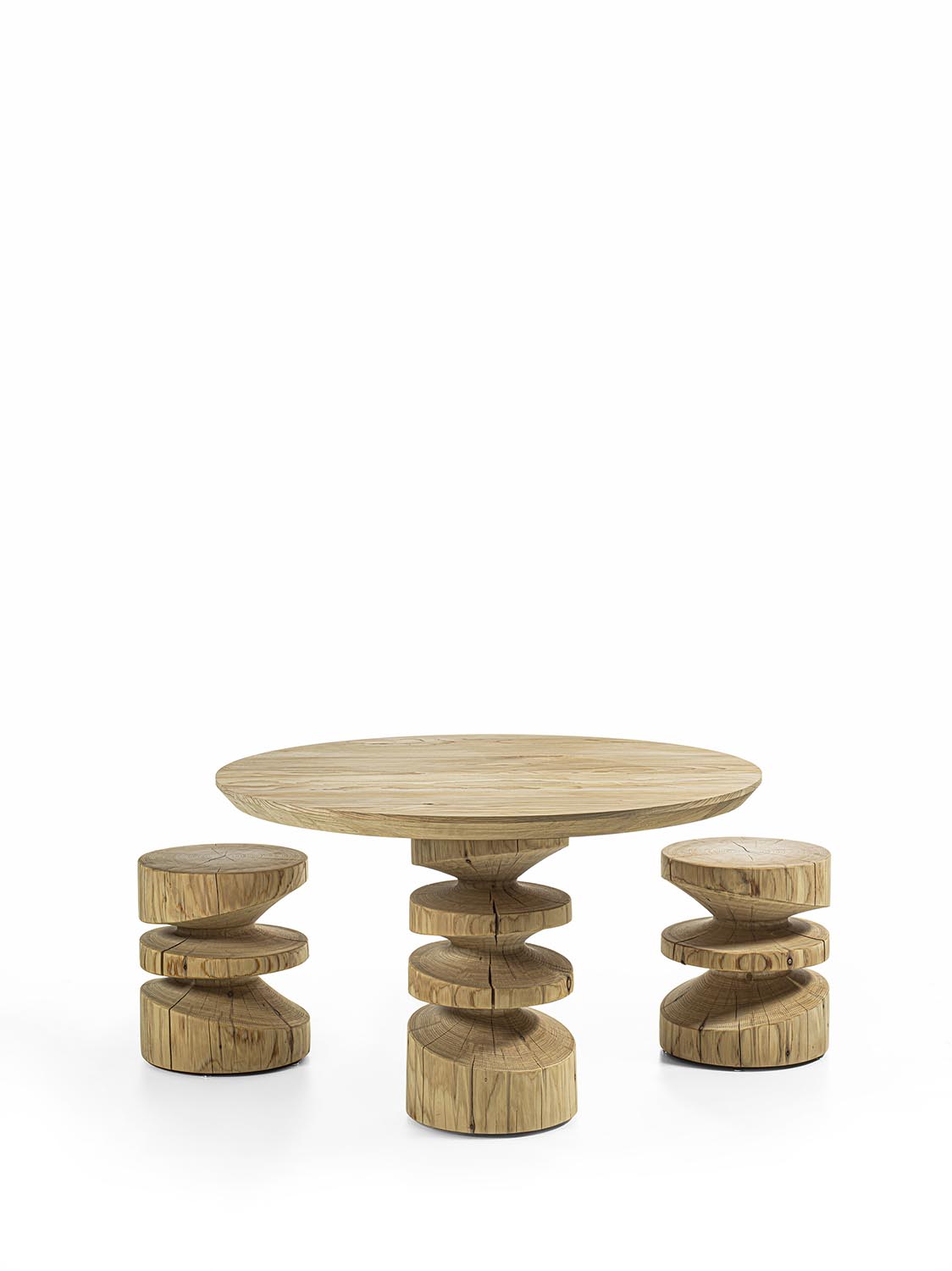 Tisch mit Tischplatte aus verleimten Massivholzleisten aus Zedernholz. Das Untergestell, ebenfalls aus massivem Zedernholz aus einem einzigen Block gefertigt, besteht aus übereinander gestapelten geometrischen Volumen, die von der Form eines Tornados inspiriert sind. Sie erzeugen ein Spiel von Kontrasten und bilden eine skulpturale, materiell und formal eindrucksvolle Stützkonstruktion.