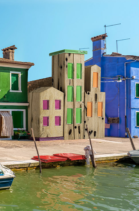 The Cities Collection expands with a new chapter inspired by one of Riva1920’s most iconic reclaimed materials: the Briccole of Venice. Taking this symbol of the lagoon as a starting point, Authentic Design chose to work with colour to pay homage to the island of Burano—renowned worldwide for its vibrant houses and architectural charm, which draw visitors from across the globe every year.