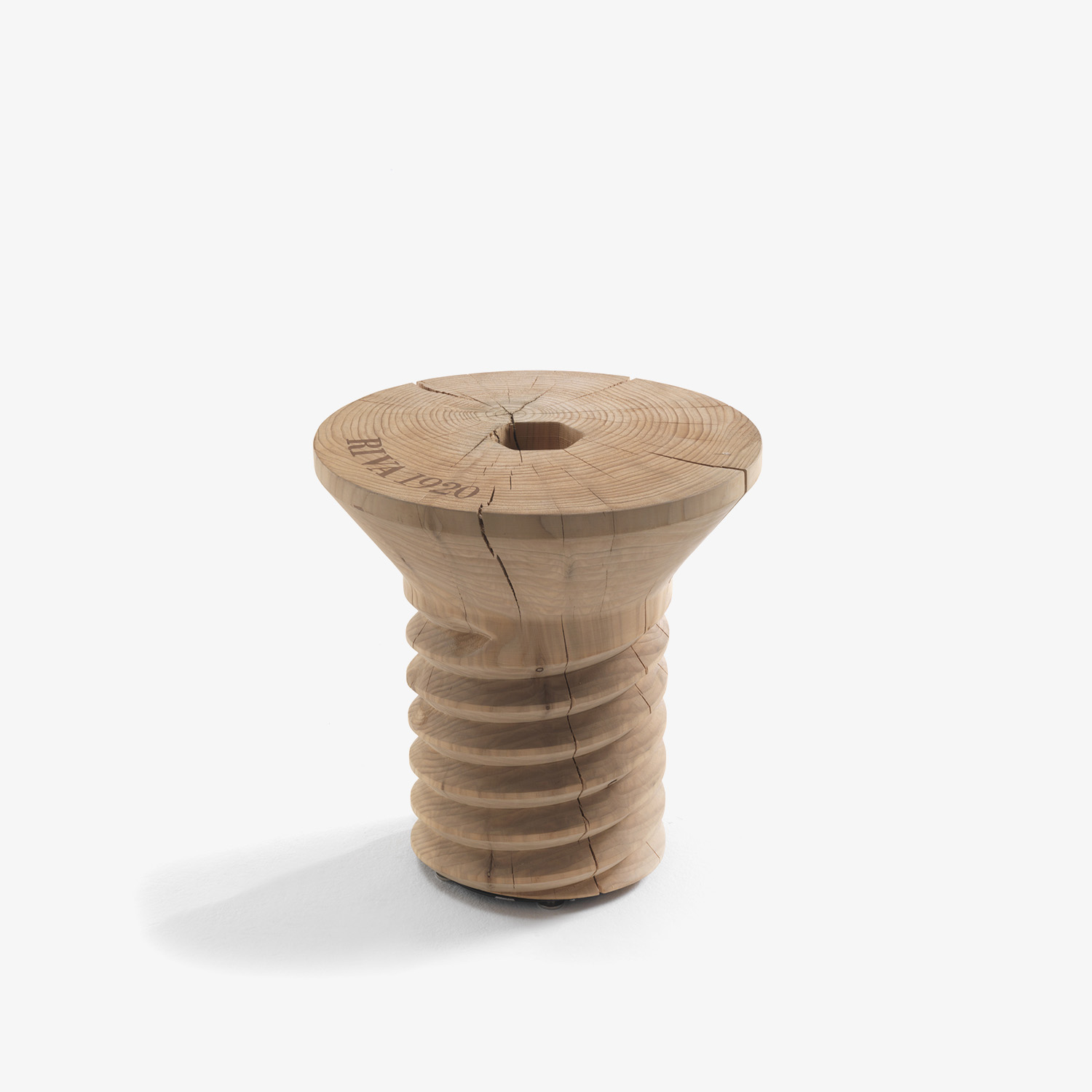 Armchair made from a single block of scented cedar. Distinguished by its squared lines and ergonomic seat.