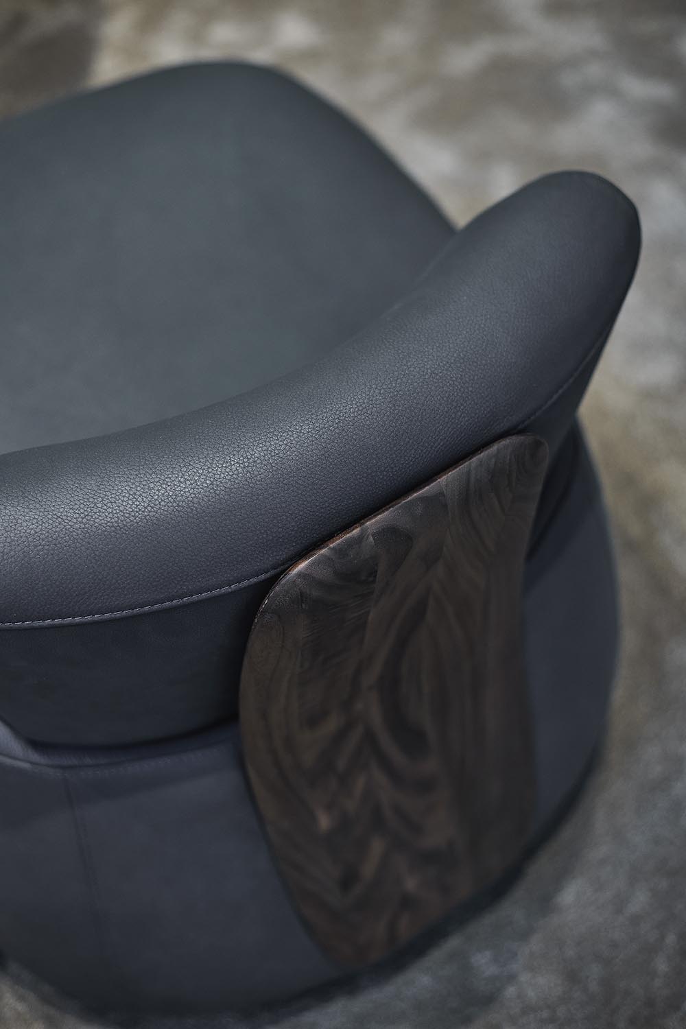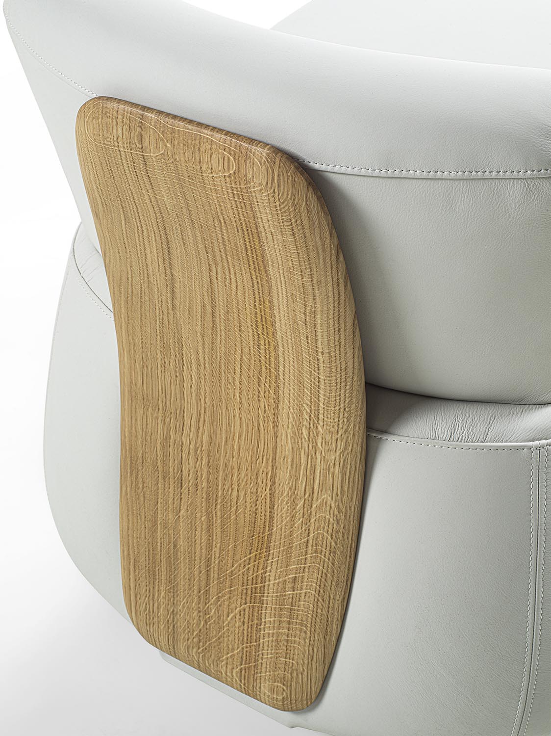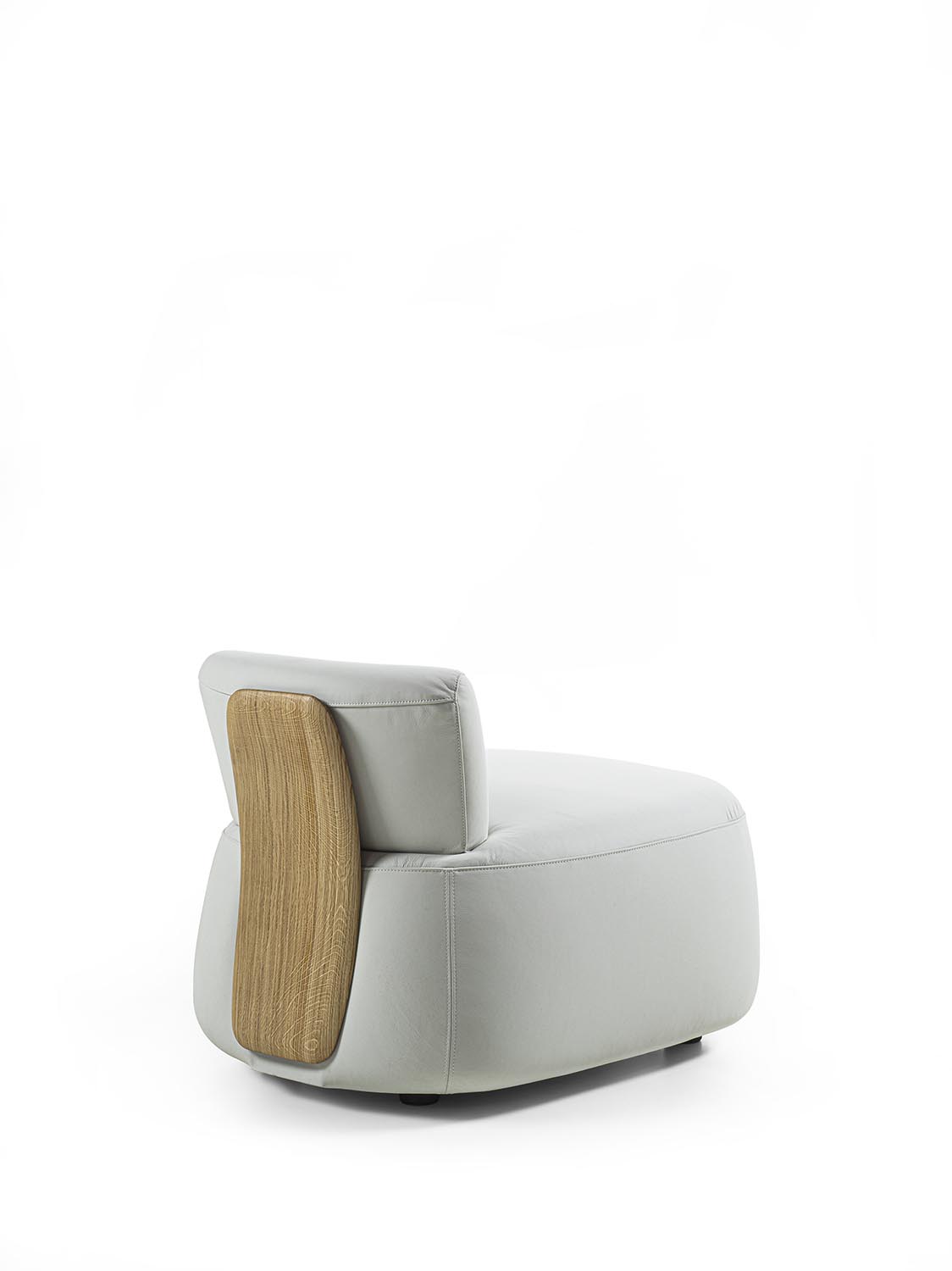 Upholstered armchair with fabric or leather covering, distinguished by a distinctive solid wood backrest that serves as both a structural and decorative element. The solid and sinuous wooden frame connects the backrest to the seat, creating a visual and functional dialogue between the two upholstered volumes. The design explores the contrast between the welcoming softness of the padded seat and backrest and the material strength of the wood.