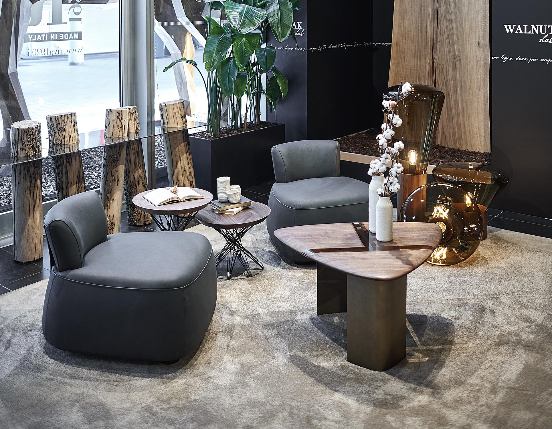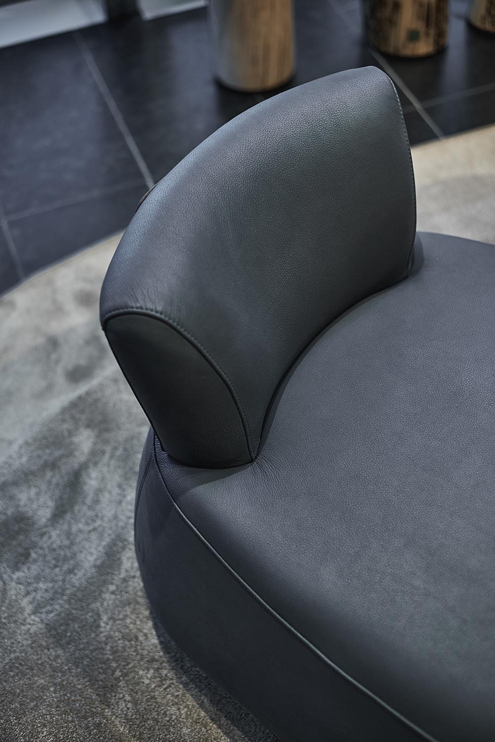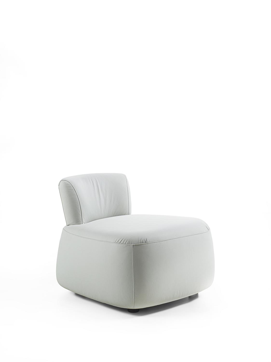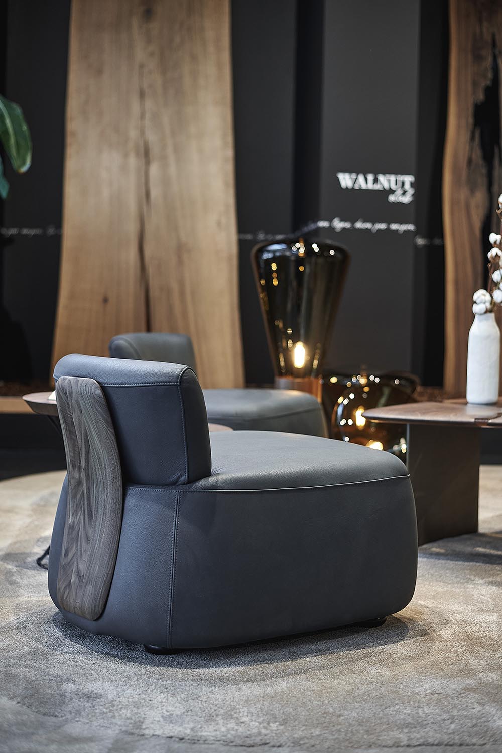 Upholstered armchair with fabric or leather covering, distinguished by a distinctive solid wood backrest that serves as both a structural and decorative element. The solid and sinuous wooden frame connects the backrest to the seat, creating a visual and functional dialogue between the two upholstered volumes. The design explores the contrast between the welcoming softness of the padded seat and backrest and the material strength of the wood.