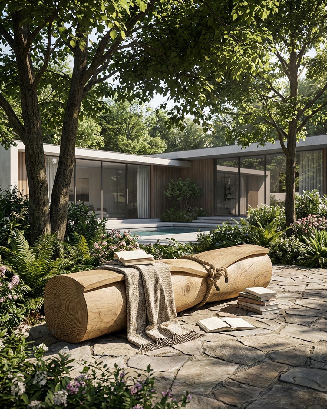 Bench in solid scented cedar wood, carved from a single block. The design stands out for its sinuous, enveloping shape, inspired by a rolled-up sheet of paper, which creates a contrast between the solidity of the solid wood and the visual perception of lightness and softness. A slightly off-centre nautical rope detail emphasises this effect, giving the idea of holding the volume in an enveloped position.