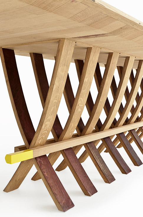 Riva1920 redonne vie à ces barriques avec une sensibilité artisanale qui met en valeur chaque signe du temps. Après l'ouverture des fûts, les douelles sont travaillées en dix jours, les transformant en meubles qui portent en eux la mémoire du vin et le savoir-faire du travail manuel.