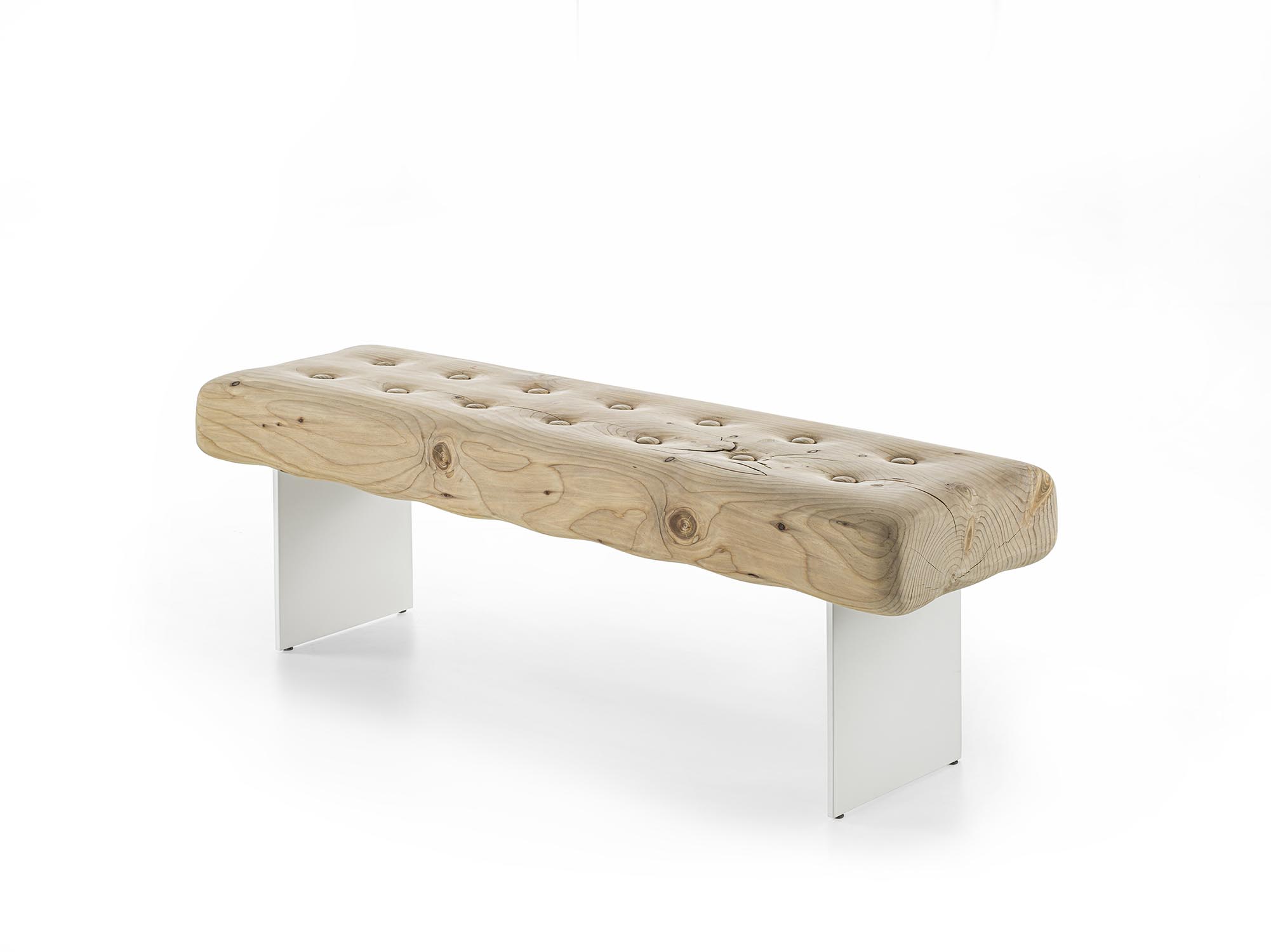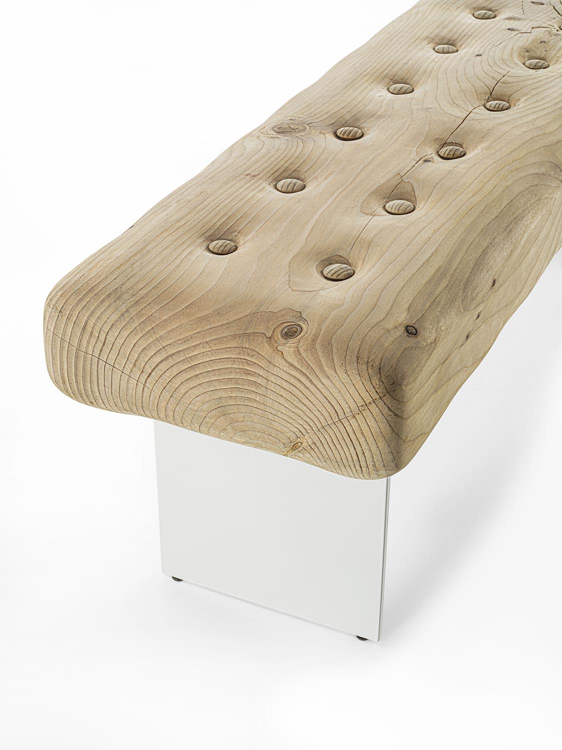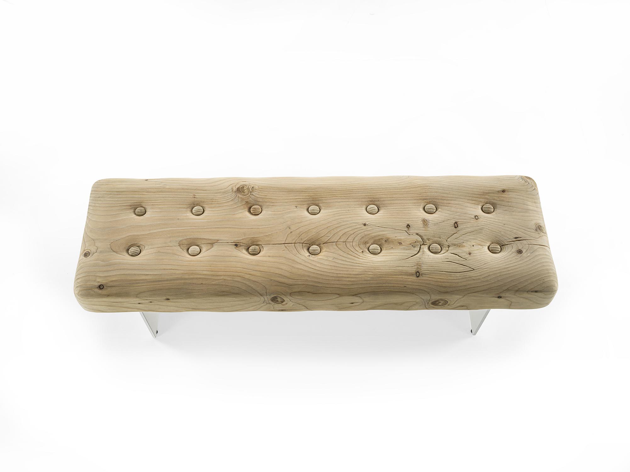 Banc en bois de cèdre massif odoriférant, fabriqué à partir d’un seul bloc, caractérisé par une assise qui rappelle la forme d'un matelas, créant un contraste avec l'idée de douceur, tout en offrant un confort considérable. Le banc est décoré de boutons en bois de cèdre et repose sur des pieds en verre ou acier.