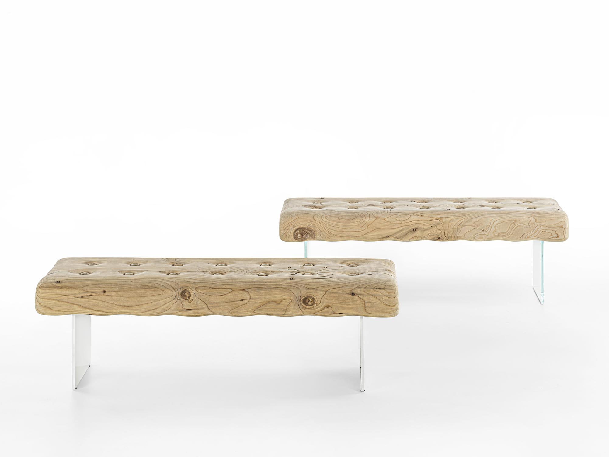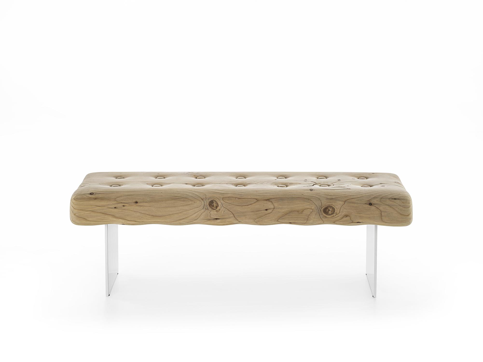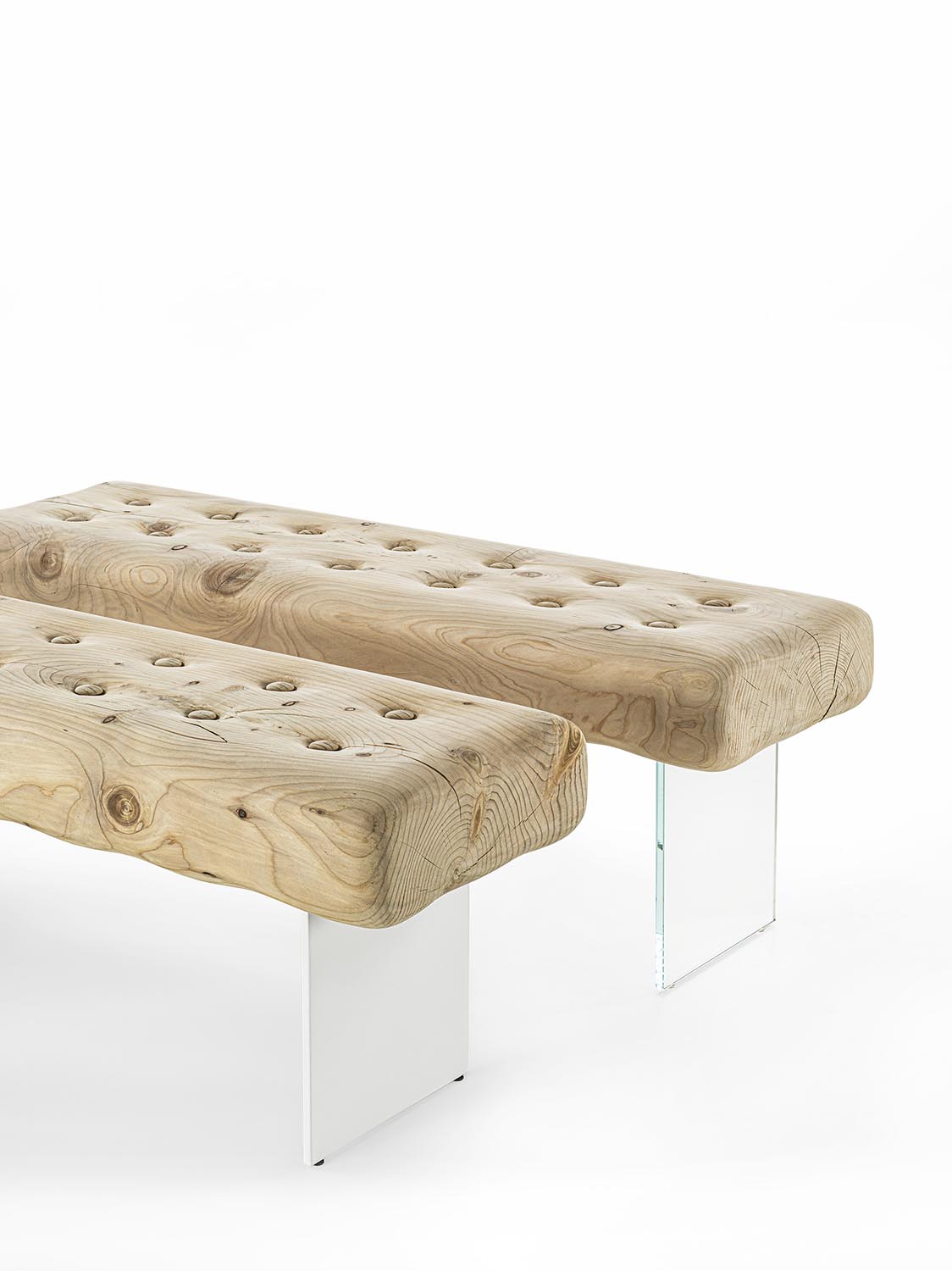 Banc en bois de cèdre massif odoriférant, fabriqué à partir d’un seul bloc, caractérisé par une assise qui rappelle la forme d'un matelas, créant un contraste avec l'idée de douceur, tout en offrant un confort considérable. Le banc est décoré de boutons en bois de cèdre et repose sur des pieds en verre ou acier.