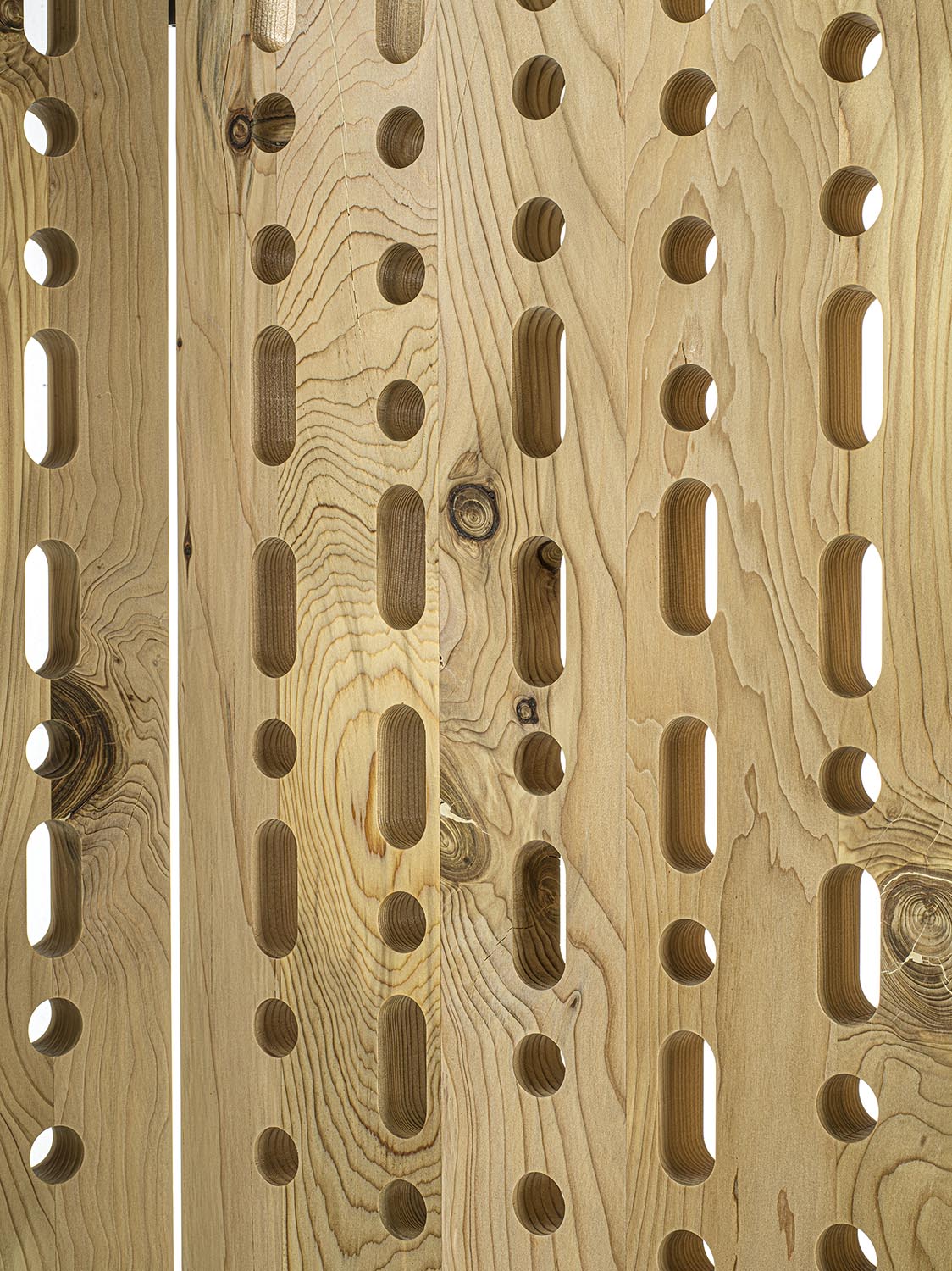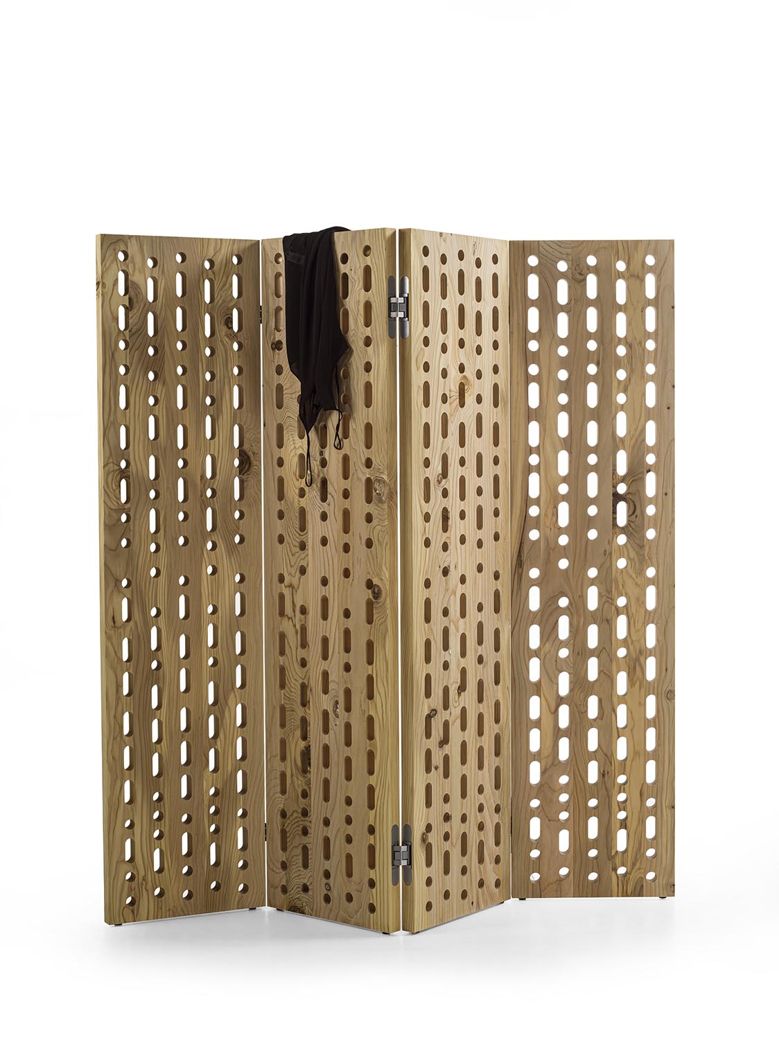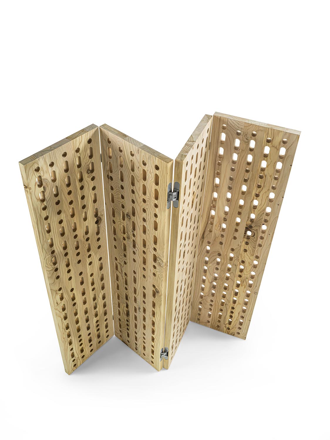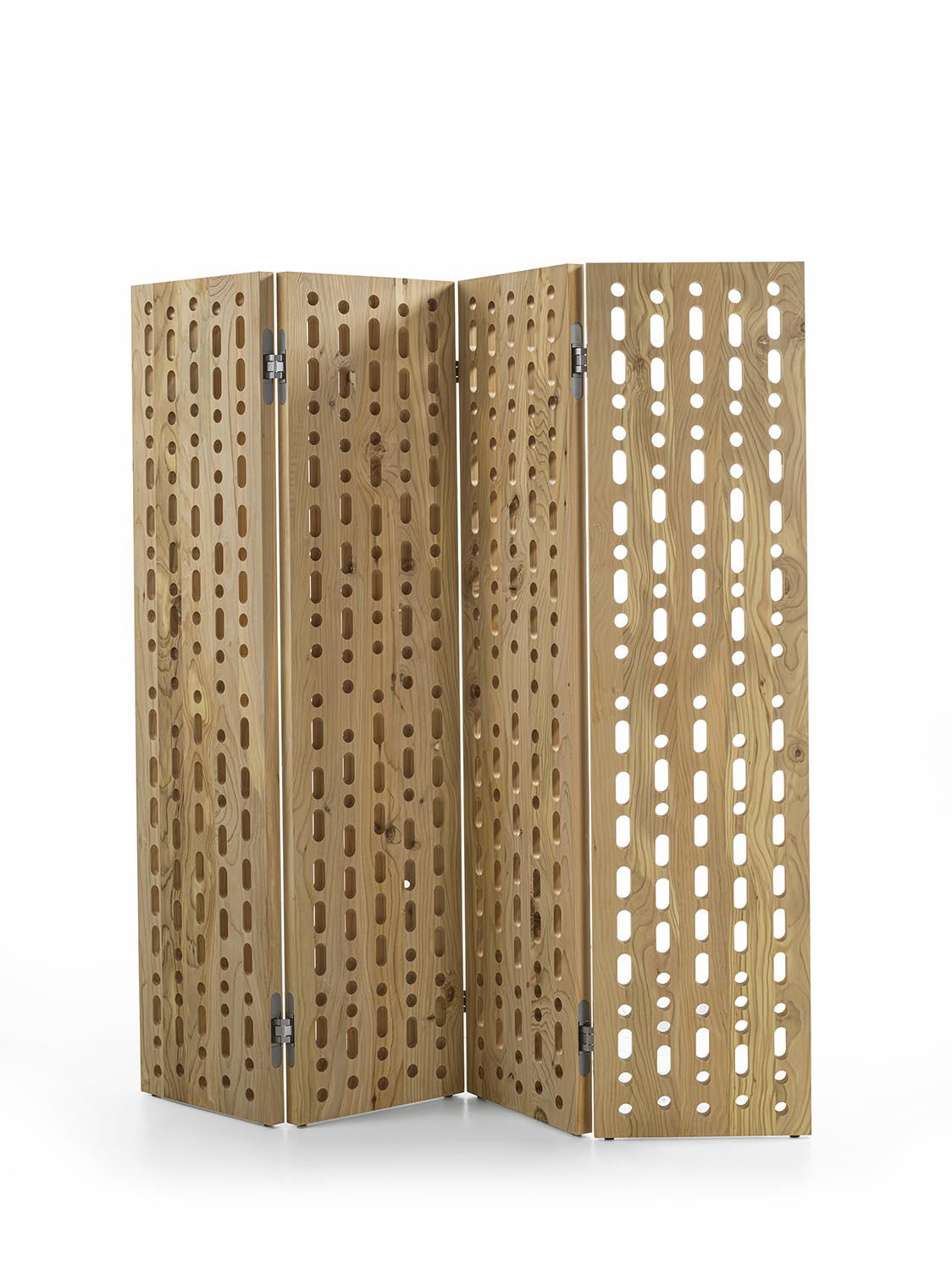 Paravento composto da pannelli incernierati, realizzato in legno massello di cedro del Libano profumato a liste incollate. La superficie è caratterizzata da forature passanti circolari e asolate, disposte secondo il codice Morse a comporre le parole “PACE” e “AMORE” in italiano e inglese. I moduli, collegati tra loro mediante cerniere metalliche, consentono configurazioni variabili, mentre il disegno traforato alleggerisce visivamente il volume e favorisce il passaggio della luce.
