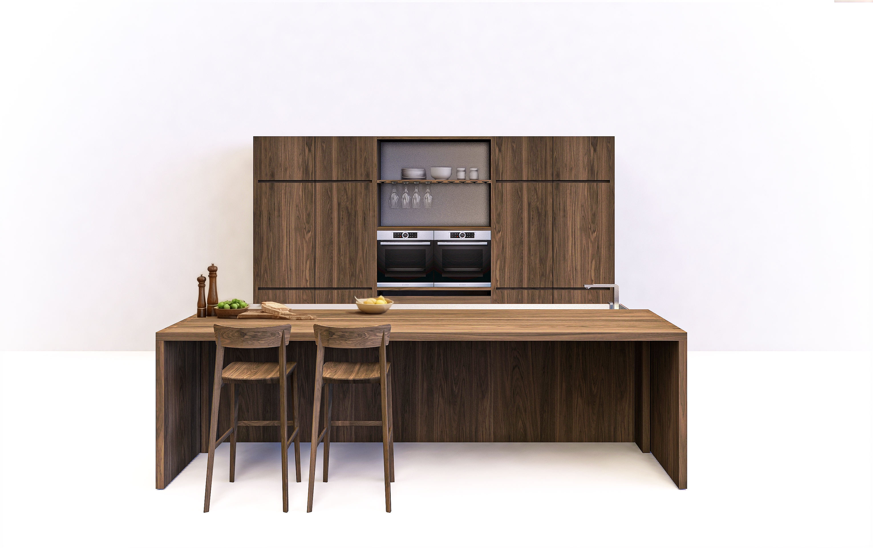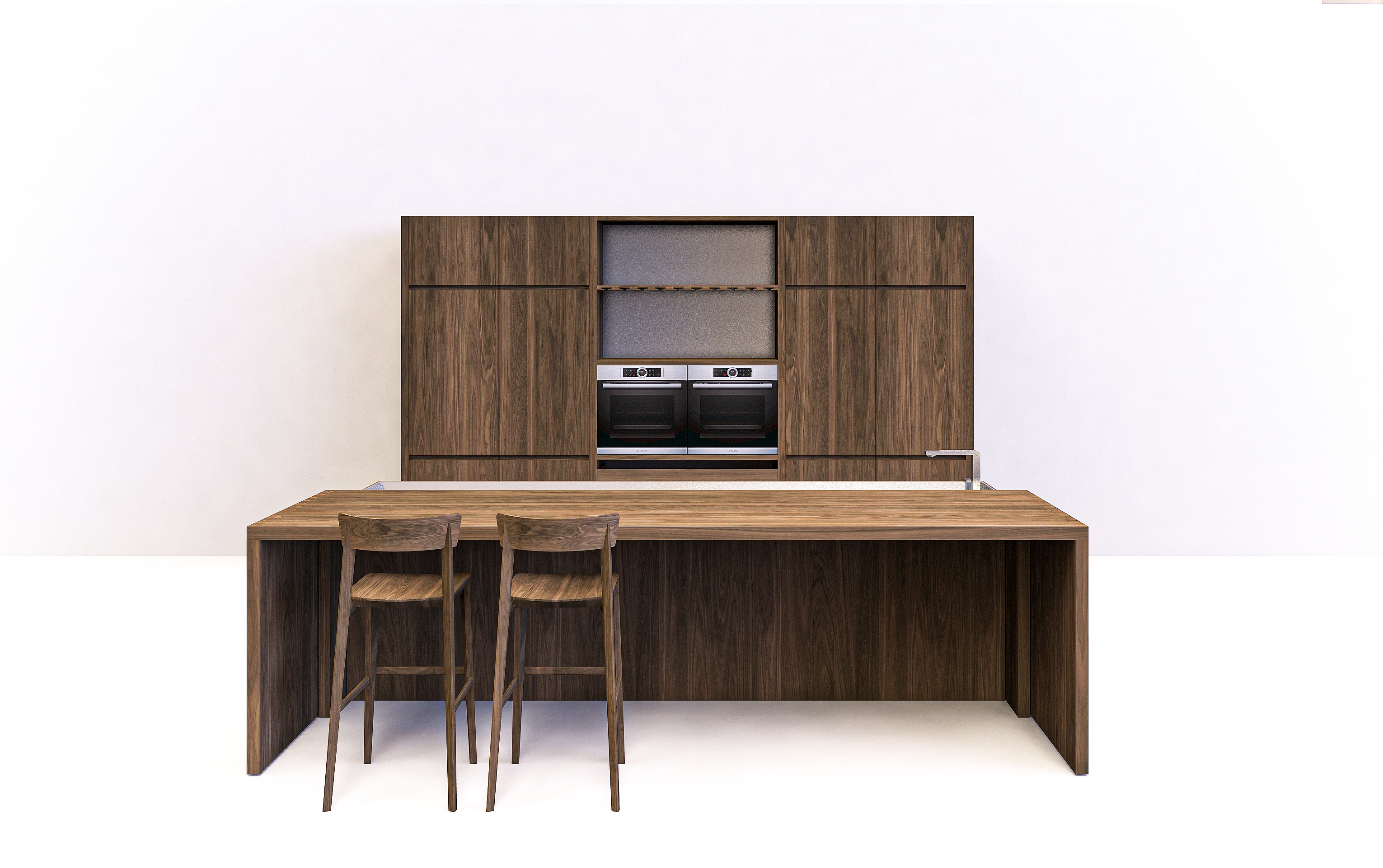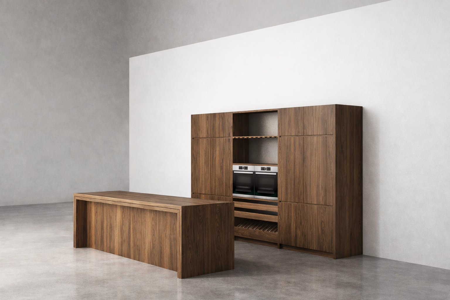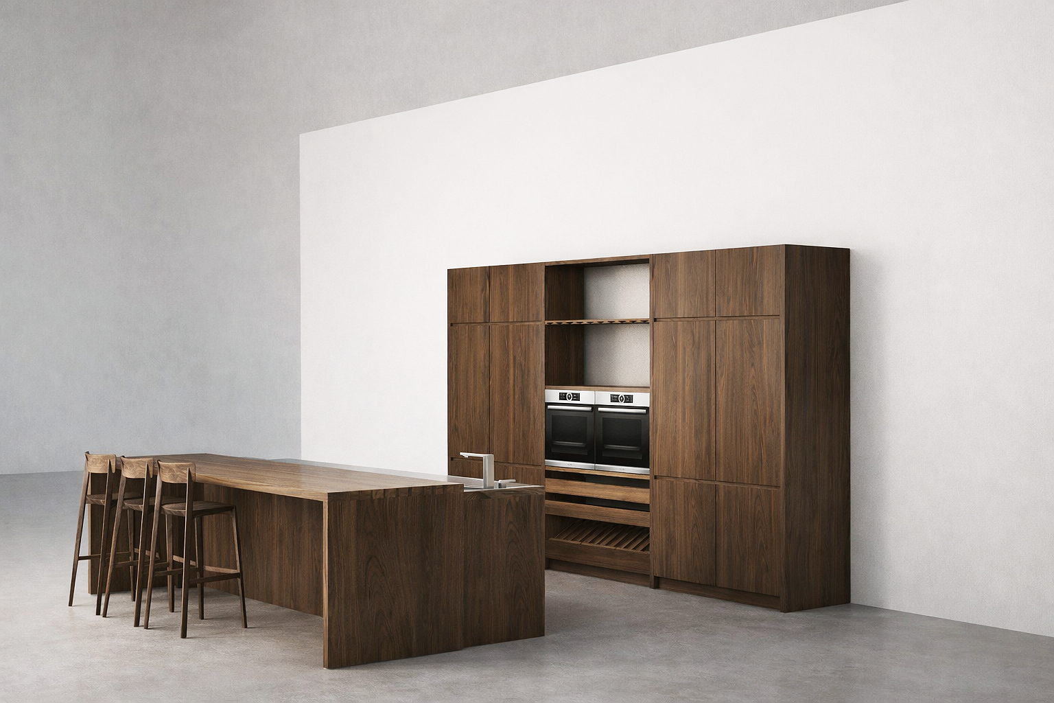 Cucina modulare realizzata con parti in legno massello e multistrato impiallacciato, caratterizzata dal distintivo taglio a 45° su ante e frontali dei cassetti, studiato come presa integrata per l’apertura. Composta da basi e pensili, con moduli a giorno o chiusi, è disponibile con ante basculanti, folding e a battente. I cassetti, assemblati con tradizionale incastro a coda di rondine, sono dotati di scorrimento assistito su guide metalliche ed elementi estraibili. Completano il sistema banchi isola e colonne dispensa a parete, nelle quali possono essere integrati gli elettrodomestici. Il piano dell’isola può essere dotato di una console scorrevole, utilizzabile sia come piano snack sia come elemento di copertura della zona operativa, conferendo all’insieme un aspetto monolitico, pulito e ordinato. Piano di lavoro e schienali a vista sono disponibili in acciaio inox 18/10, Dekton® o pietra lavorata artigianalmente. La finitura del legno è realizzata a base di olio naturale di origine vegetale. Disponibile in molteplici configurazioni e misure, è progettata per adattarsi alle specifiche esigenze funzionali ed estetiche di ogni cliente.