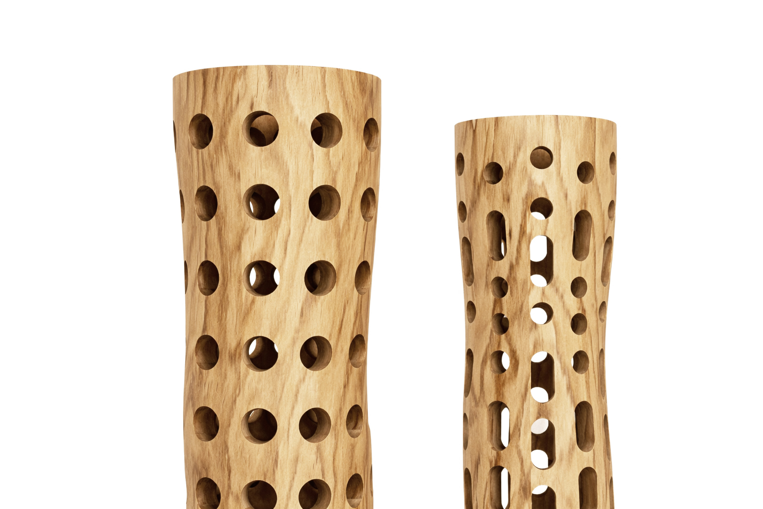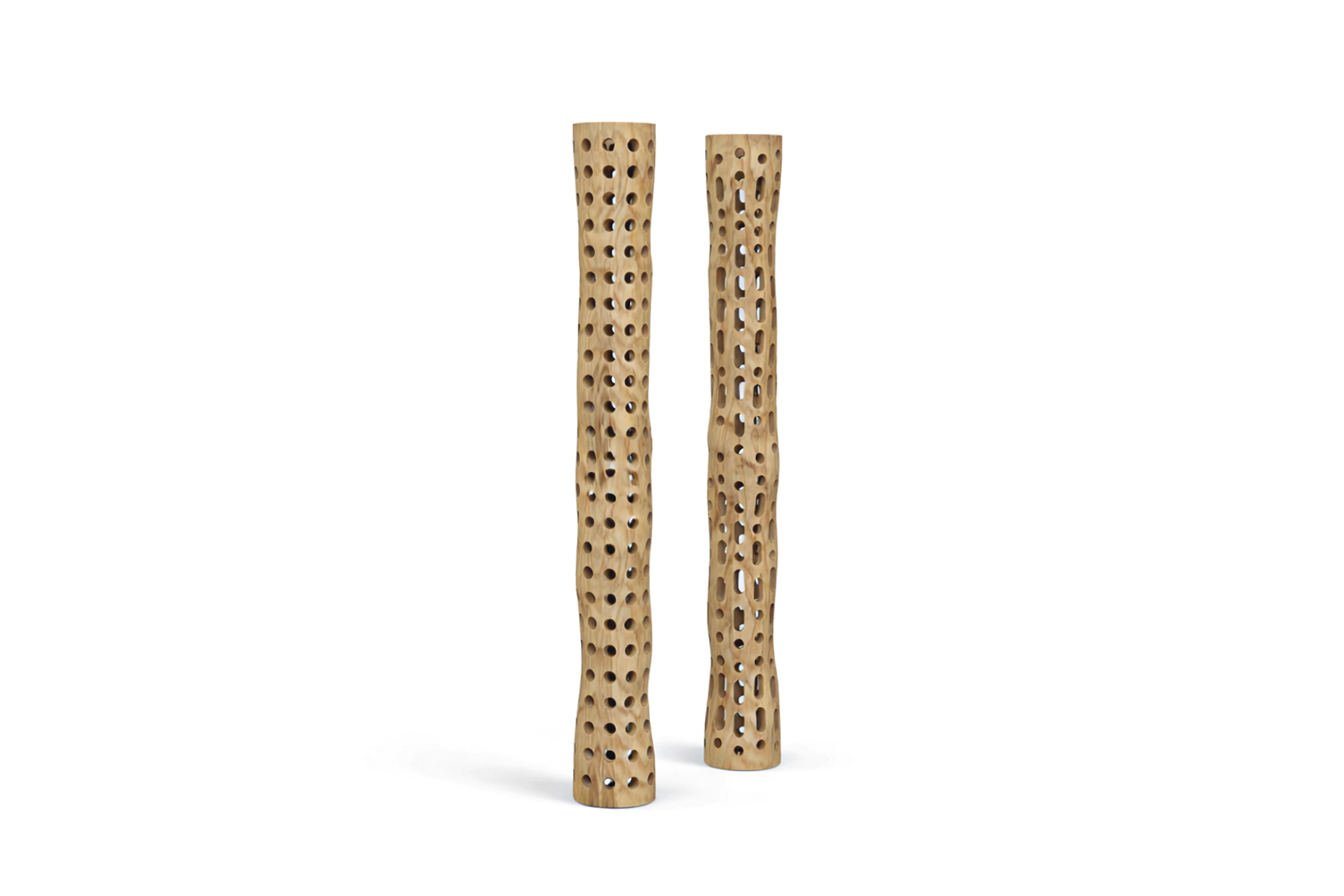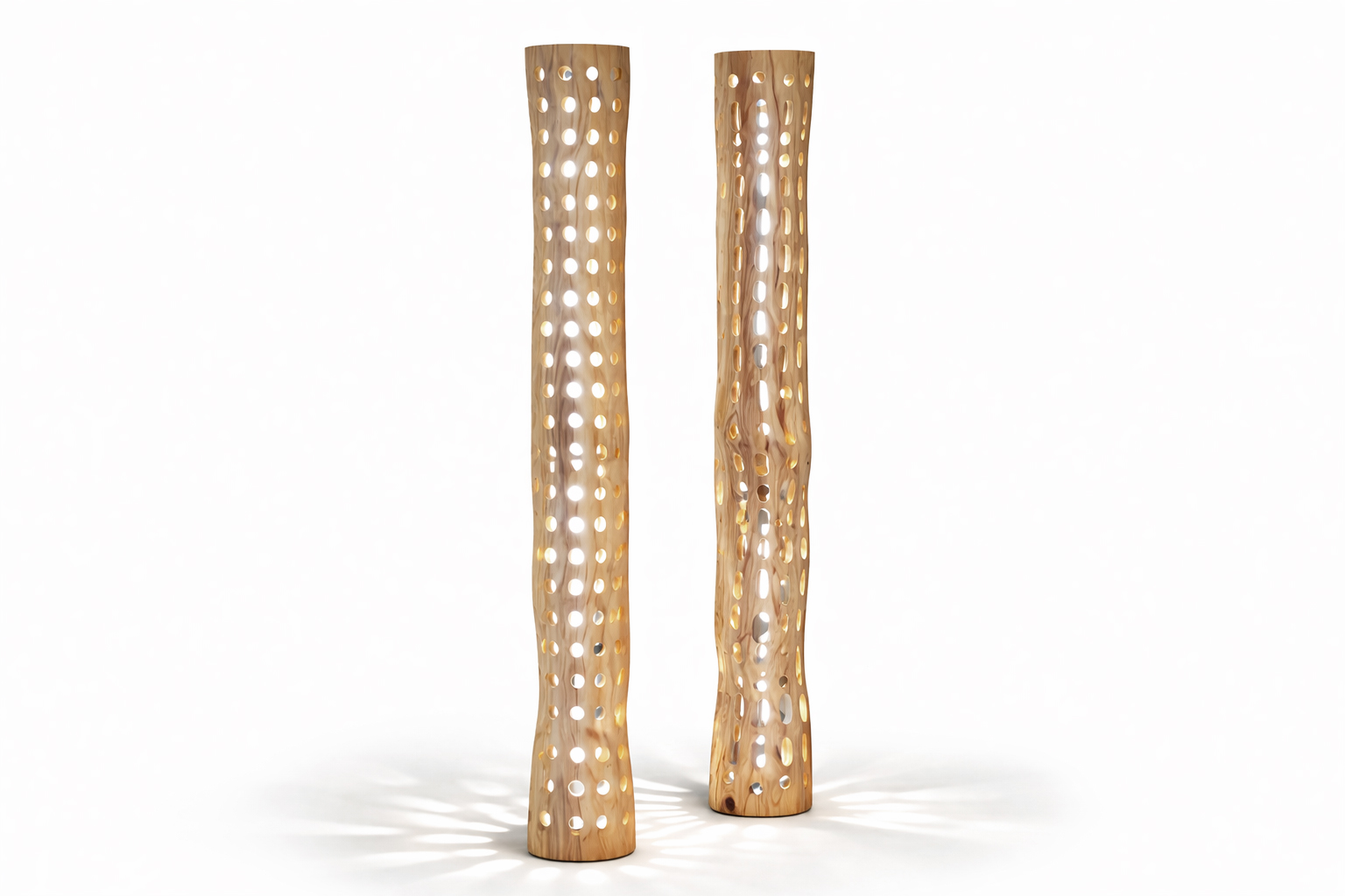 Lampada da terra in legno massello di cedro profumato, ricavata da un tronco unico e dotata di sistema di illuminazione a LED integrato. Nella versione standard, la superficie presenta forature circolari; nella variante "PACE e AMORE", le forature compongono le due parole in codice Morse in italiano e in inglese.