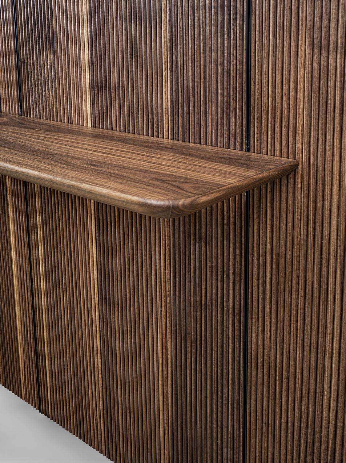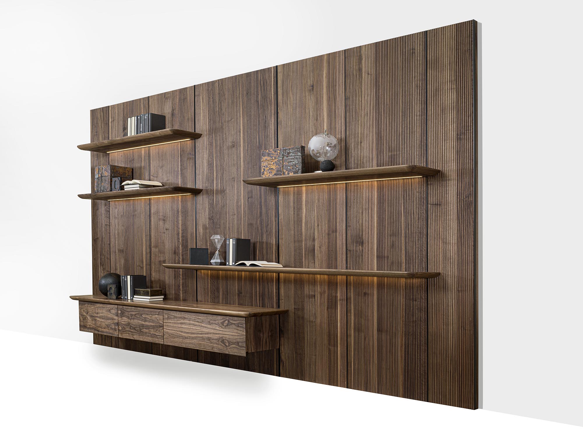 Sistema giorno componibile basato su pannelli boiserie e completato da cassetti e mensole. Pannelli boiserie in listellare impiallacciato disponibili anche con lavorazione verticale, Fresart; mensole in listellare impiallacciato con spessori assottigliati tramite lavorazione a saponetta; cassetti con incastri a coda di rondine. Possibilità di inserimento di strisce a LED nei pannelli e nelle mensole.