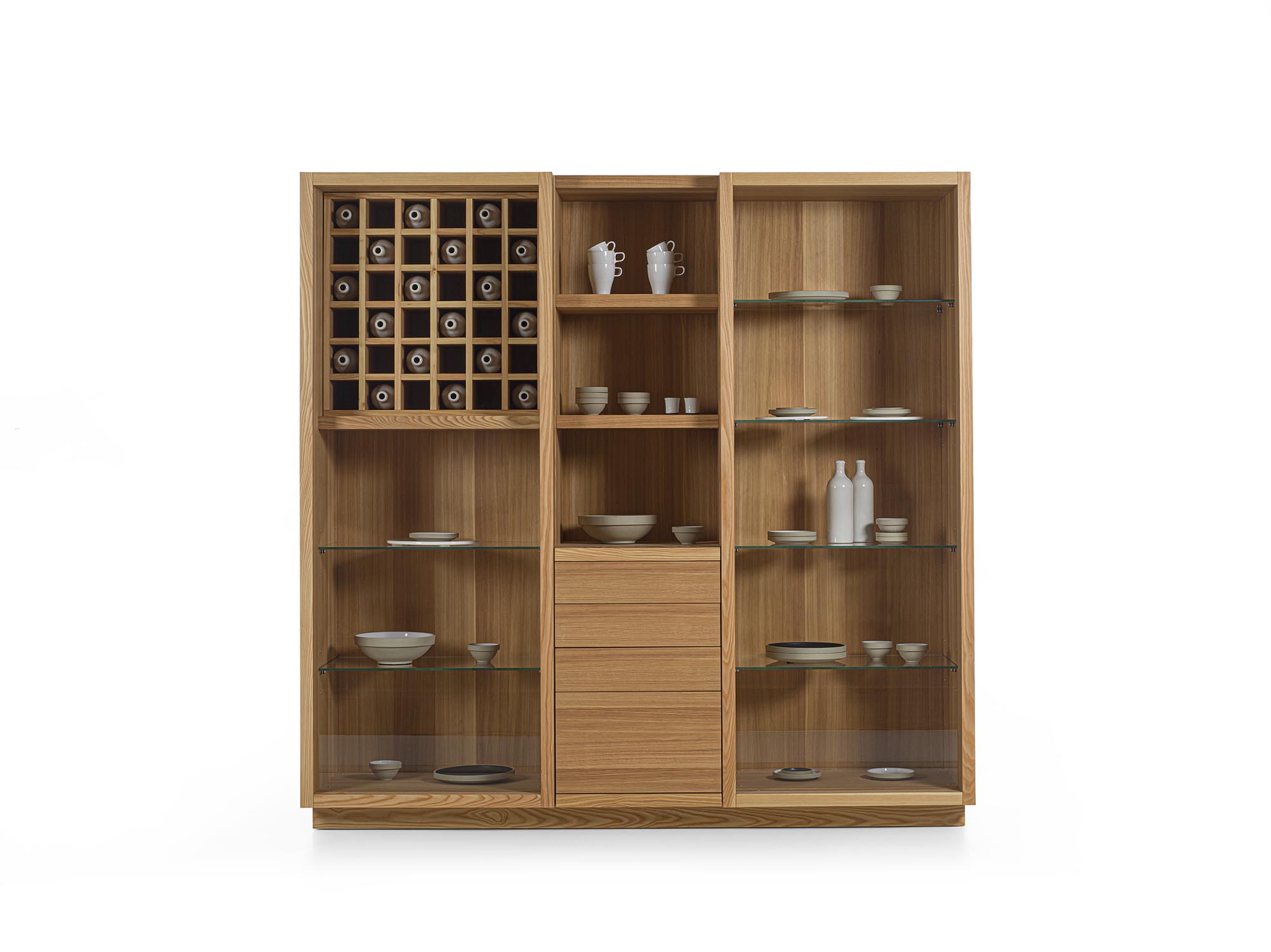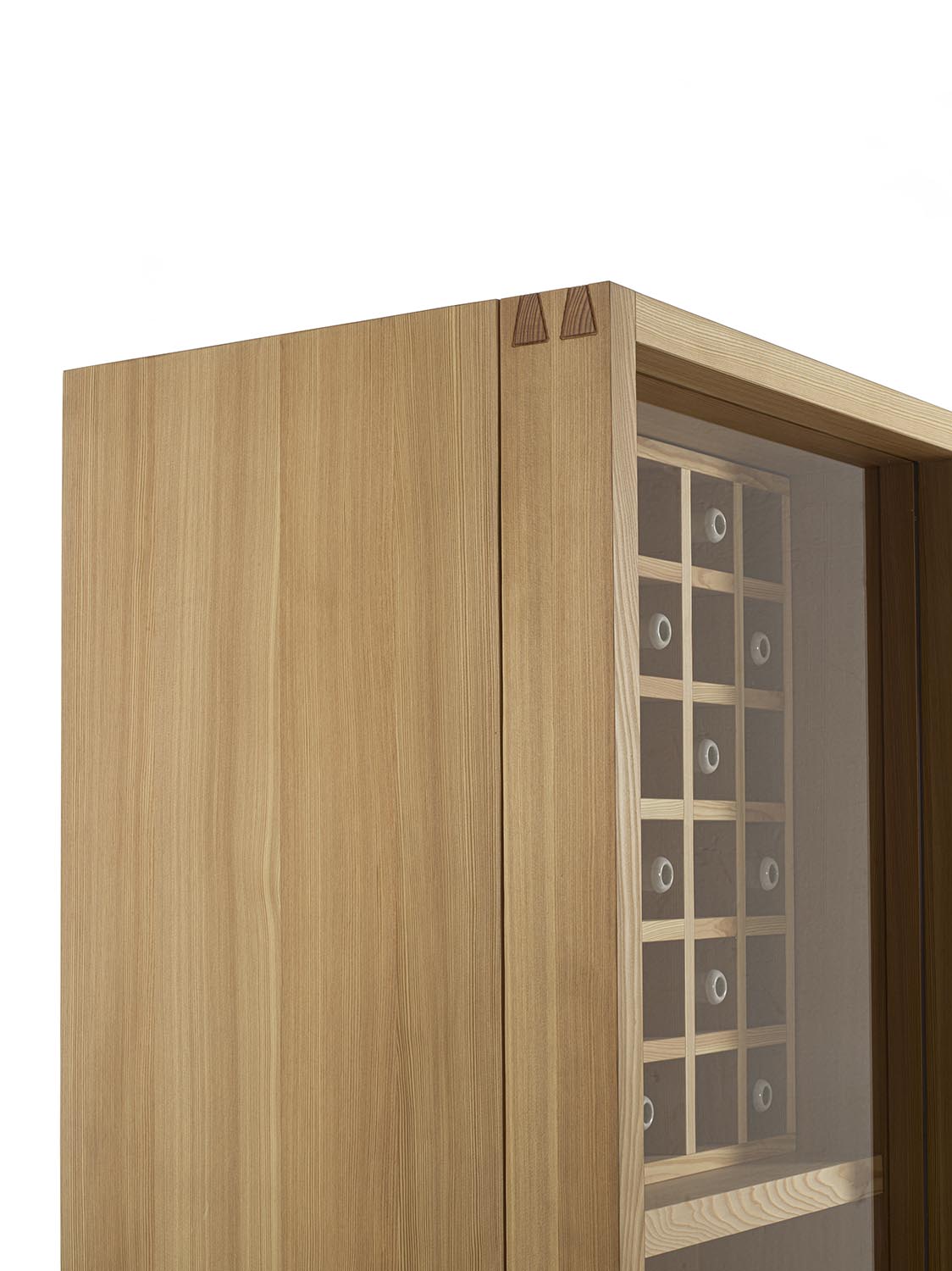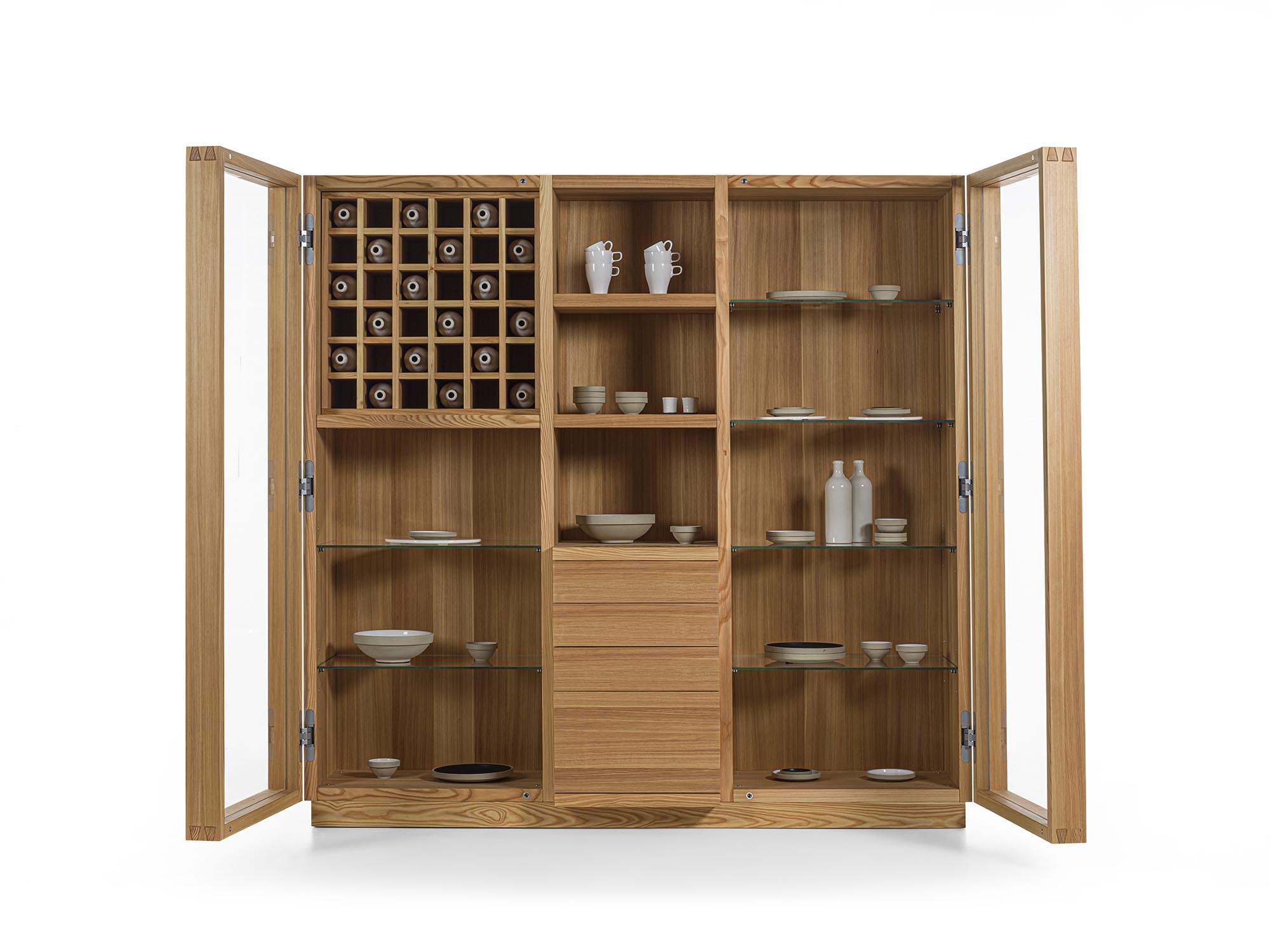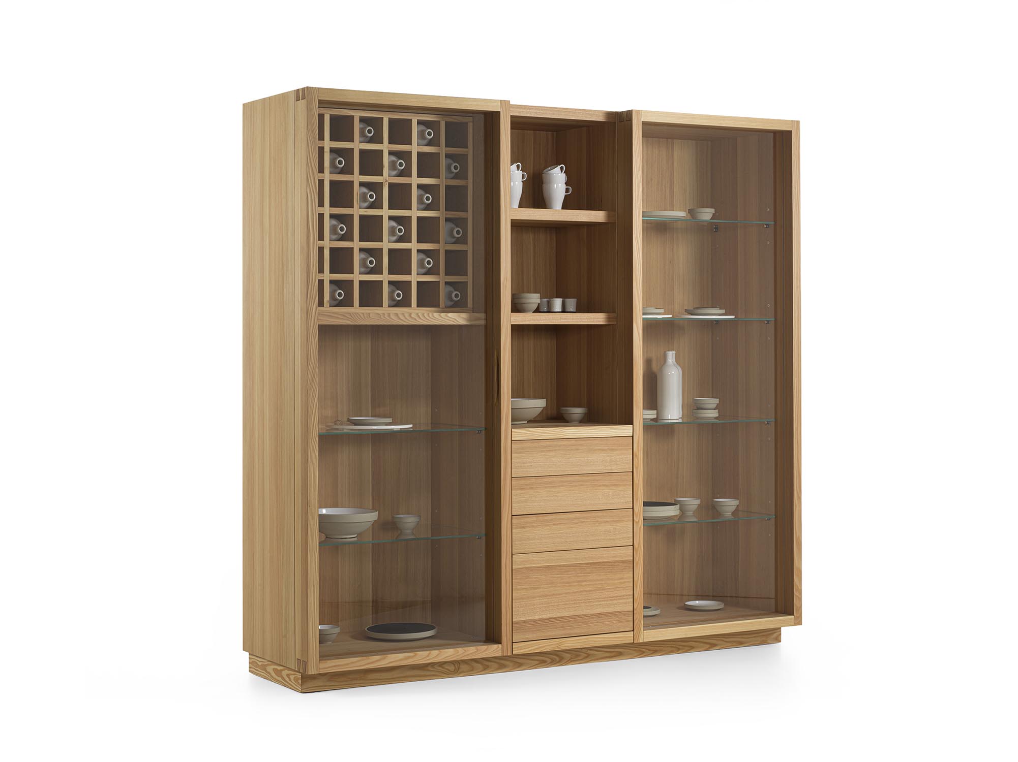 Mobile contenitore realizzato in legno massello e listellare, composto da tre vani, di cui uno a giorno e due chiusi da ante in vetro con profilo in legno con incastri a coda di rondine e maniglia fresata. L’allestimento interno è studiato per il contenimento e l’esposizione e può essere personalizzato con ripiani in vetro o in legno, griglia portabottiglie, cassetti o cestoni assemblati con tradizionale incastro a coda di rondine. Illuminazione a LED disponibile su richiesta.