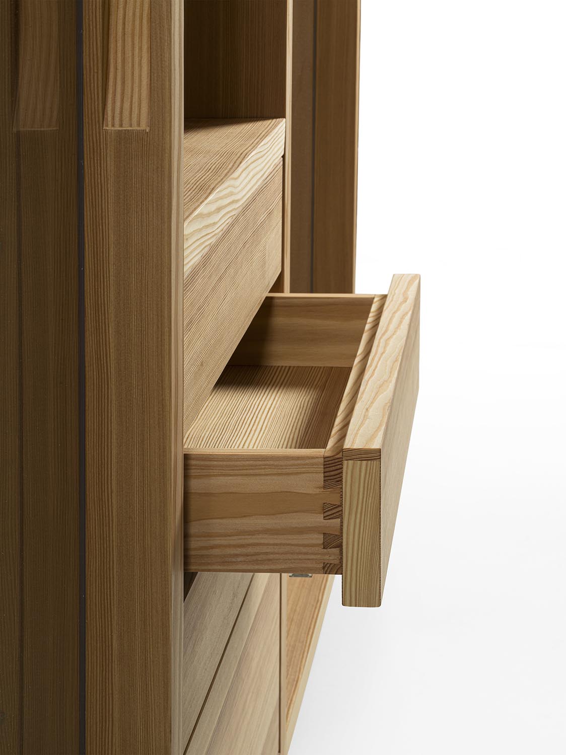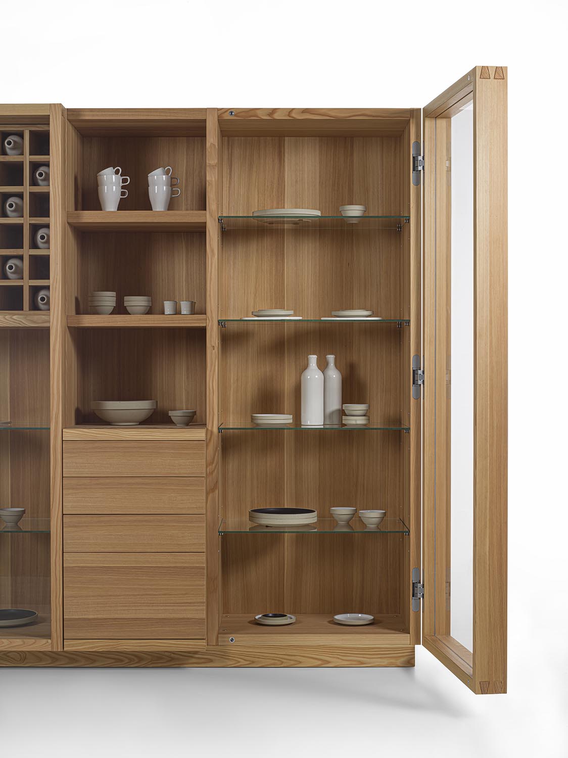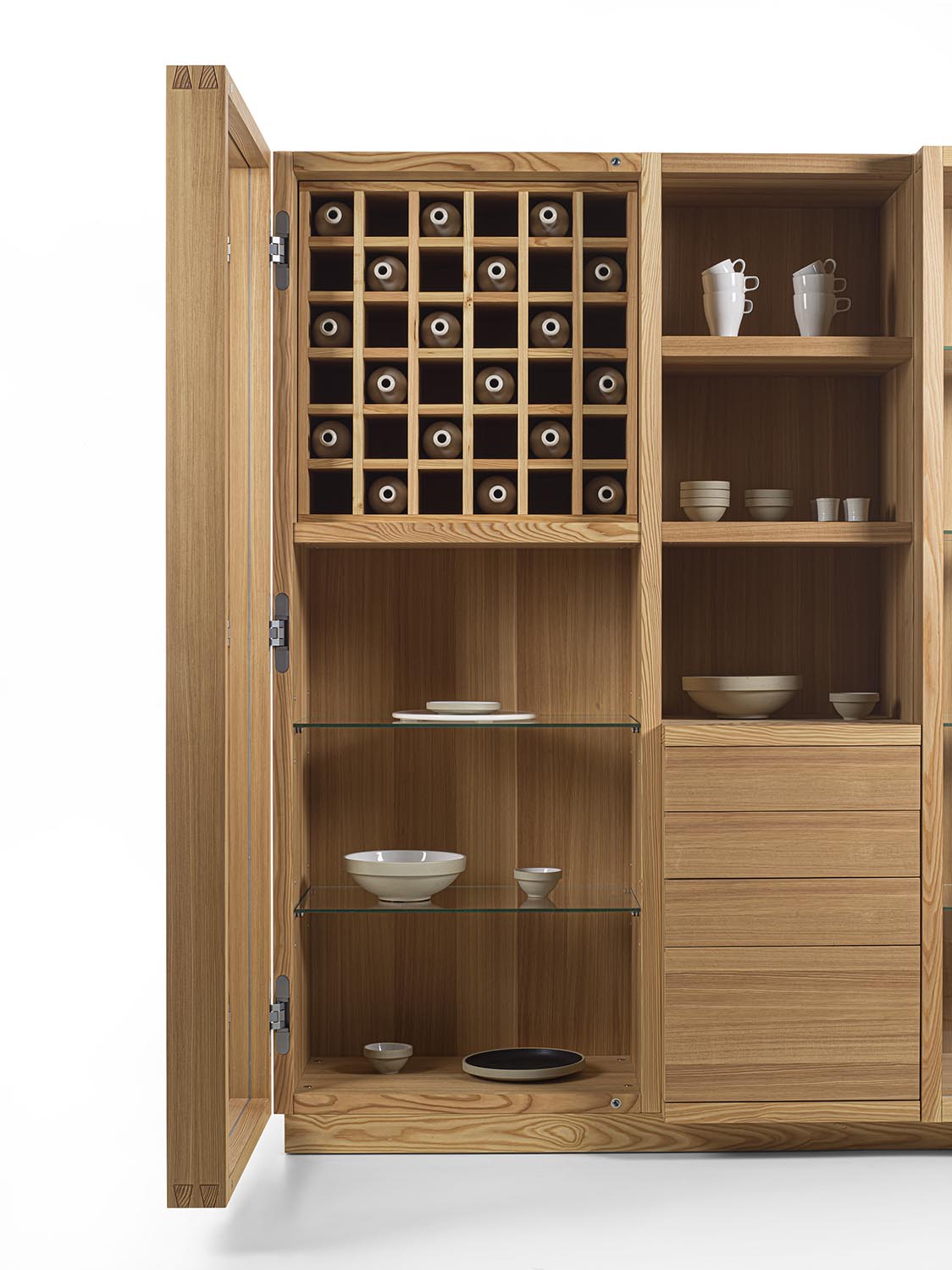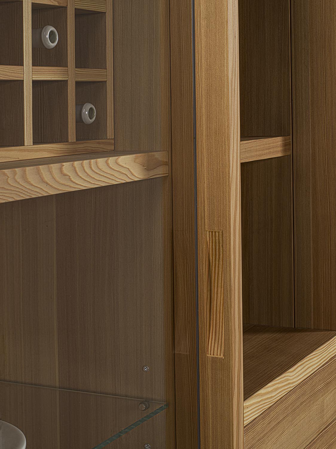 Mobile contenitore realizzato in legno massello e listellare, composto da tre vani, di cui uno a giorno e due chiusi da ante in vetro con profilo in legno con incastri a coda di rondine e maniglia fresata. L’allestimento interno è studiato per il contenimento e l’esposizione e può essere personalizzato con ripiani in vetro o in legno, griglia portabottiglie, cassetti o cestoni assemblati con tradizionale incastro a coda di rondine. Illuminazione a LED disponibile su richiesta.