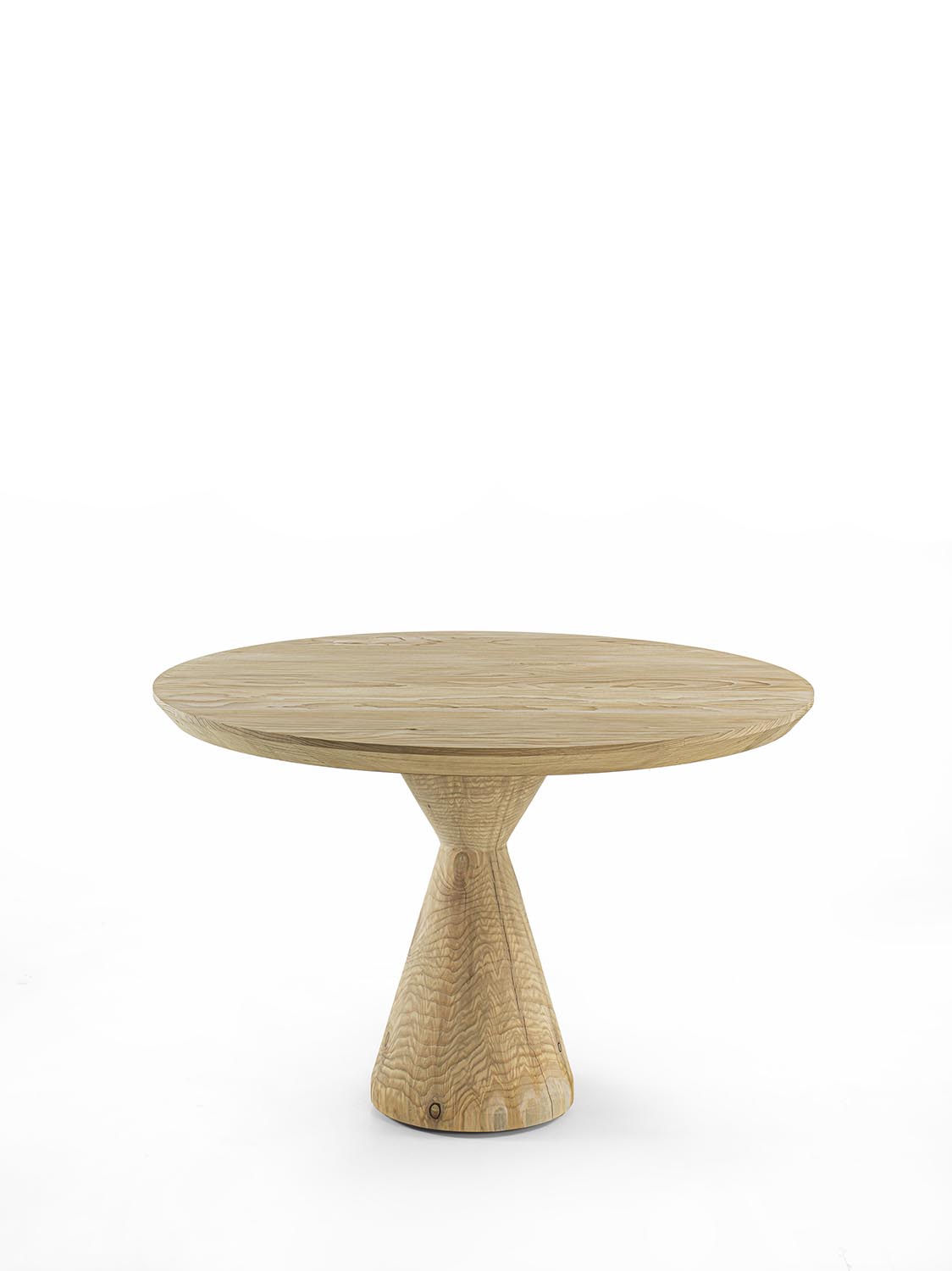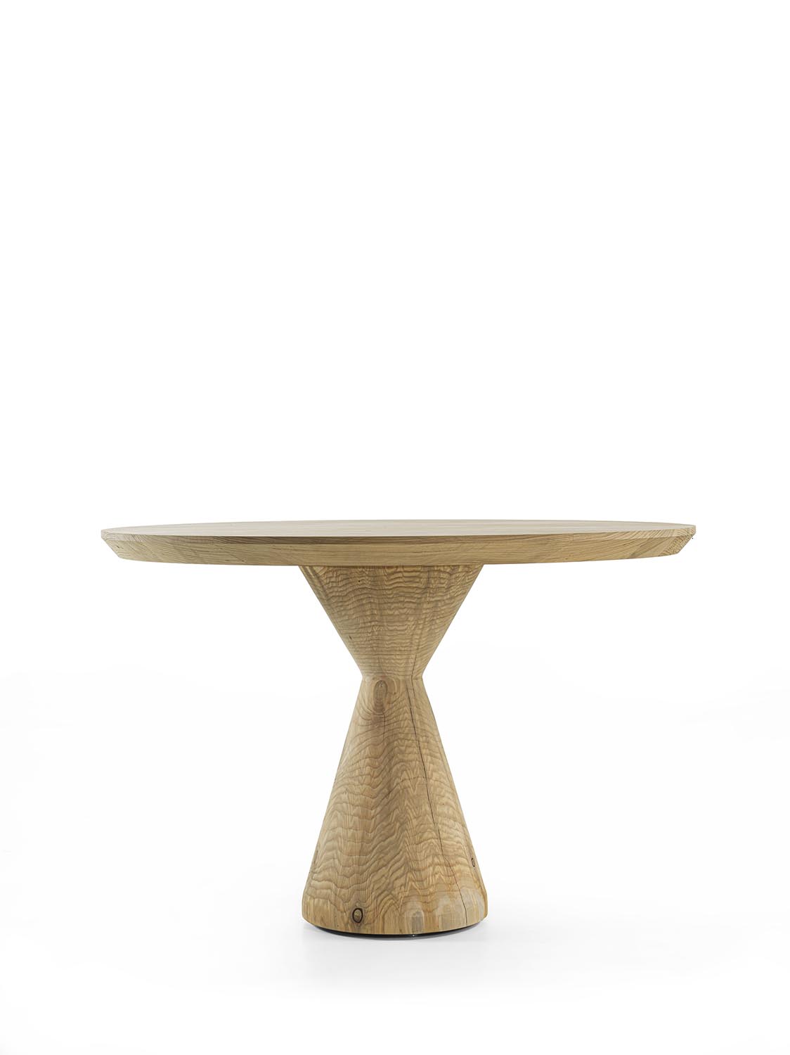 Tavolo con top in legno massello di cedro a liste incollate. La base, anch’essa in legno massello di cedro e ricavata da un blocco unico, è caratterizzata da due coni contrapposti, rovesciati l’uno rispetto all’altro, che generano un gioco di contrapposizioni e definiscono un sostegno scultoreo dal forte impatto materico e formale.