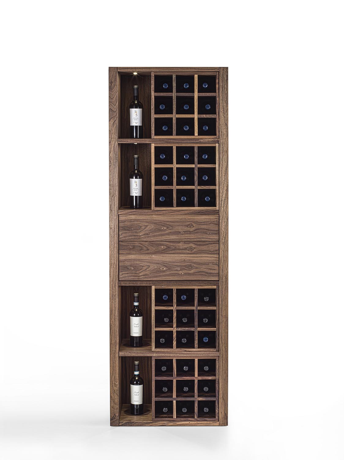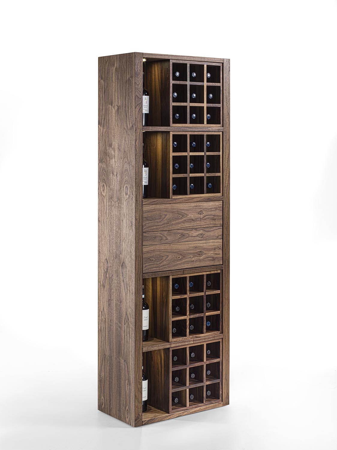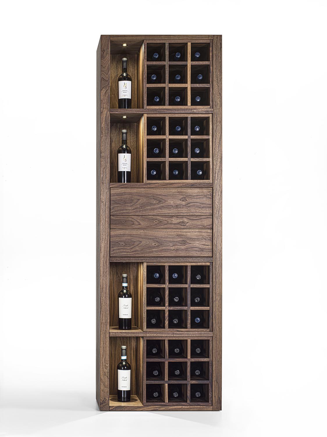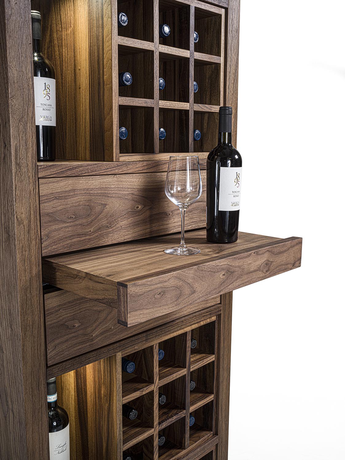 Mobile vineria in legno massello e multistrato, caratterizzato da vani portabottiglie con griglia in legno oppure con separatori diagonali in ferro. È completo di ripiano d’appoggio e di cassetti con incastri a coda di rondine e apertura push-pull. Nei vani laterali sono integrati faretti a LED, studiati per illuminare e valorizzare il contenuto.