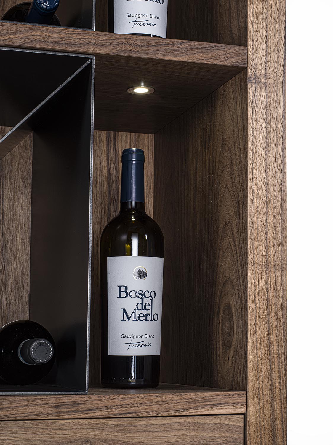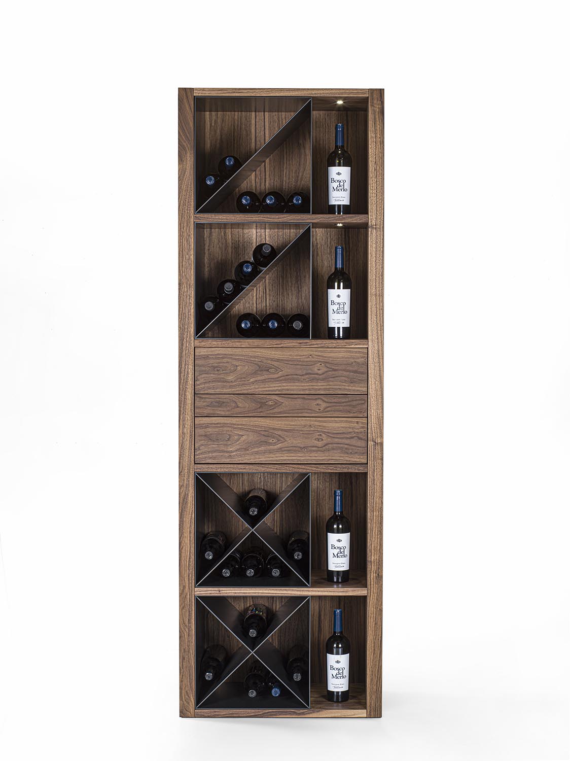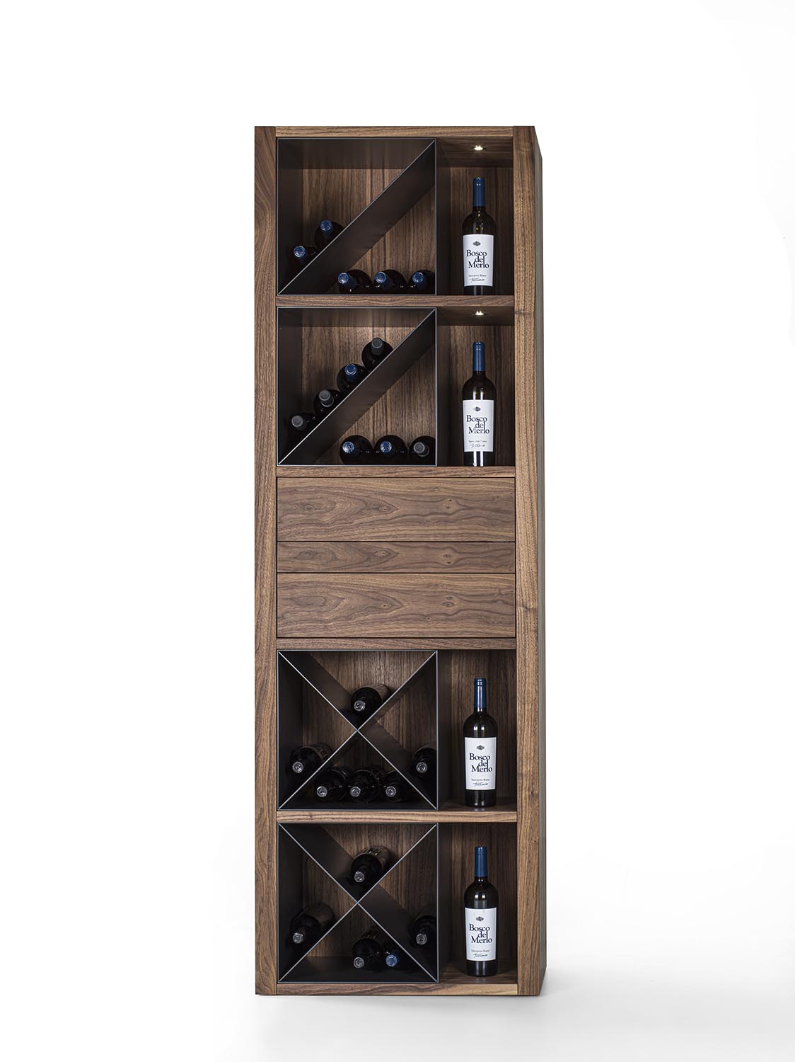 Mobile vineria in legno massello e multistrato, caratterizzato da vani portabottiglie con griglia in legno oppure con separatori diagonali in ferro. È completo di ripiano d’appoggio e di cassetti con incastri a coda di rondine e apertura push-pull. Nei vani laterali sono integrati faretti a LED, studiati per illuminare e valorizzare il contenuto.