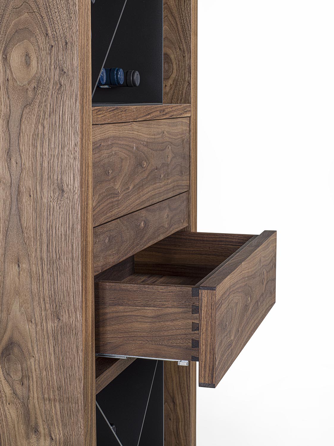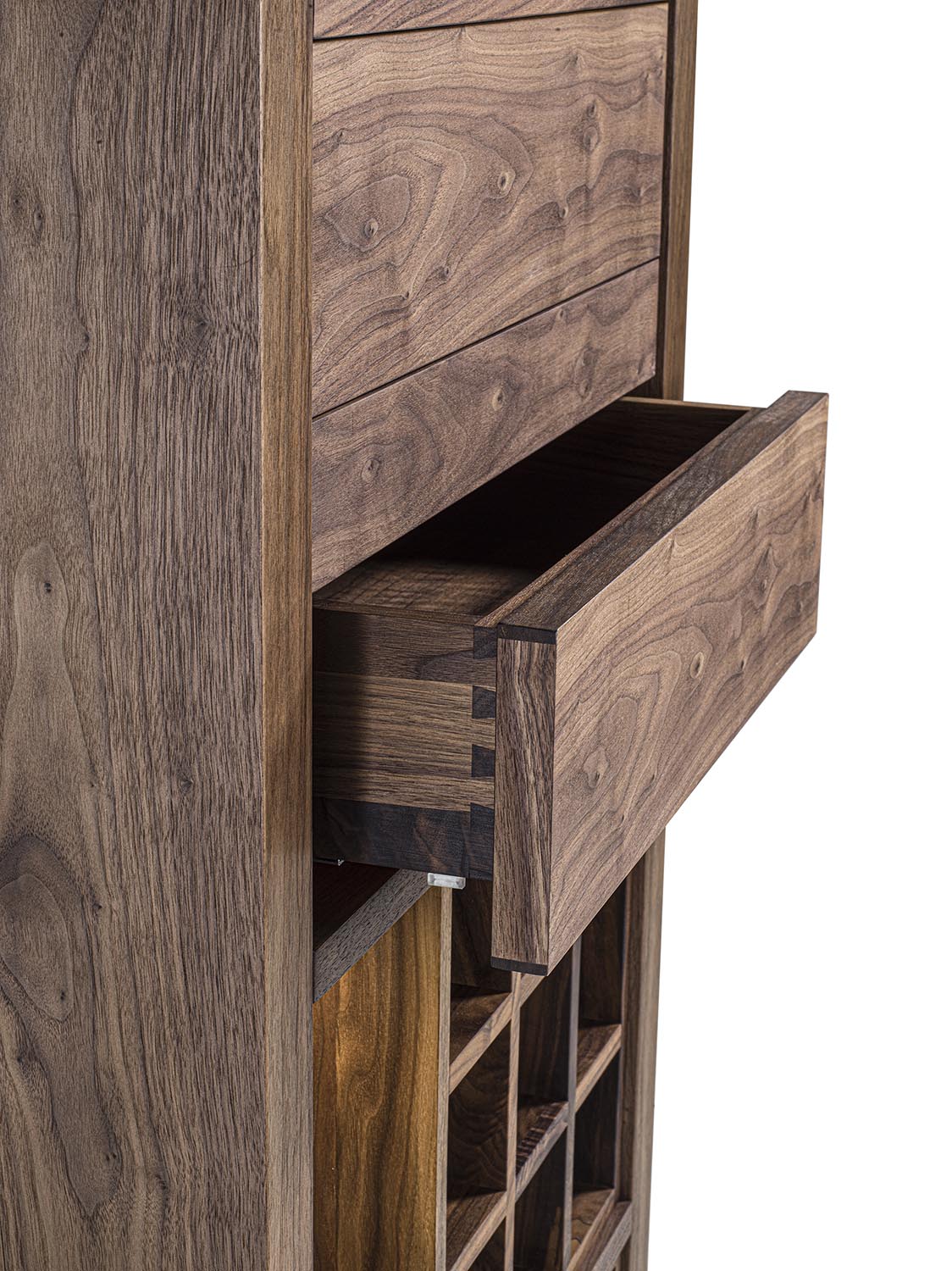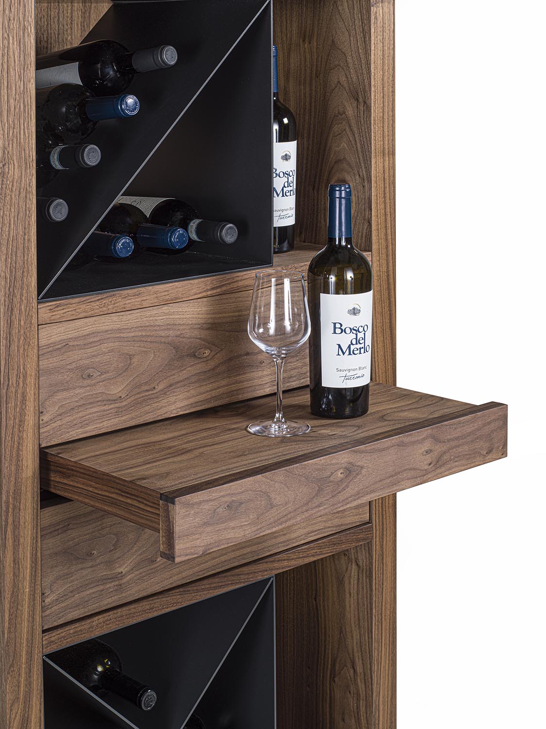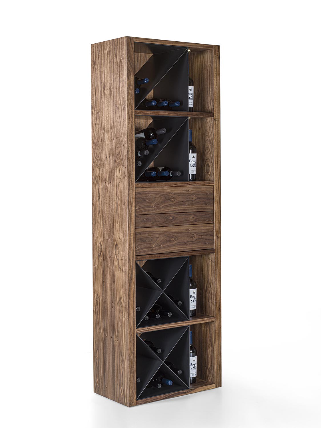 Mobile vineria in legno massello e multistrato, caratterizzato da vani portabottiglie con griglia in legno oppure con separatori diagonali in ferro. È completo di ripiano d’appoggio e di cassetti con incastri a coda di rondine e apertura push-pull. Nei vani laterali sono integrati faretti a LED, studiati per illuminare e valorizzare il contenuto.