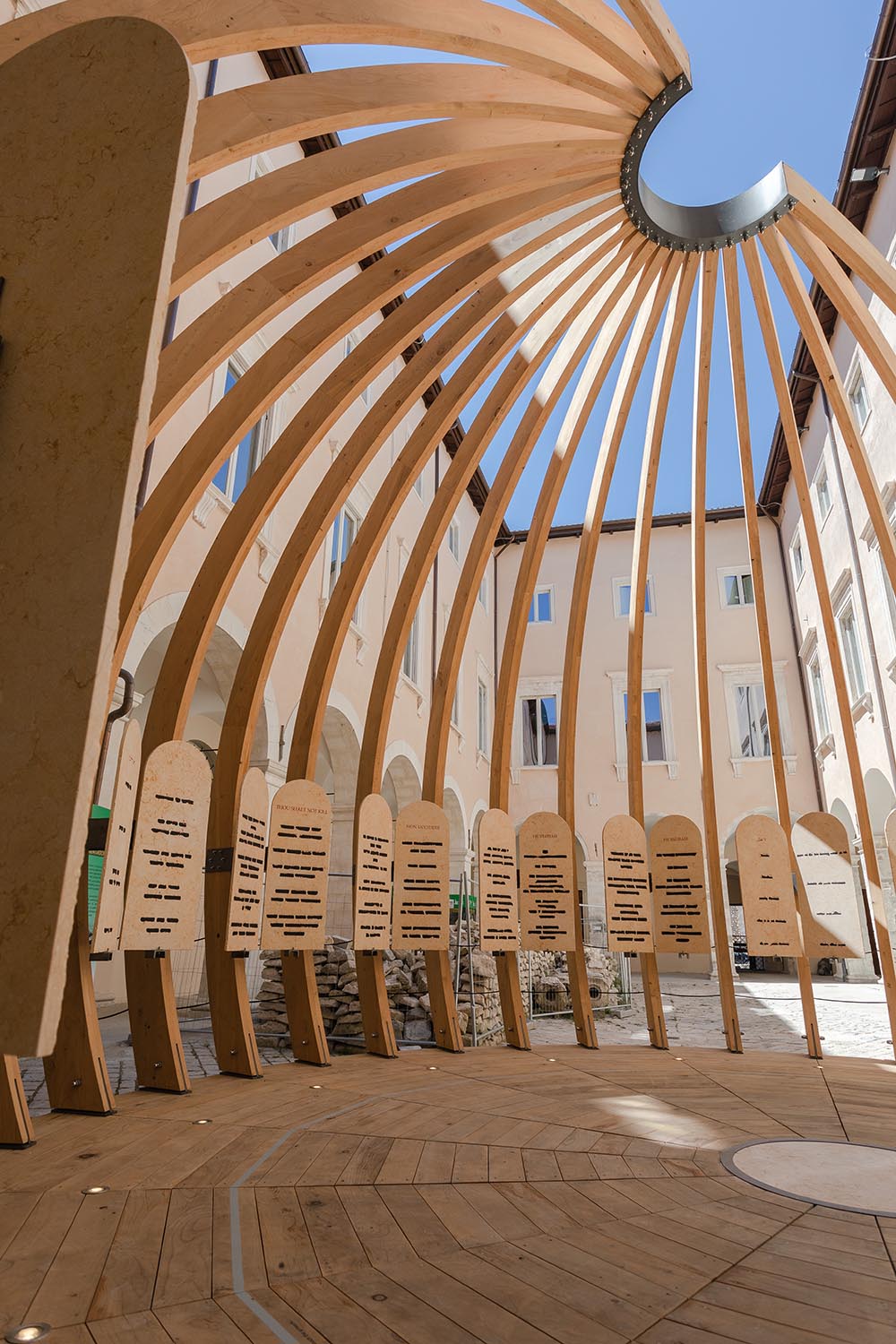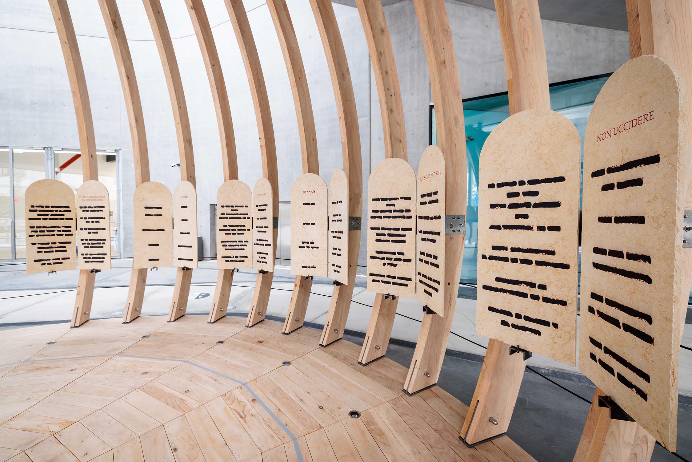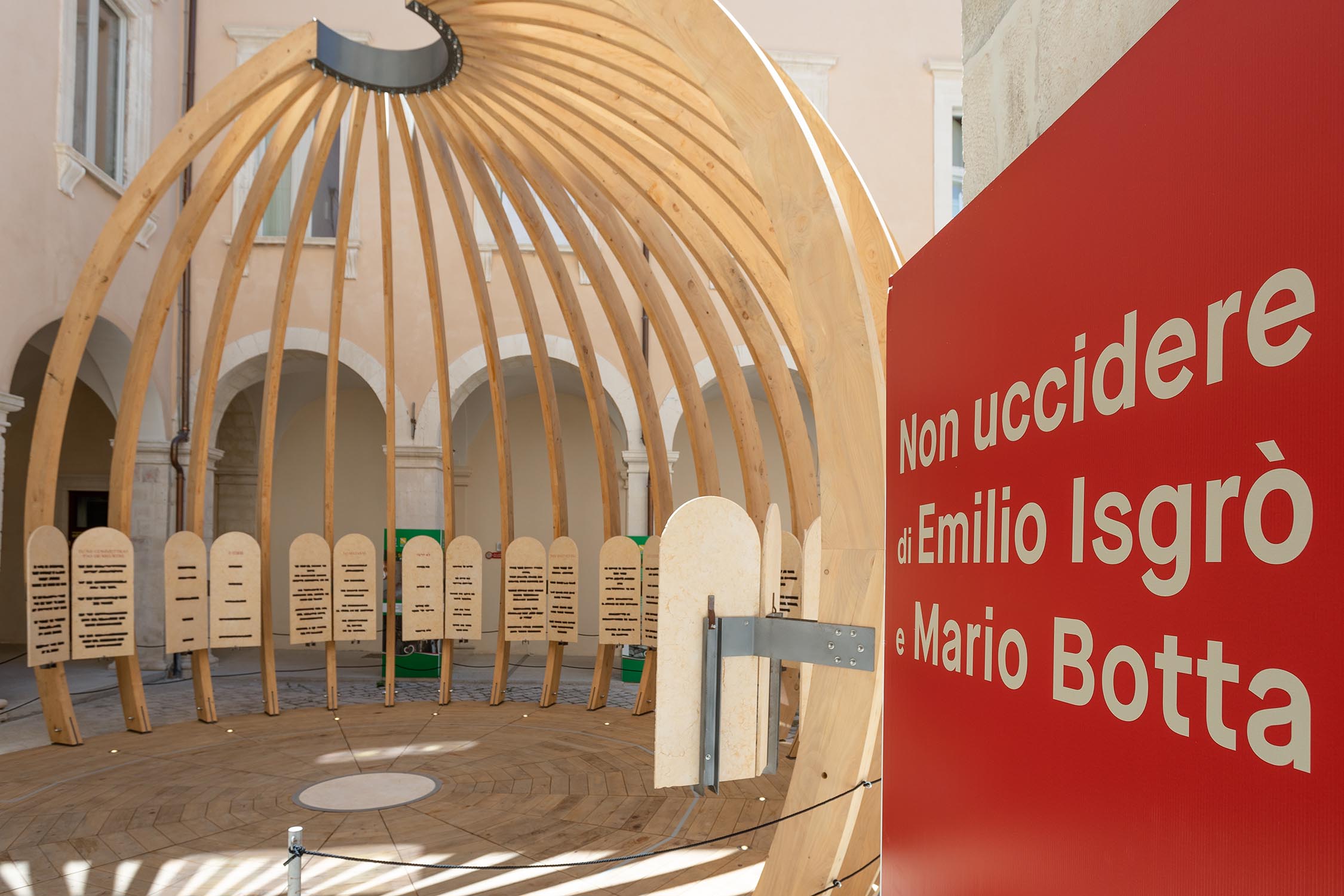 L’opera di Isgrò si manifesta in un monumentale bassorilievo in pietra del Sinai, composto da undici elementi, mentre l’architettura, progettata da Mario Botta, è stata prodotta da Riva1920 in cedro del Libano di recupero e collocata nella grande piazza del Museo.