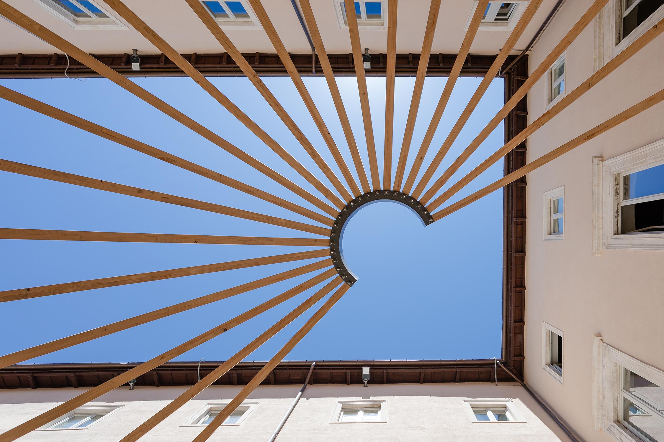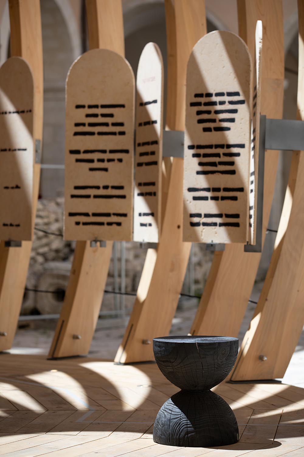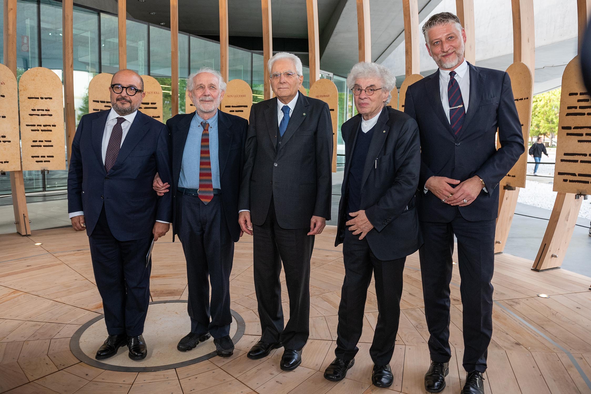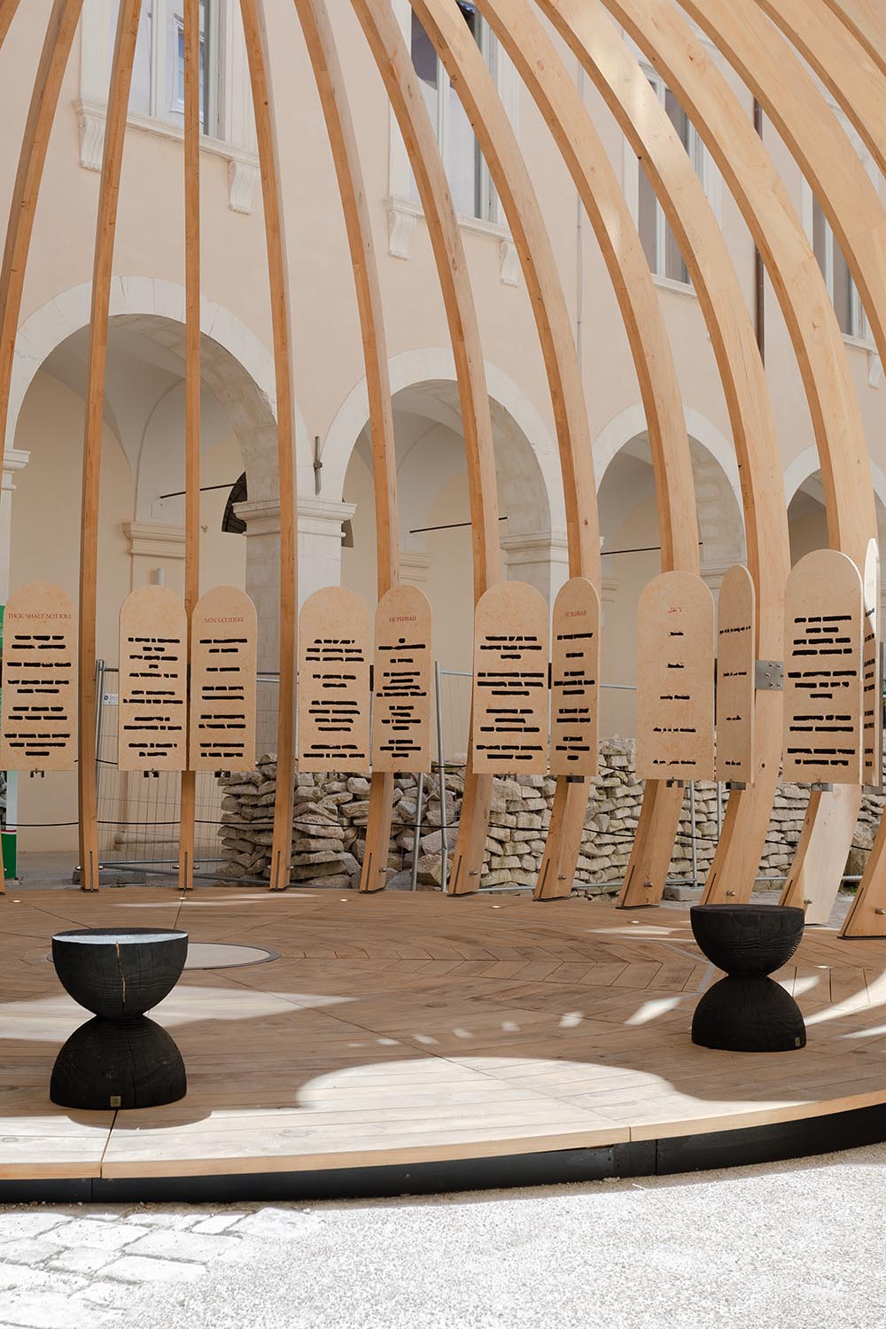 L’opera di Isgrò si manifesta in un monumentale bassorilievo in pietra del Sinai, composto da undici elementi, mentre l’architettura, progettata da Mario Botta, è stata prodotta da Riva1920 in cedro del Libano di recupero e collocata nella grande piazza del Museo.