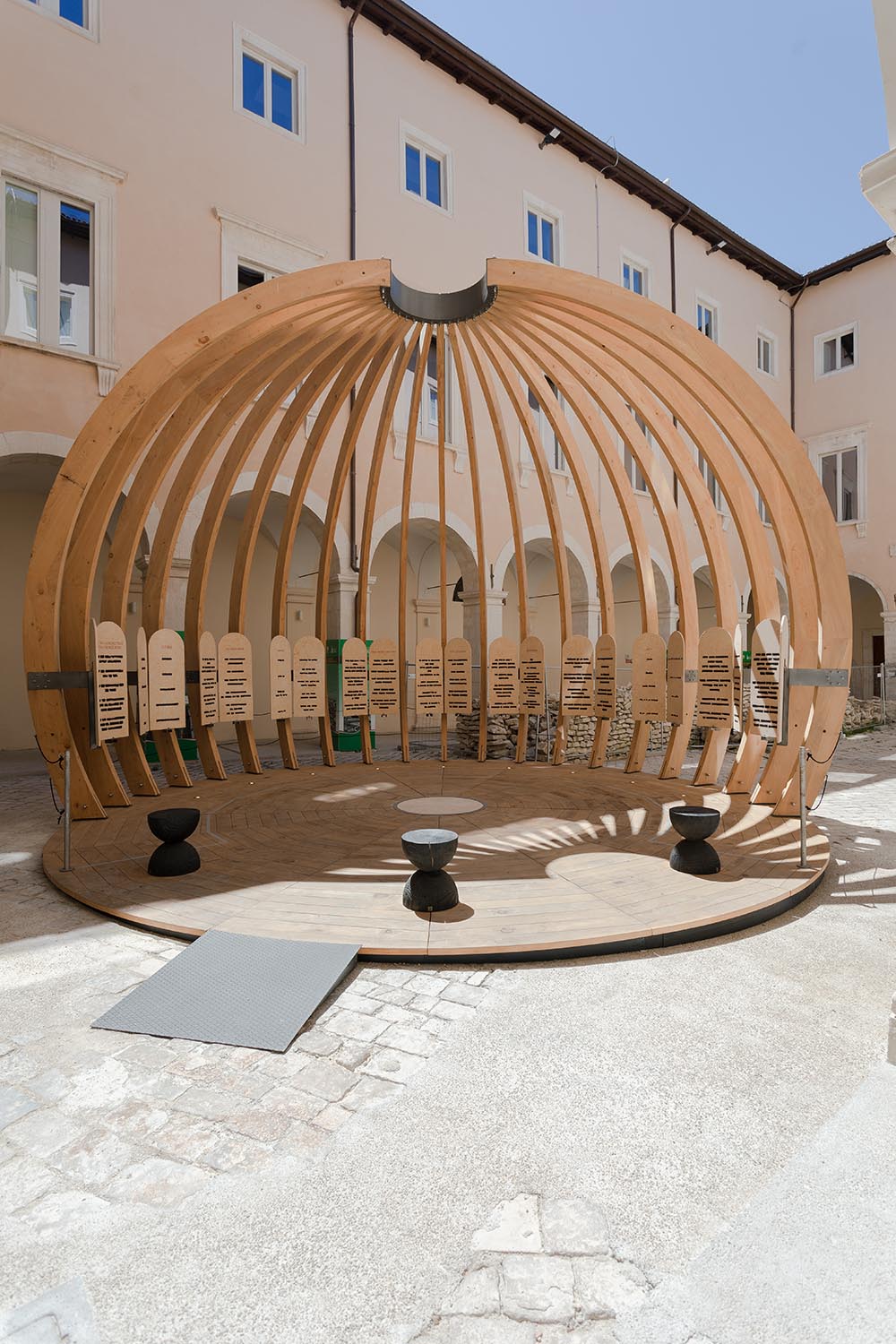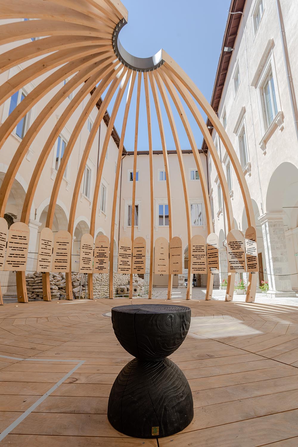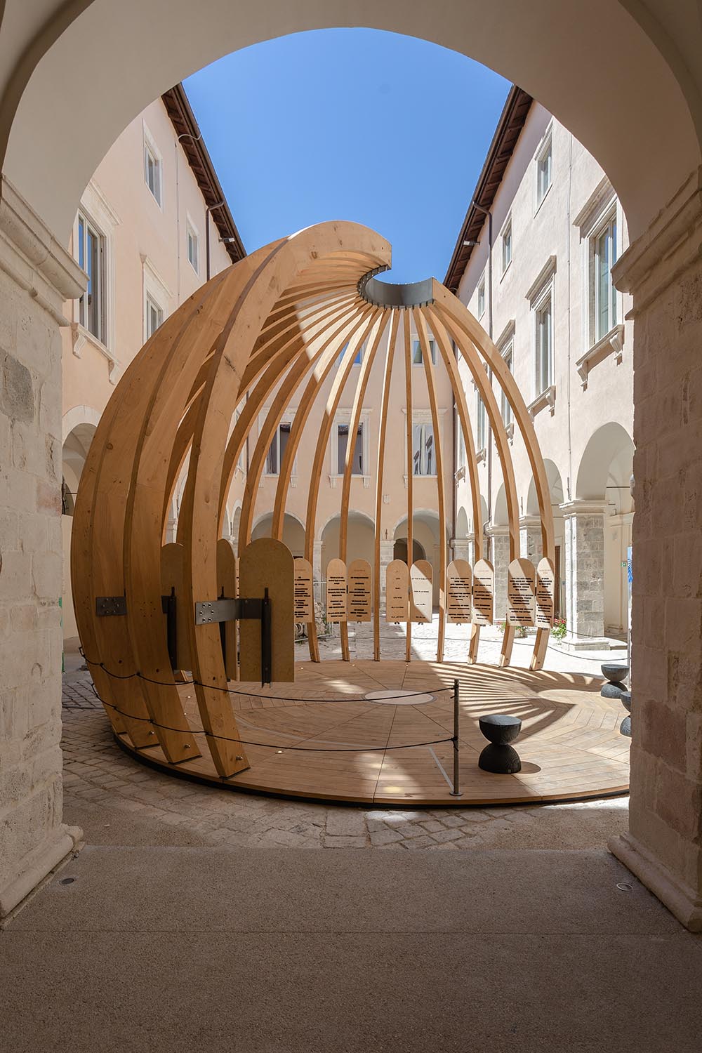 Successivamente, l’installazione è stata presentata come mostra itinerante: nel 2024 a L’Aquila, nel cortile di Palazzo Margherita, e nel 2025 a Scicli, presso il MACC Museo.