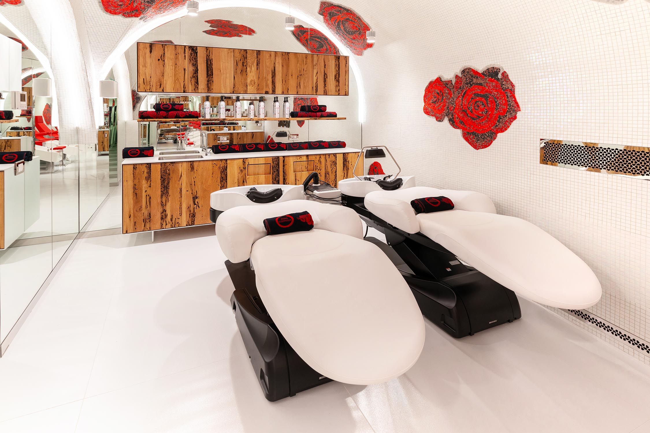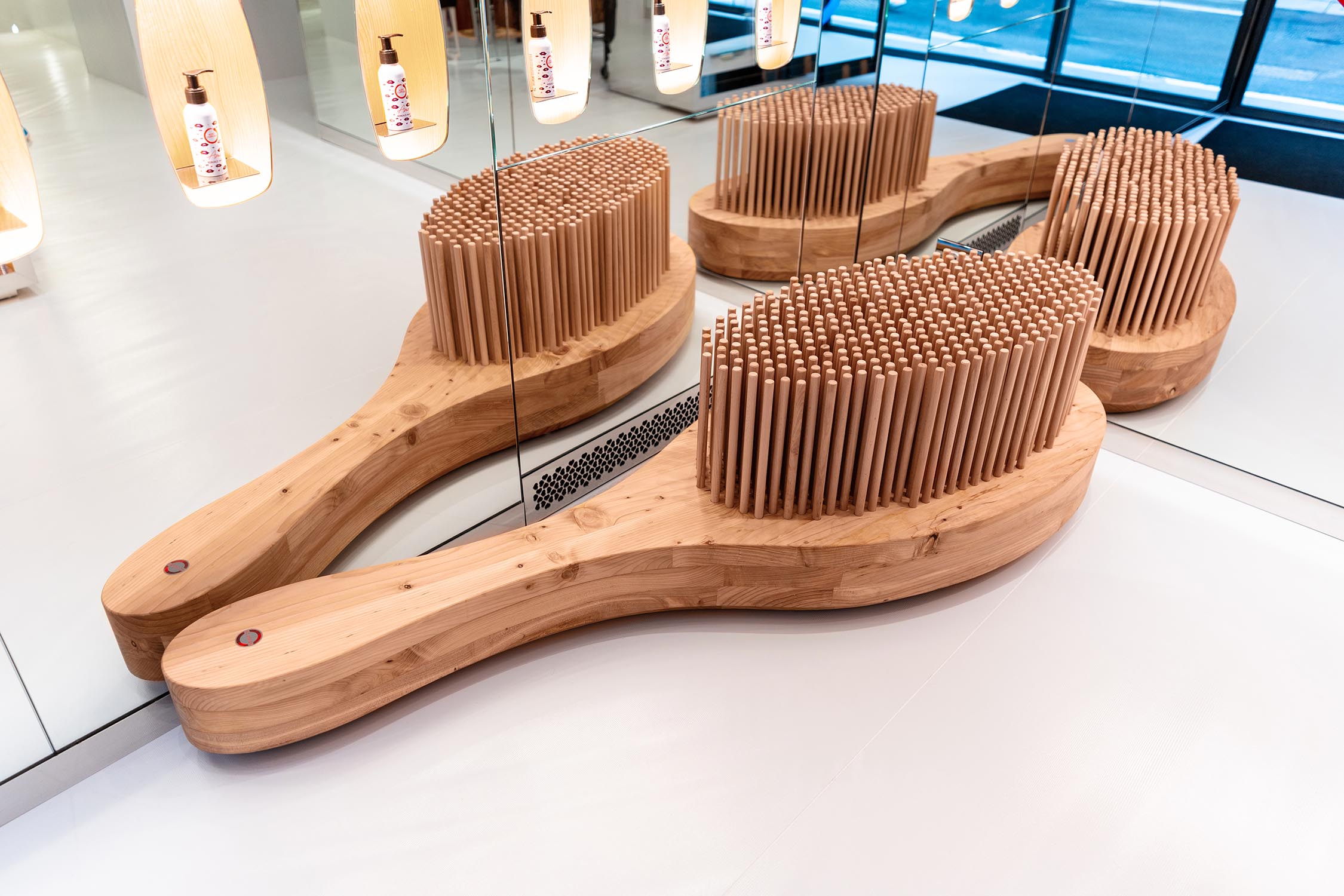 Gli arredi sono realizzati utilizzando materiali di recupero, come le Briccole di Venezia, pali della laguna dal forte valore simbolico e materico, e il cedro del Libano, apprezzato per il suo profumo caratteristico. Quest’ultimo è stato impiegato per la realizzazione di postazioni di lavoro con specchiere BEKKUCCIO, divanetti d’attesa a forma di spazzola AUDREY, ispirati all’iconica spazzola Aldo Coppola, le nuove poltrone KOMODA, che uniscono design e comfort, e il mobile guardaroba LA PETTINEUSE, un grande pettine porta abiti.