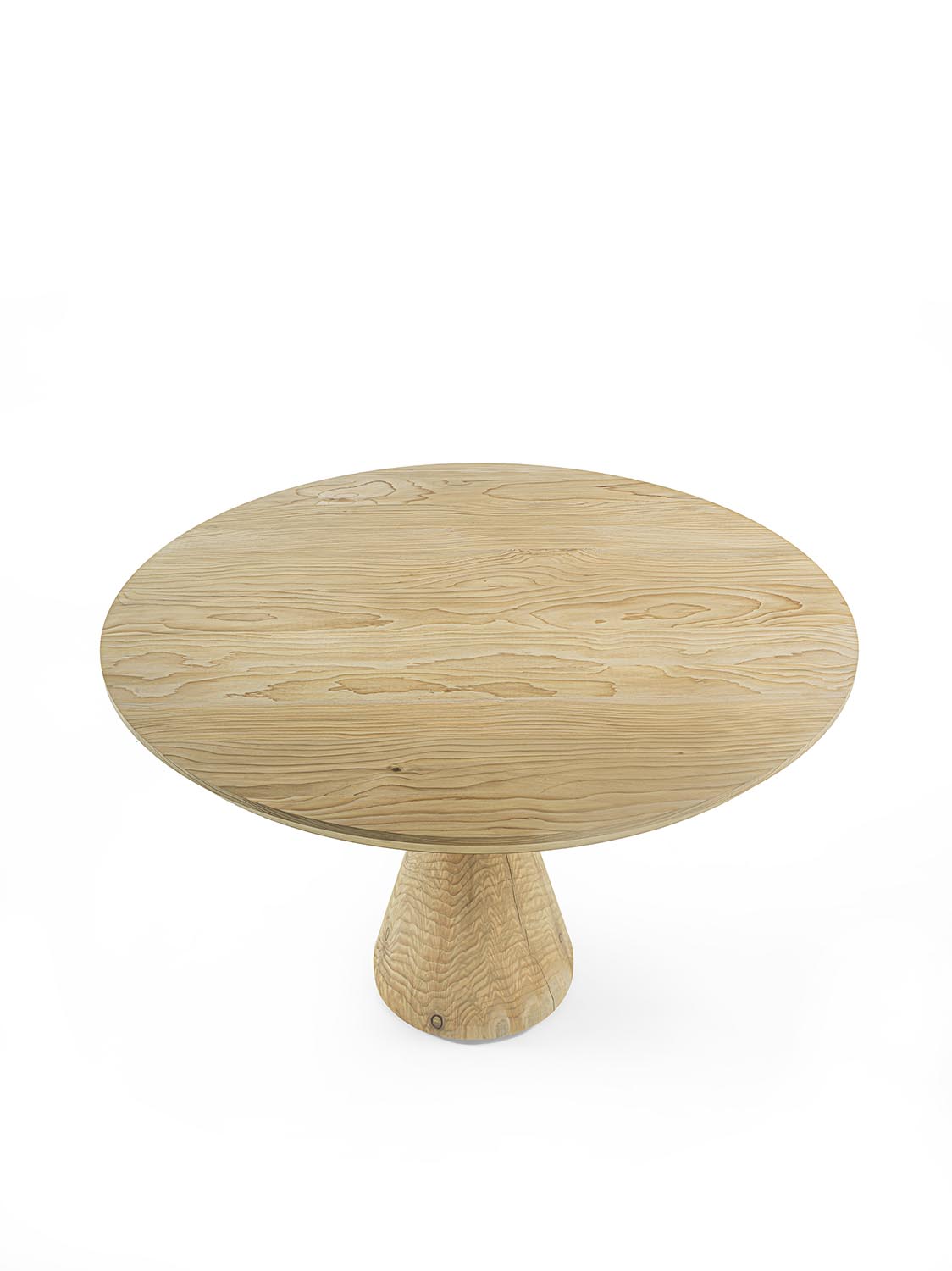 Стол со столешницей из массива кедра. Основание, также выполненное из массива кедра и вырезанное из цельного блока, представляет собой два противоположных конуса, перевернутых относительно друг друга, что создает игру контрастов и определяет скульптурную опору с сильным материальным и формальным воздействием.